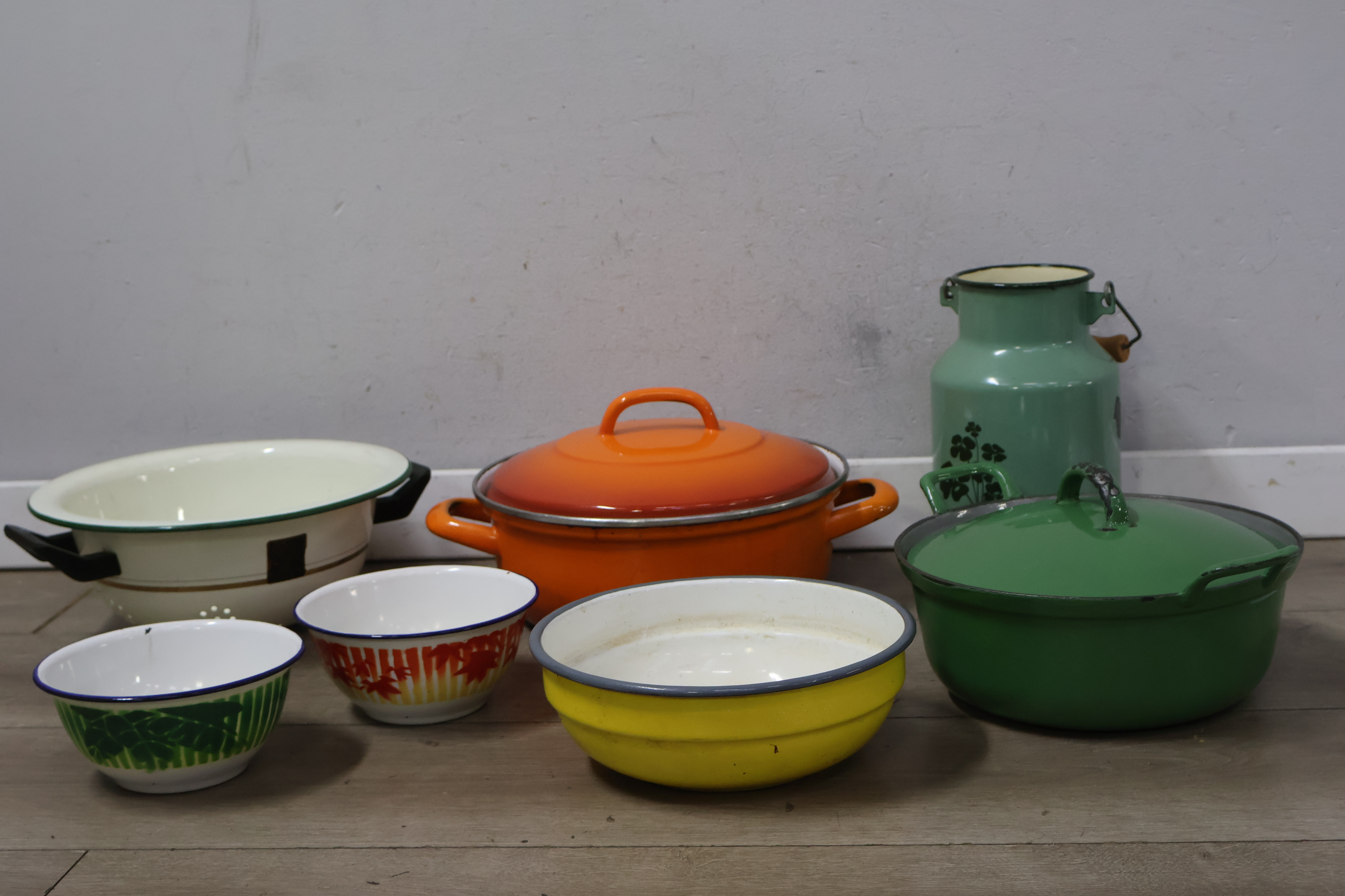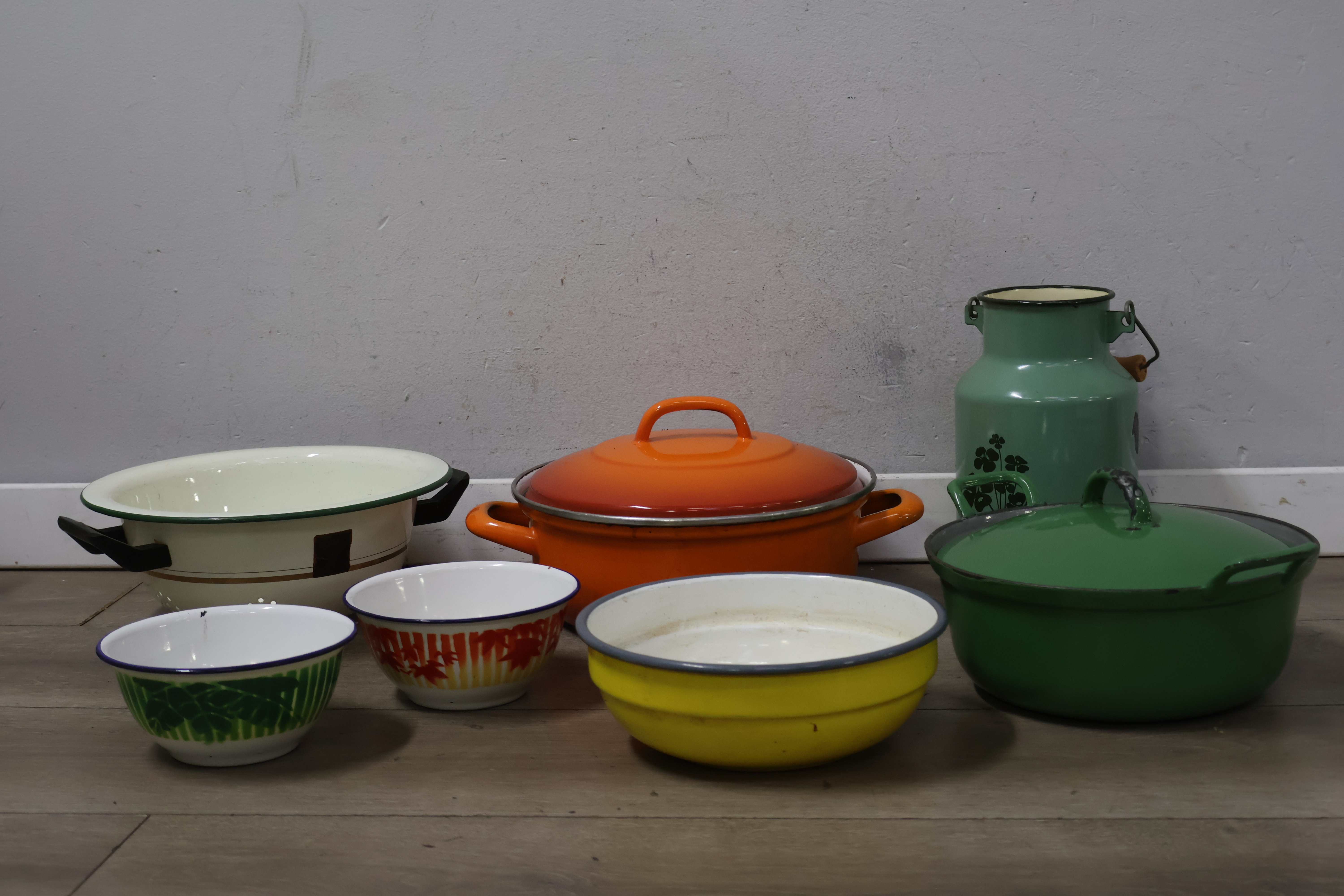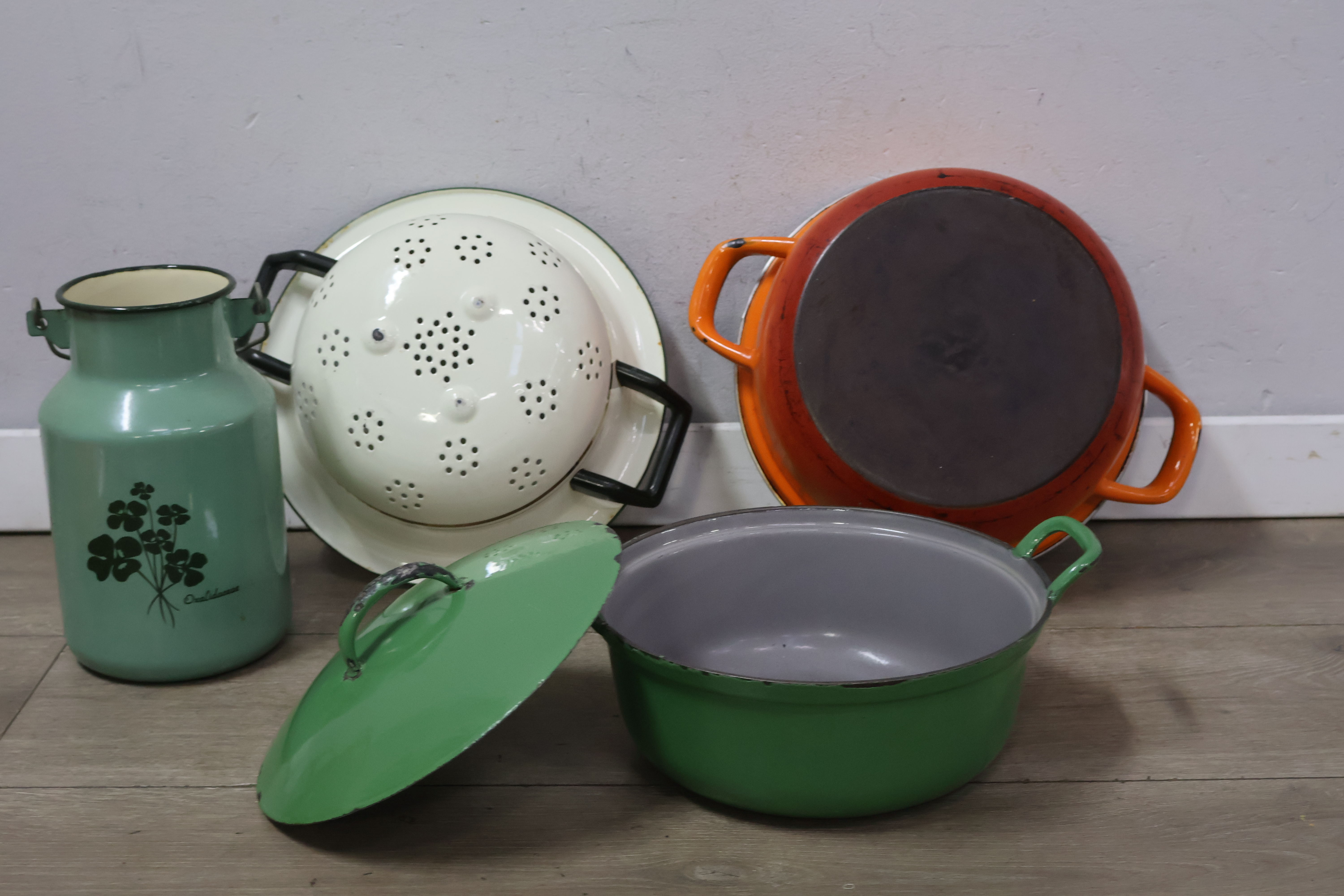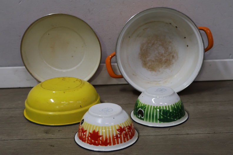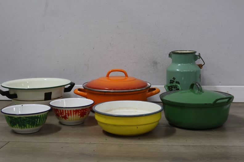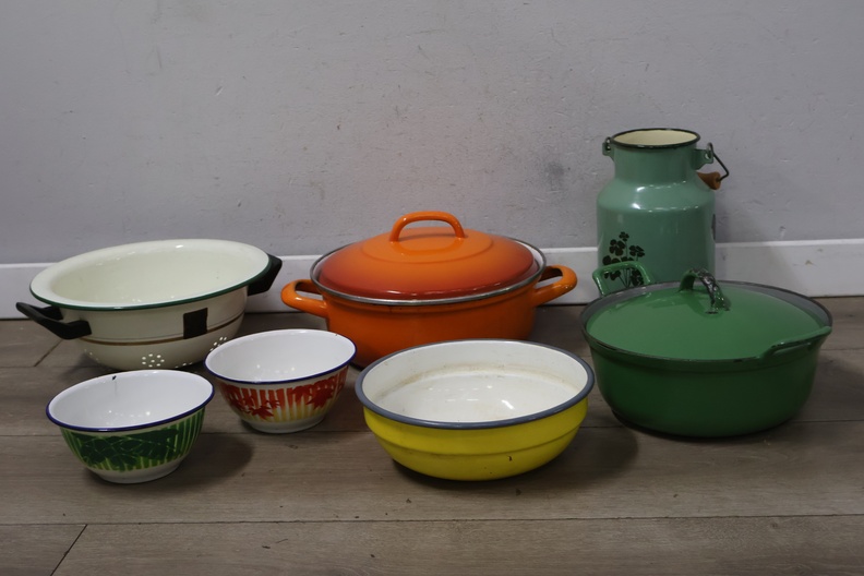 Vintage emaille braadpannen, kommen en melkbus