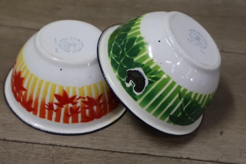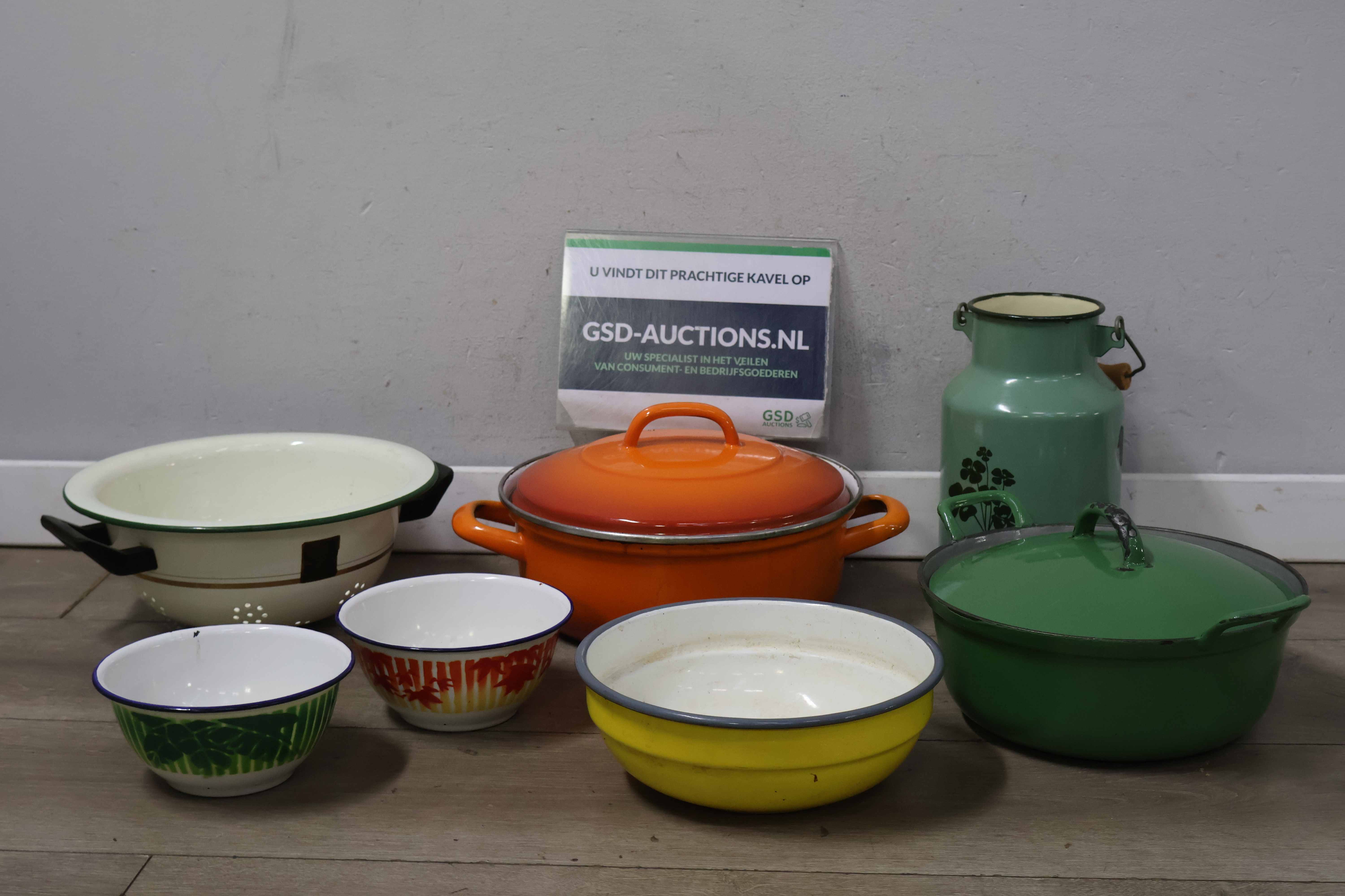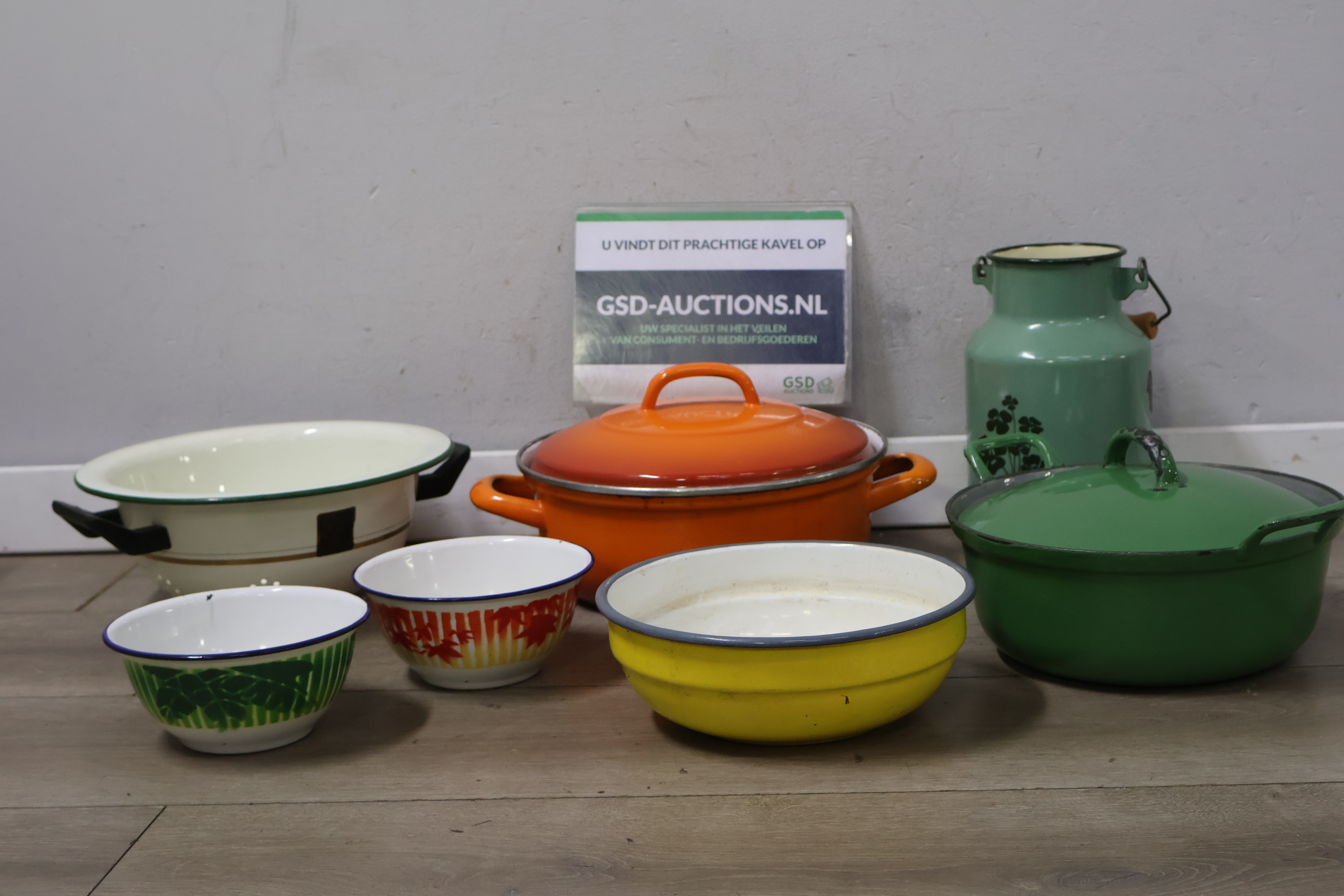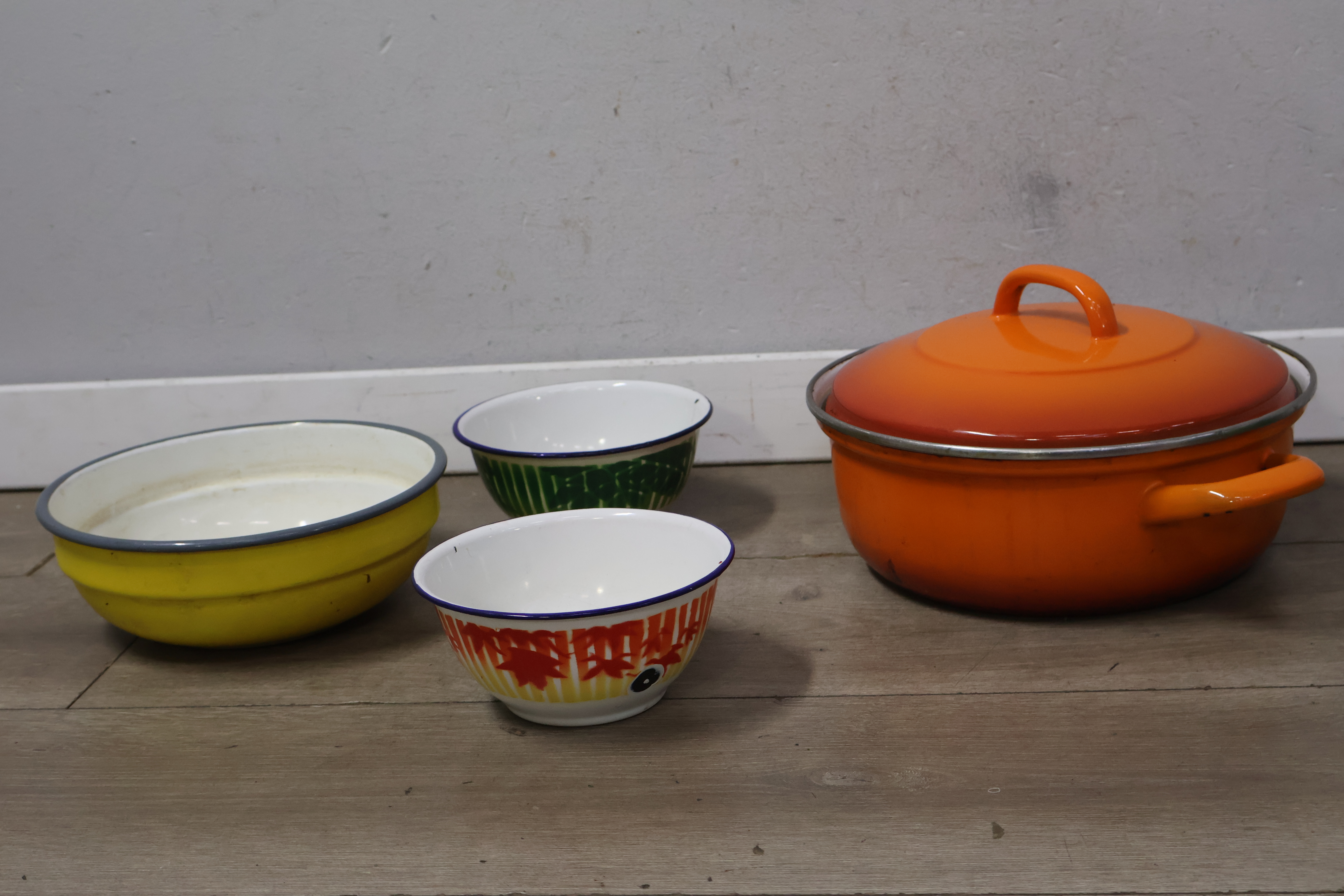 Vintage emaille braadpannen, kommen en melkbus