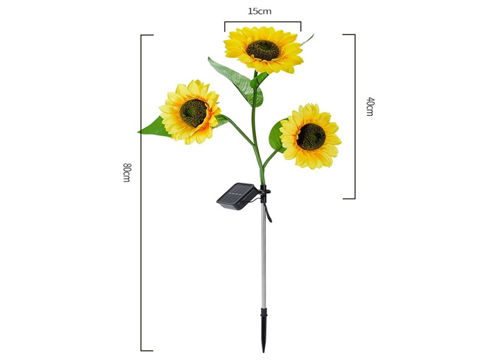 De tuinprikker met zonnebloem buitenverlichting werkt op solar basis (zonne-energie). De zonnebloem tuinverlichting bevat drie zonnebloem koppen. De verlichting bevat een silicium zonnepaneel plus een ingebouwde 600mAh oplaadbare batterij, die kan worden opgeladen zonder stopcontacten en/of draden. Wanneer de ingebouwde NiMH-batterij overdag voldoende zonne-energie opvangt, geeft de zonnebloem automatisch licht in het donker. Werkt zo'n 6 tot 13 uur!