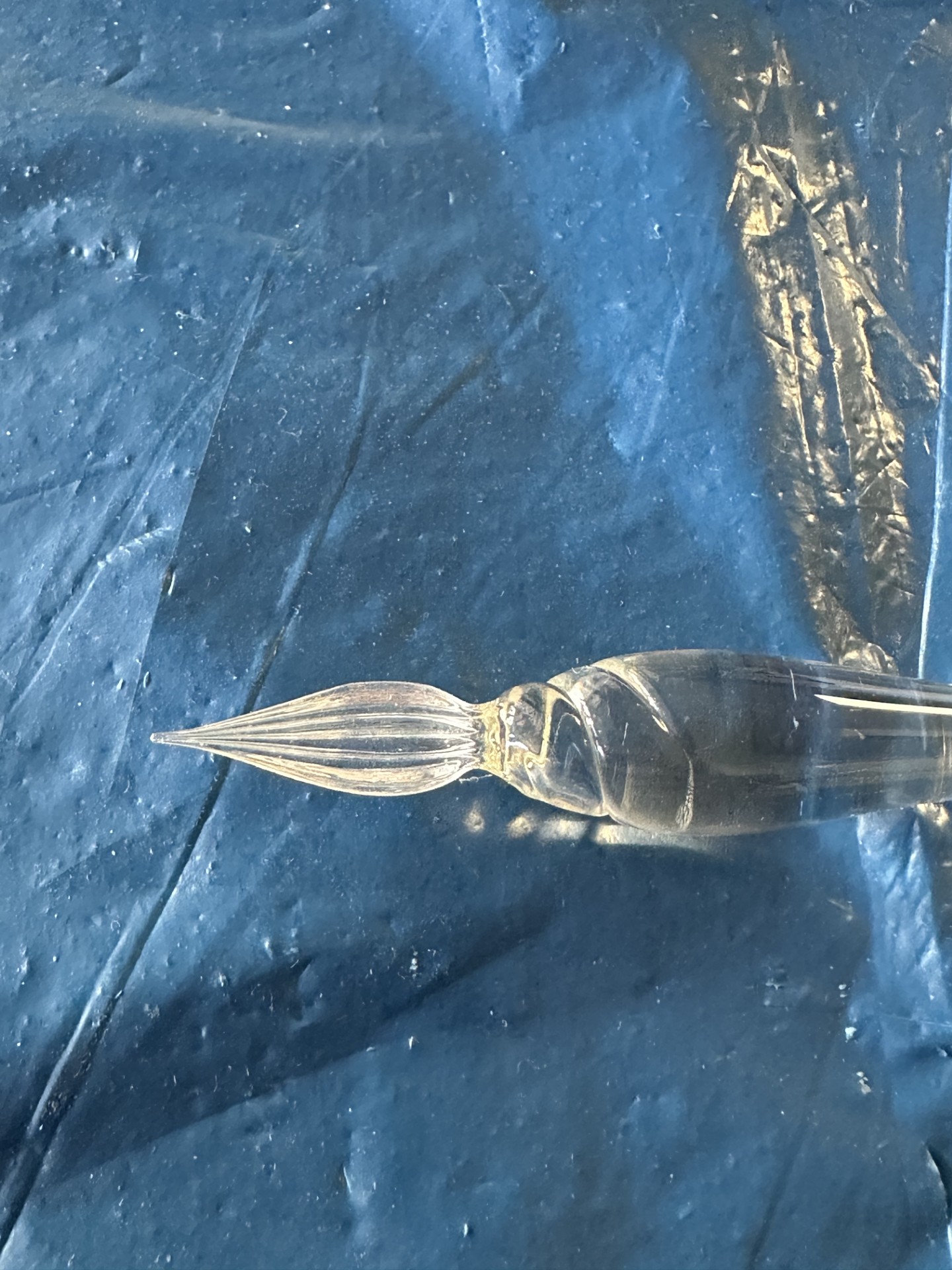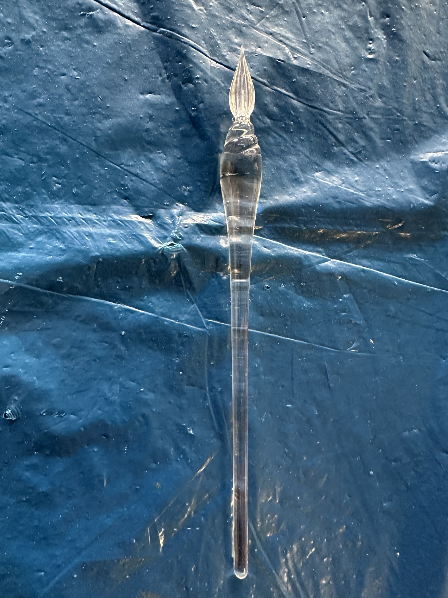 Deze pennen worden traditioneel met de hand van glas gemaakt, vaak in Italië (bijvoorbeeld in de stijl van Murano-glas). De punt heeft fijne groeven waardoor inkt wordt vastgehouden, zodat je ermee kunt schrijven zonder cartridge of vulling.