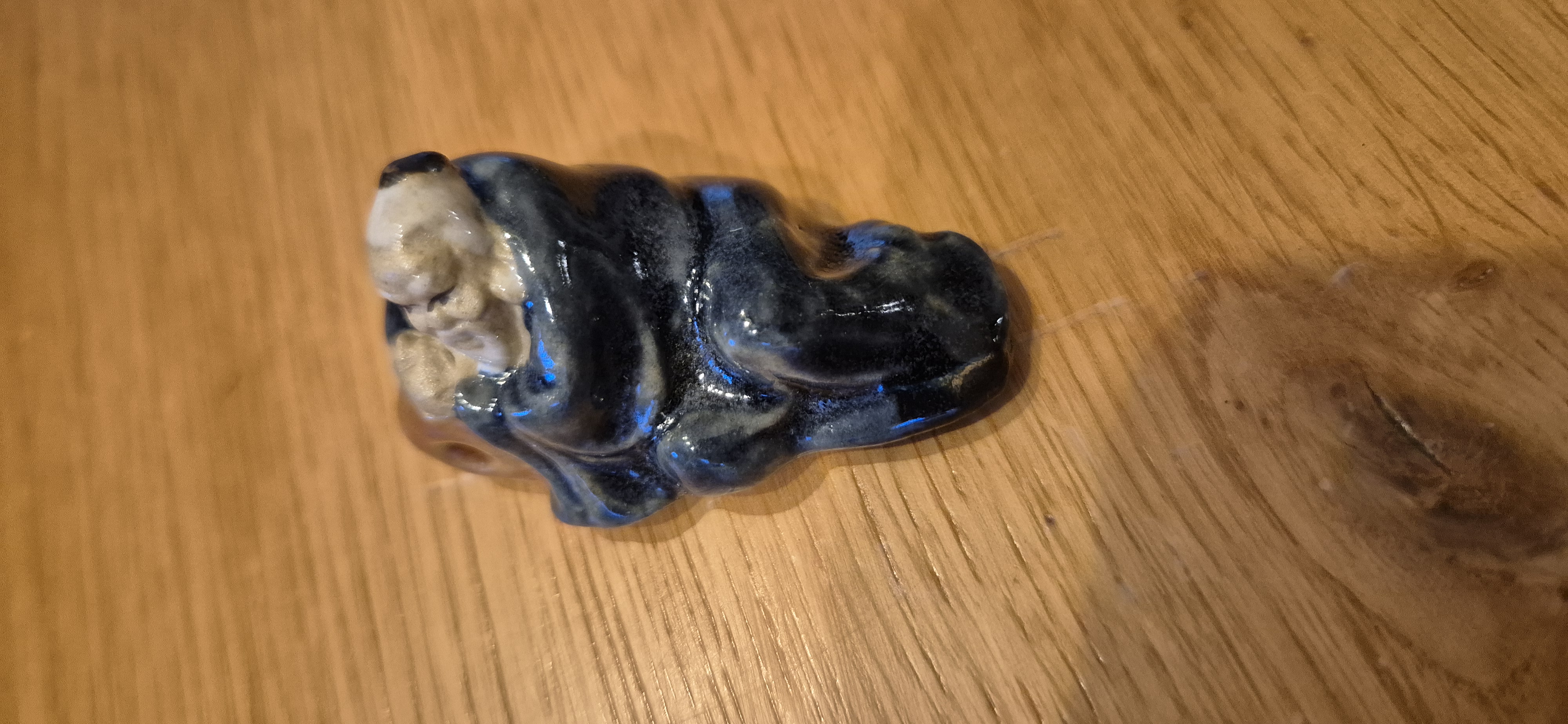 Dit is een klein, geglazuurd keramieken beeldje van een oude wijze man, waarschijnlijk een Chinese geluks- of wijsheidsfiguur.