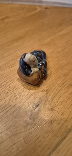 - Kenmerken: De figuur is afgebeeld in een rusthouding, gekleed in een blauwe mantel.