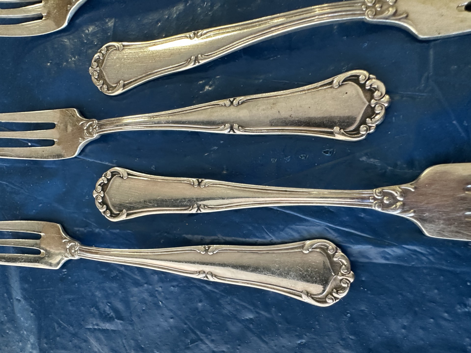 Mooie set van 10 vintage gebaksvorkjes met een klassiek sierlijk handvat. De vorkjes hebben een elegante vorm met decoratieve details aan het uiteinde van het handvat. Ideaal voor taart, gebak of dessert en passend bij een klassiek of vintage servies.