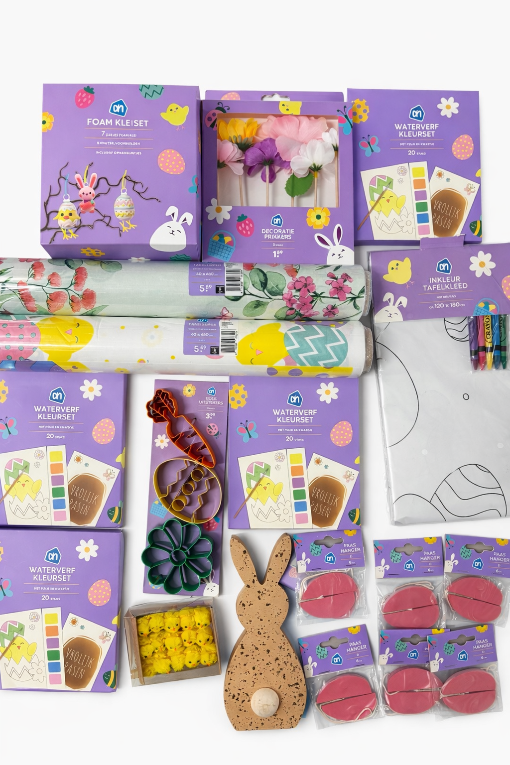 Aangeboden: grote partij Paasartikelen en knutselsets, grotendeels van Albert Heijn. Alle items zijn nieuw in verpakking en ideaal voor decoratie, knutselen met kinderen of wederverkoop.