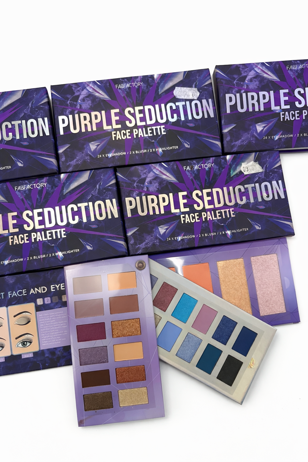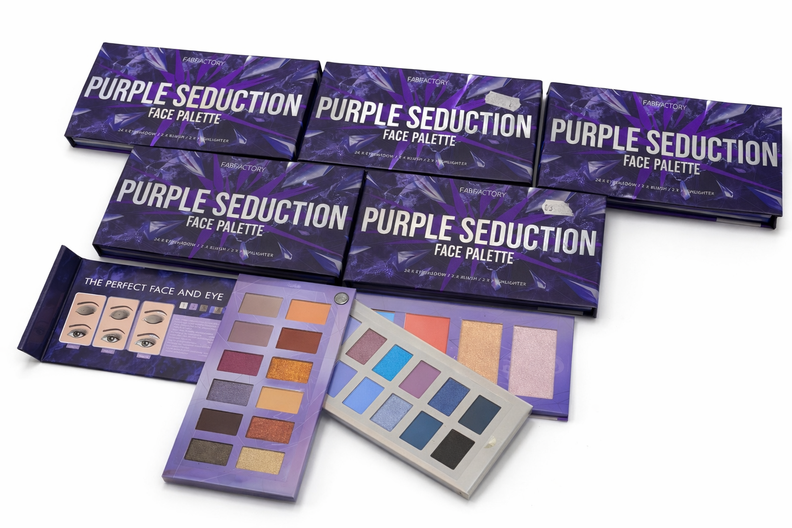 Aangeboden: partij van 6 Purple Seduction Face Palettes. Elke verpakking bevat 3 panelen met diverse make-up producten, waaronder oogschaduw, blush en highlighter. Ideaal voor make-up liefhebbers of wederverkoop.