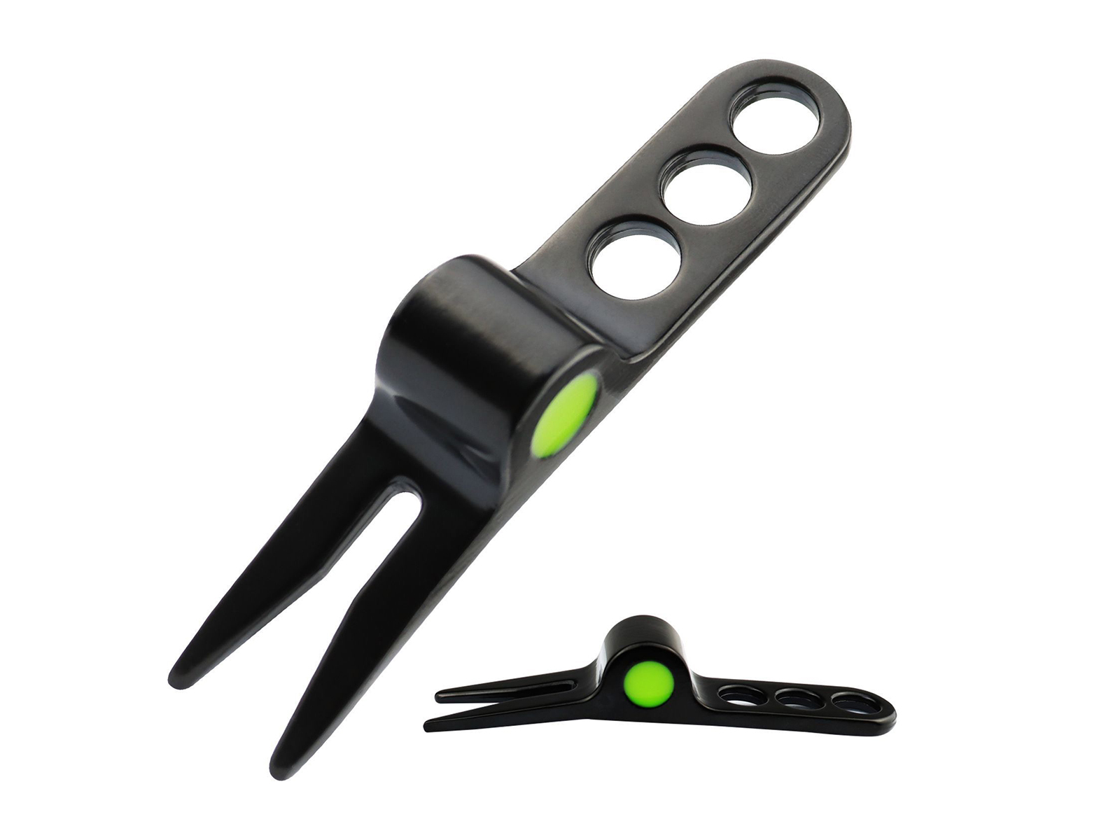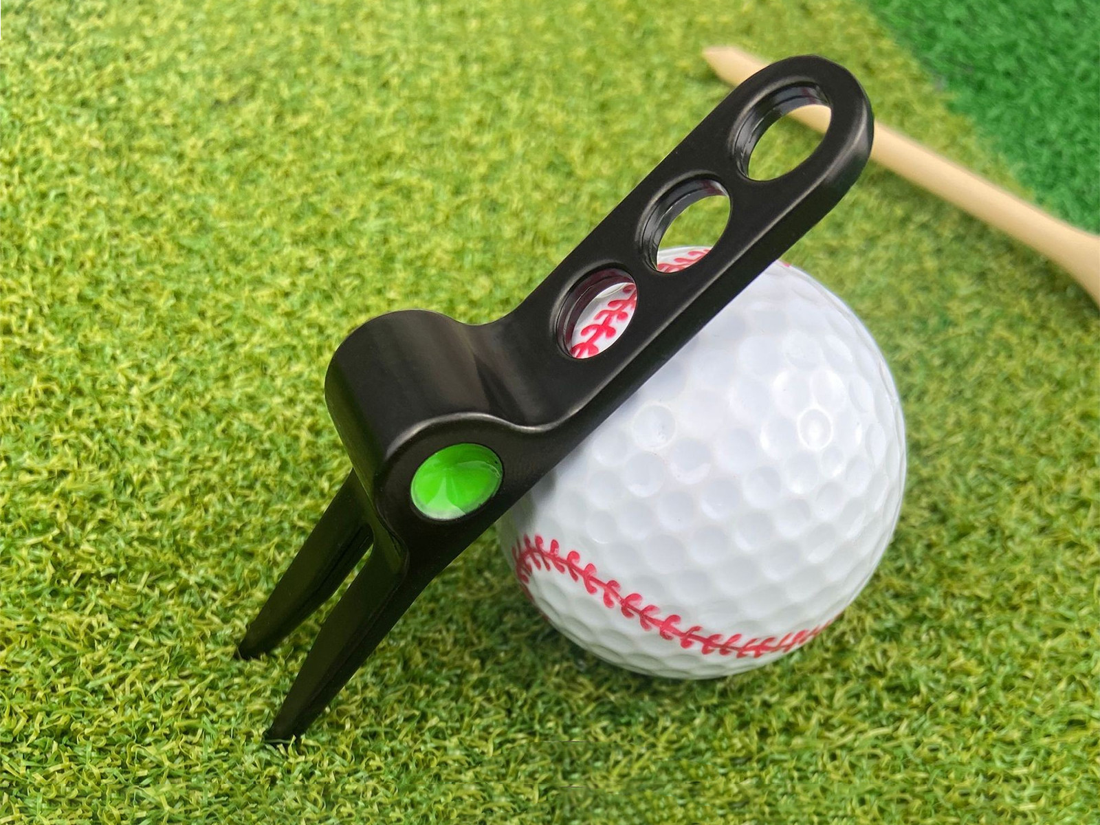 Super eenvoudig in gebruik; maak het gras plat en draai het omhoog om de marker op de green te bevestigen. Het driedraai-ontwerp in de handgreep zorgt voor uitstekende grip bij het repareren van grassporen. Door het kleine formaat is de pitchfork (herstelgereedschap voor golf) gemakkelijk mee te nemen. Je kunt het dus gebruiken om de grasmat te repareren en de positie van de bal te markeren. Multifunctioneel!