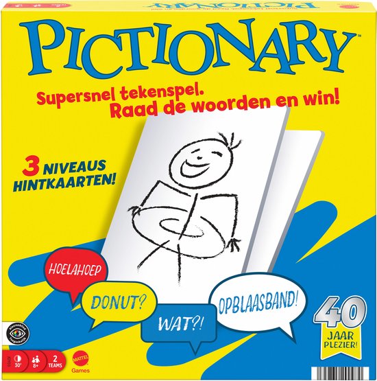 Pictionary is het klassieke bordspel voor het hele gezin met snelle schetsen en hilarische pogingen om het woord te raden! In dit buitensporig leuke spel voor gezellige spelers spelen teams om de beurt. Een speler van het team maakt een schets en de anderen moeten raden welk woord of begrip wordt bedoeld. Je kunt kiezen uit 3 niveaus hintkaarten, dus ook jongere spelers kunnen meedoen. Je hoeft geen kunstenaar te zijn en het hele raadgebeuren is vaak nog hilarischer dan de schetsen!