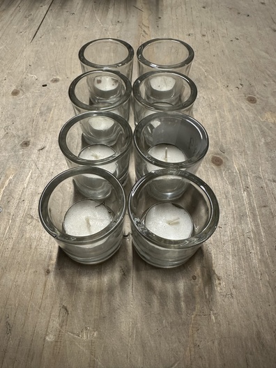 8 waxinelichtjes in glazen potjes.