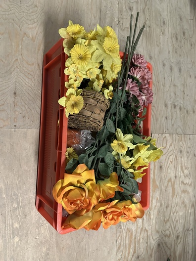 een krat vol diverse nepbloemen met diverse kleuren en afmetingen.