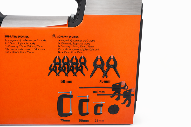 De klemset (16-delig) bevat verschillende soorten klemmen en lijmklemmen in diverse maten, handig voor het vastzetten van materialen tijdens het werken.