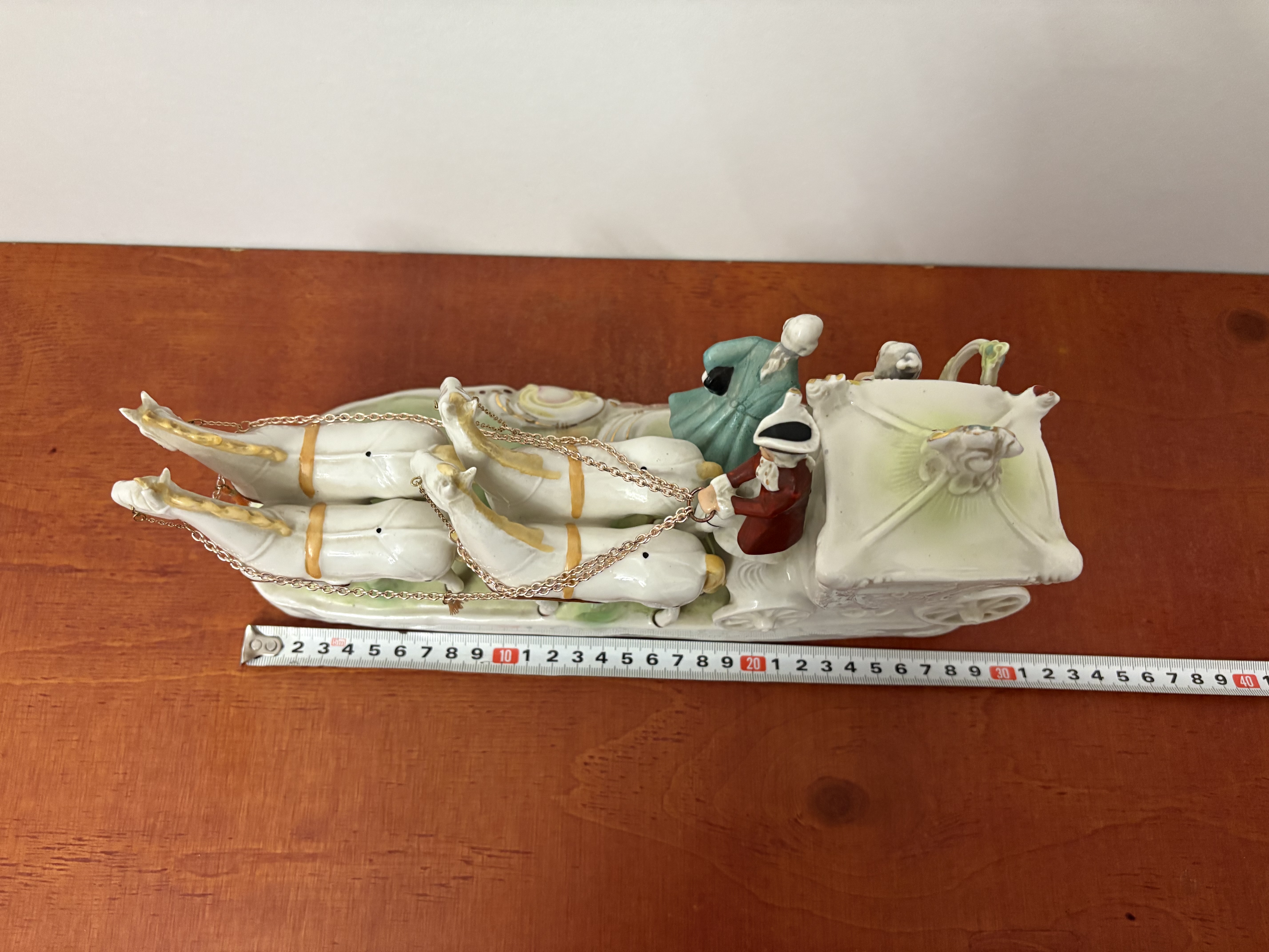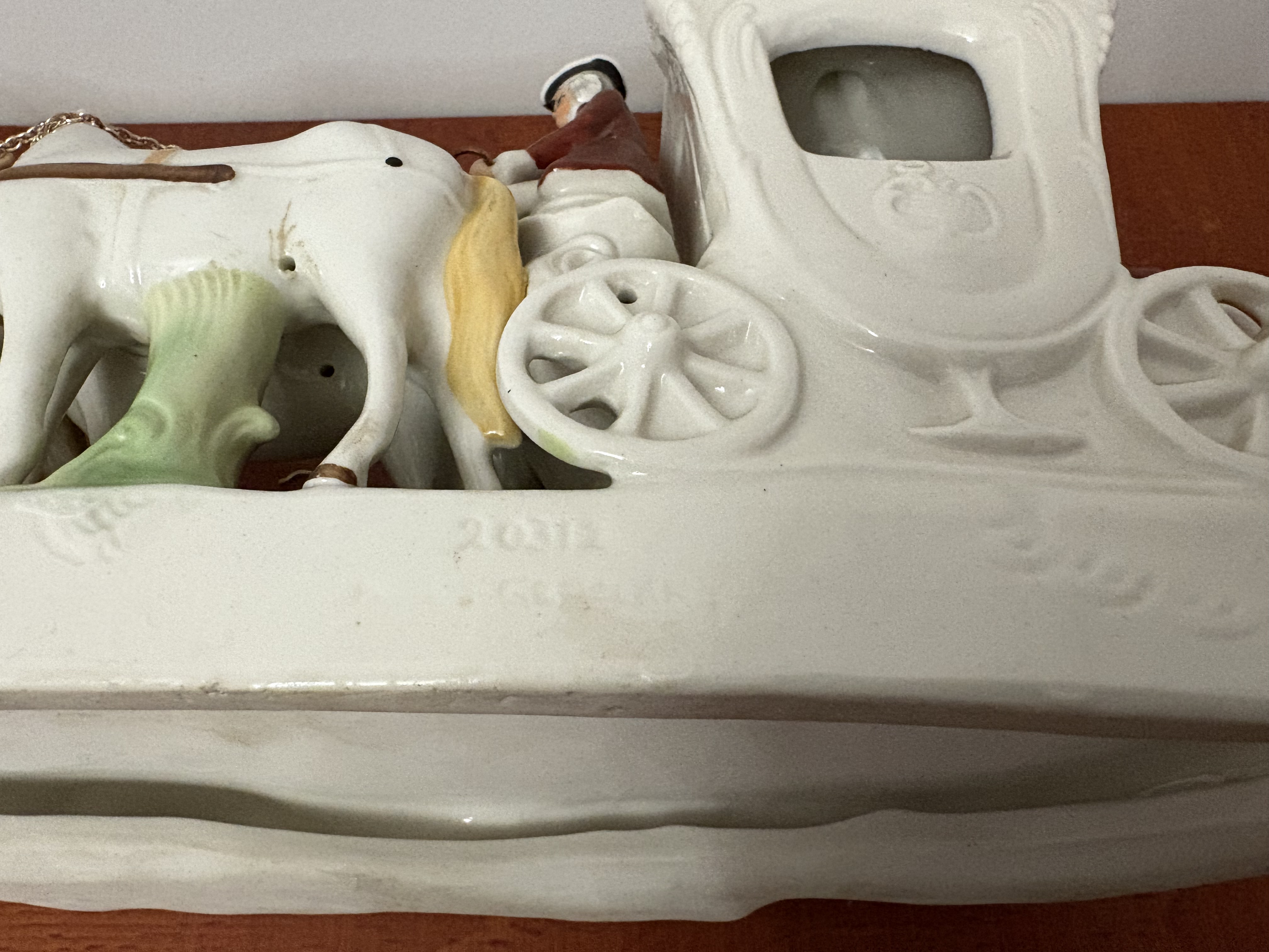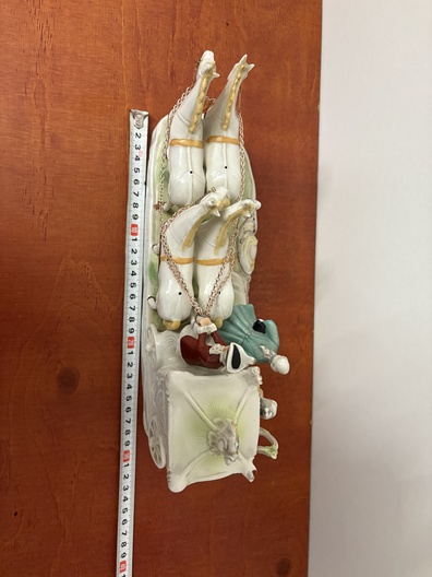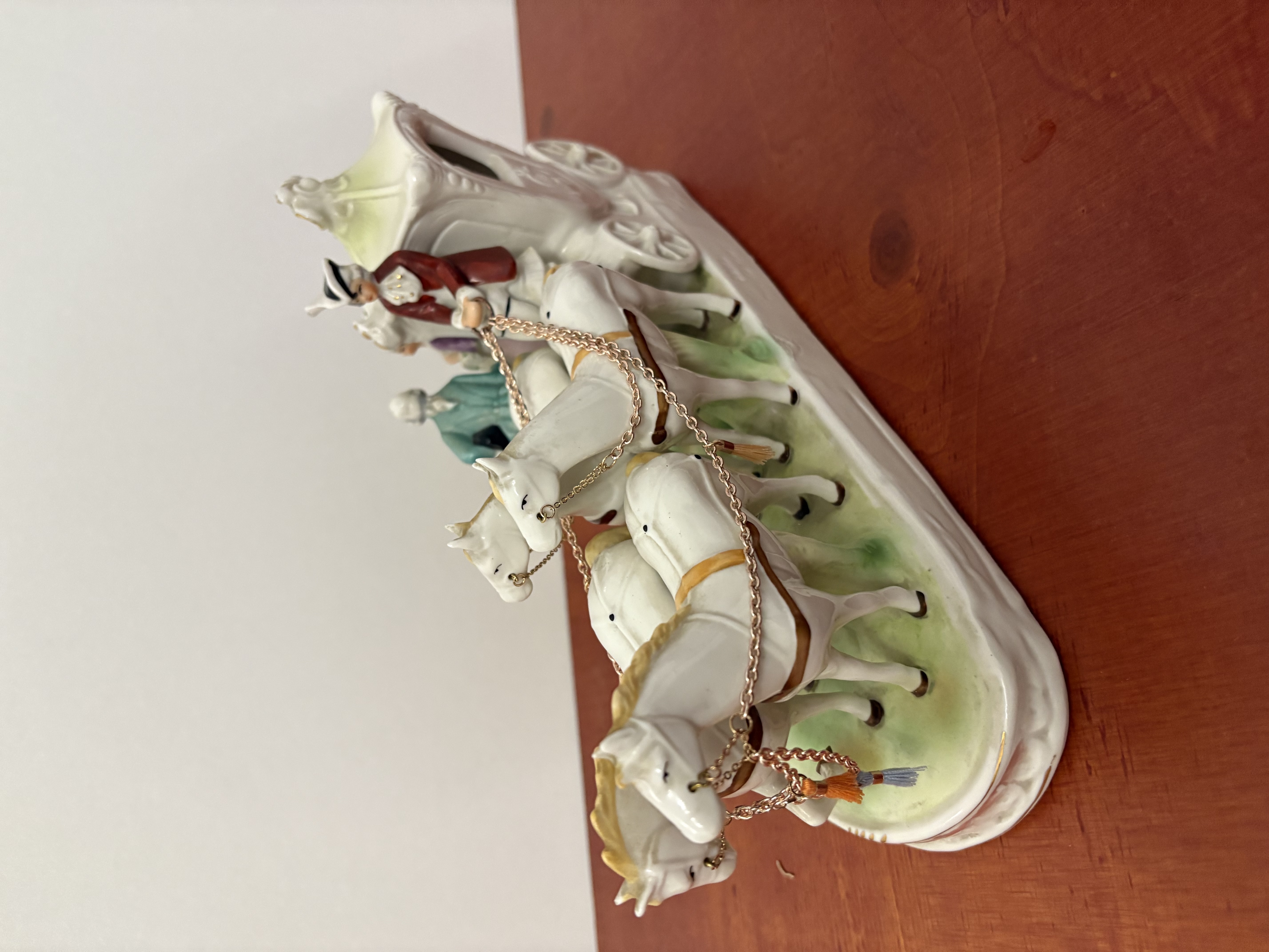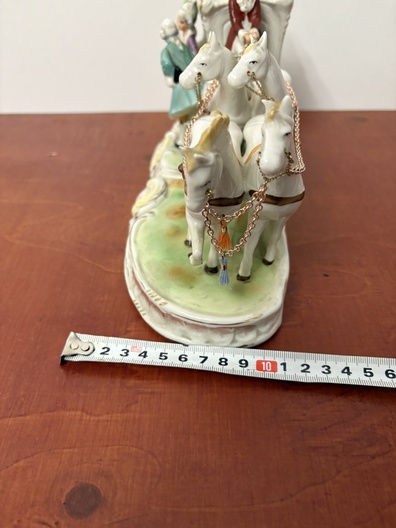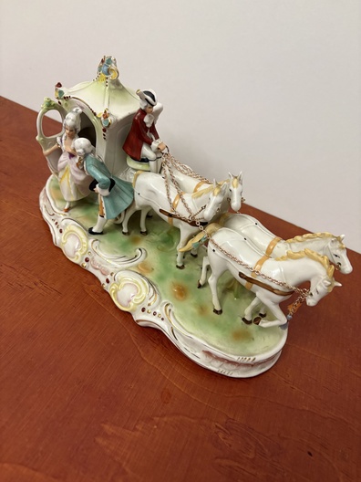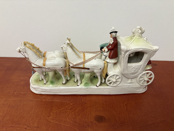 Een porseleinen Paardenkoets met figuren In koloniale kleding.