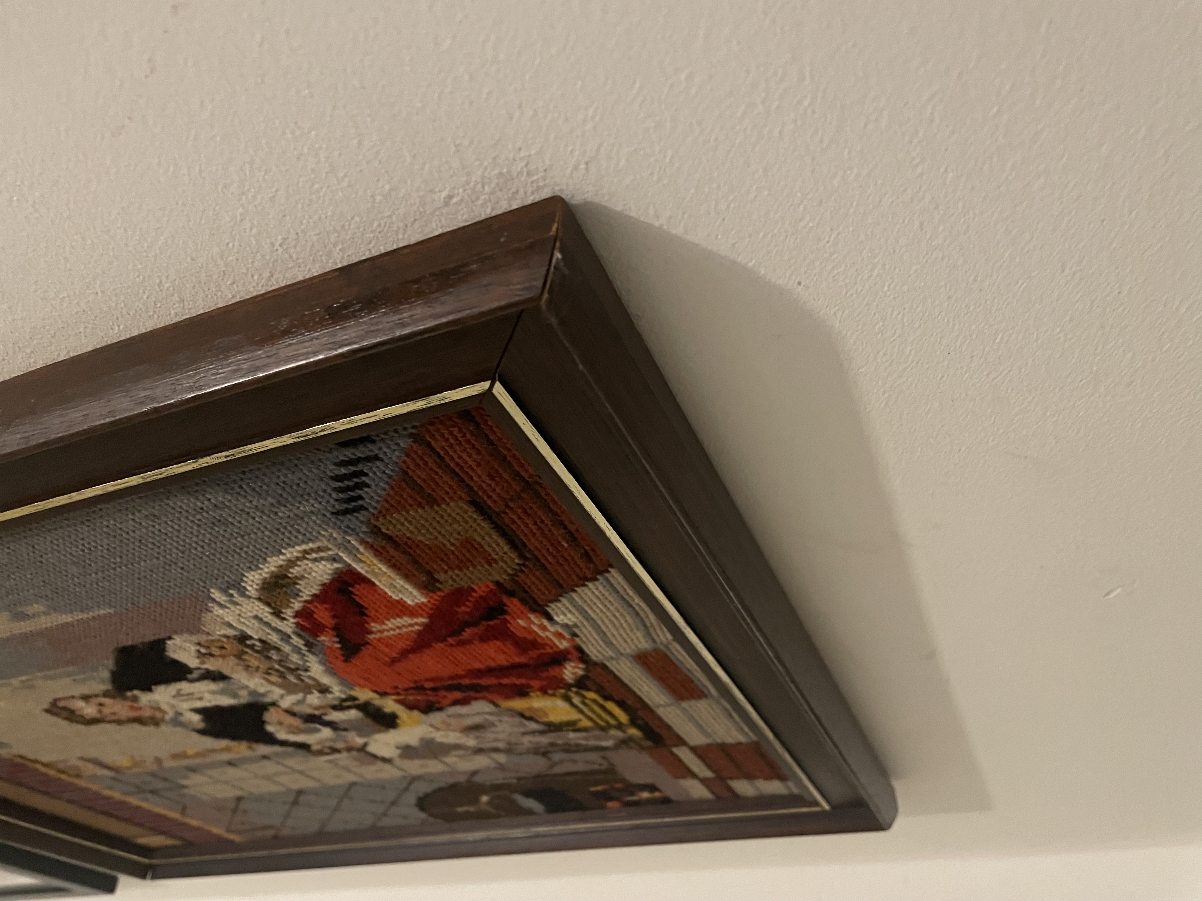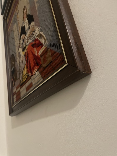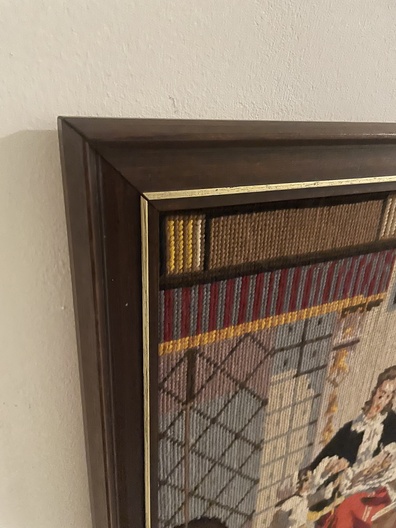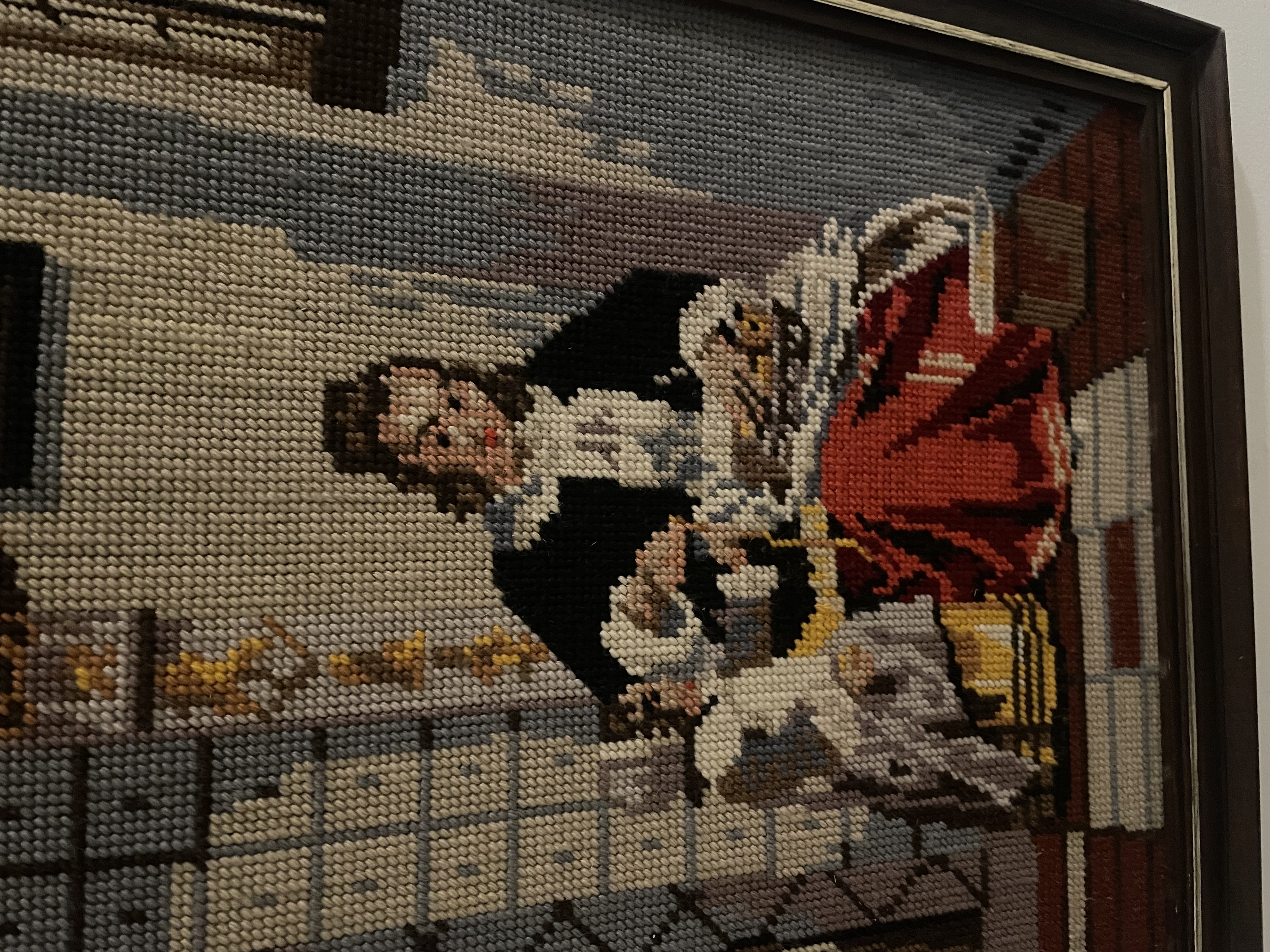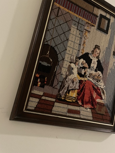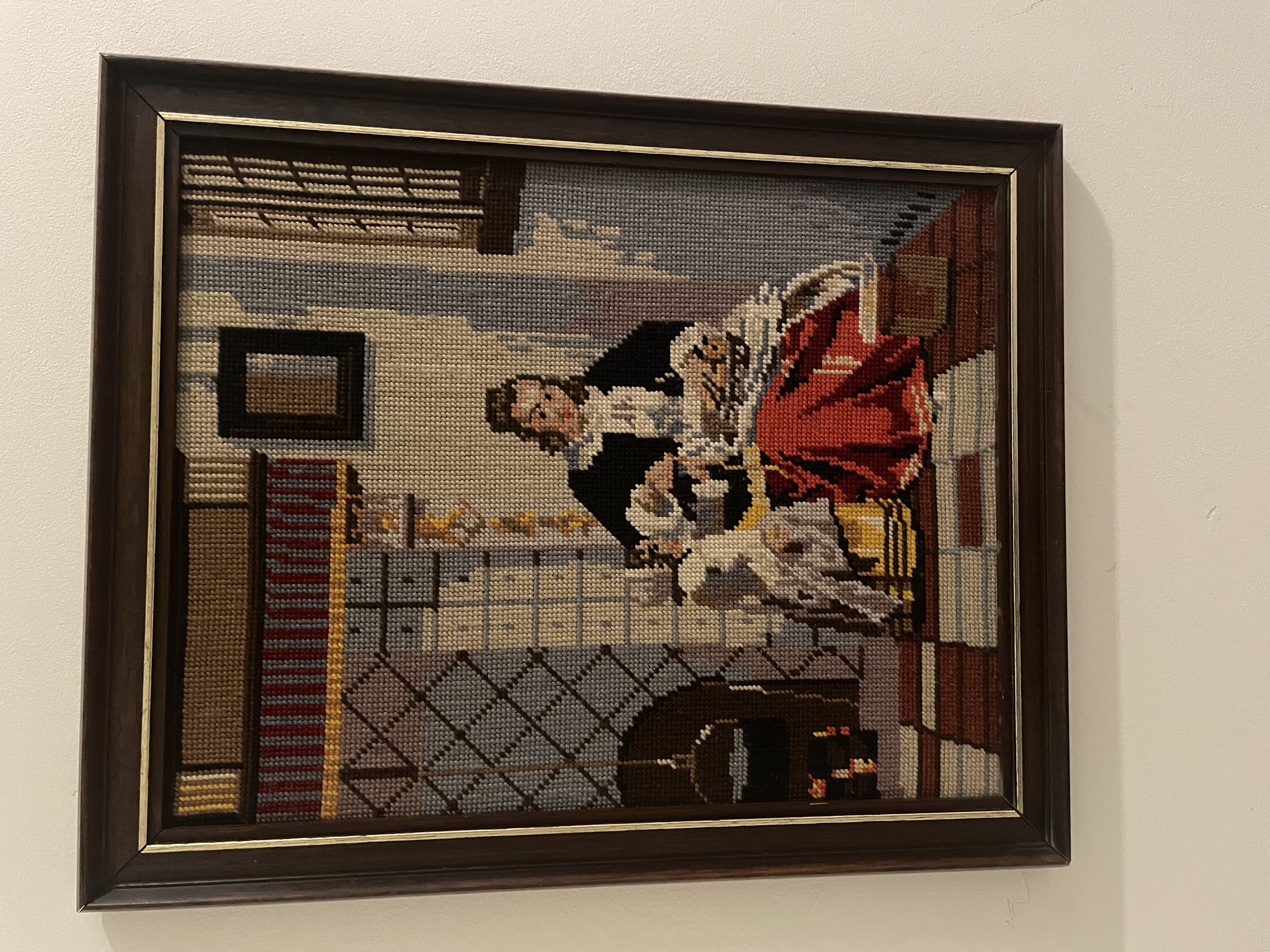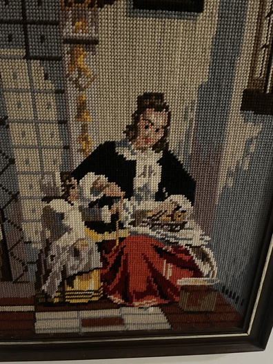 Ingelijst borduurwerk: vrouw met rode rok