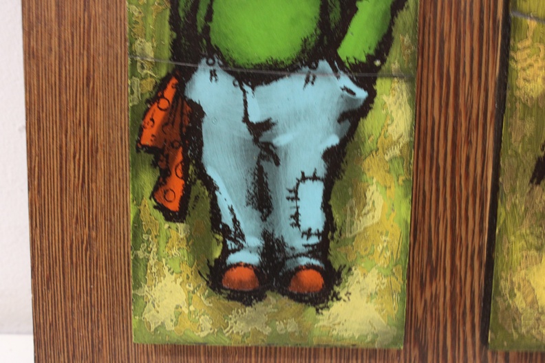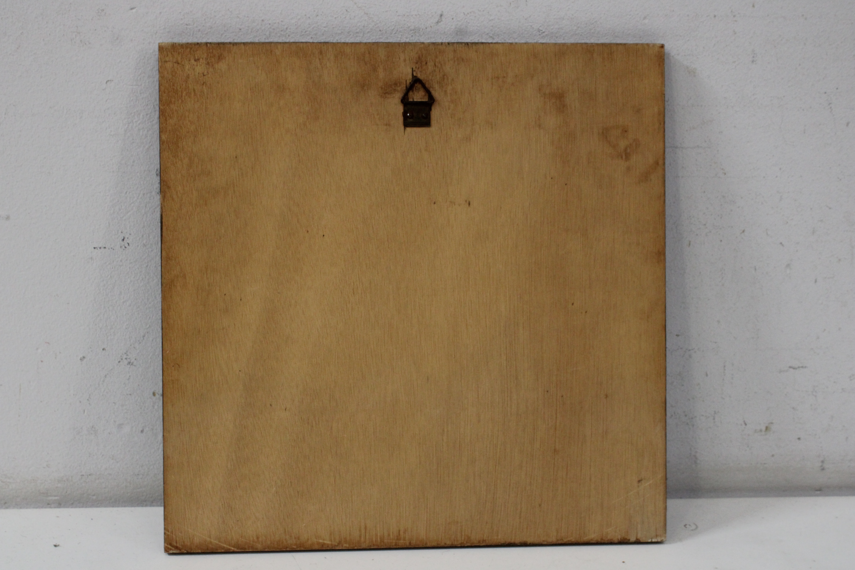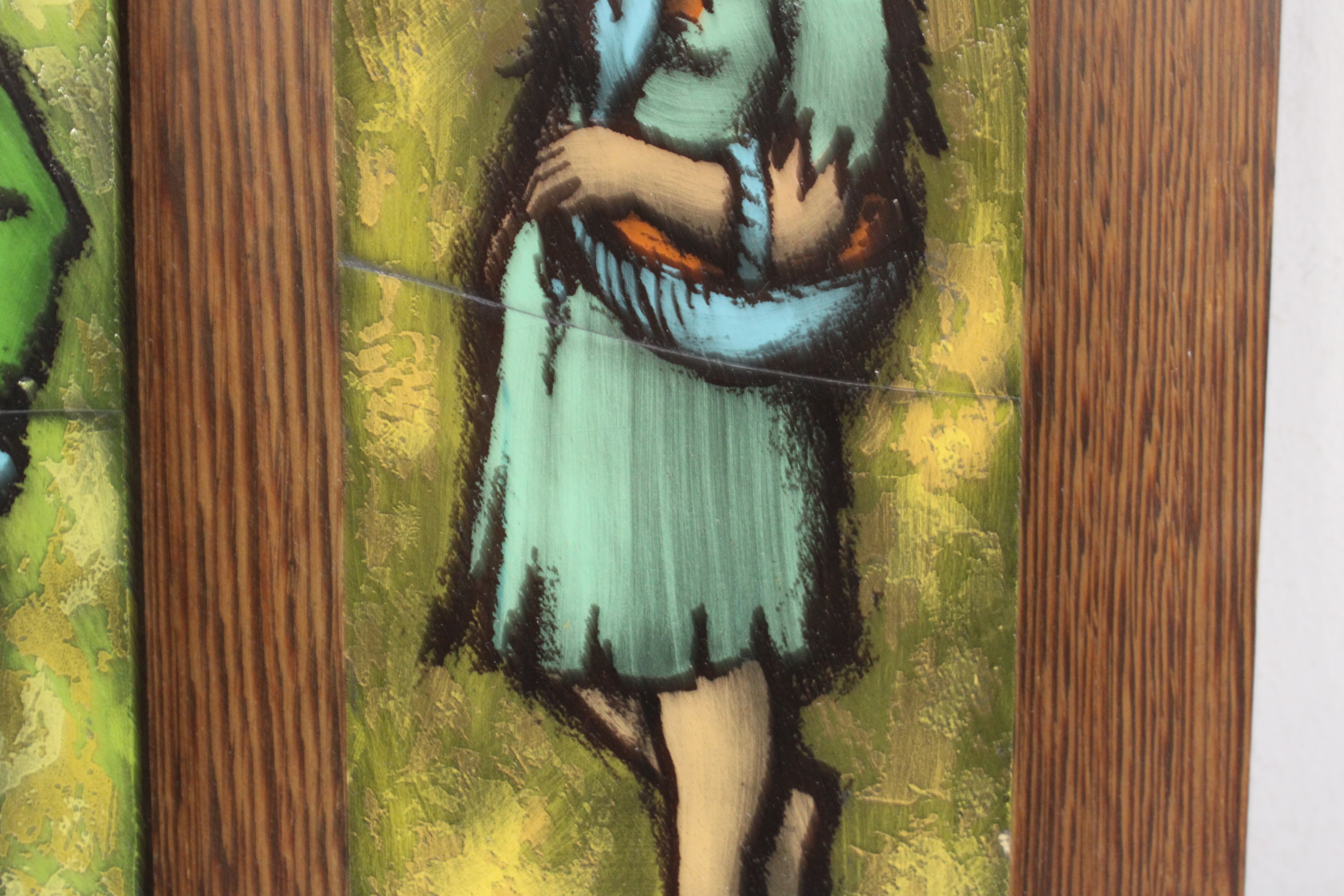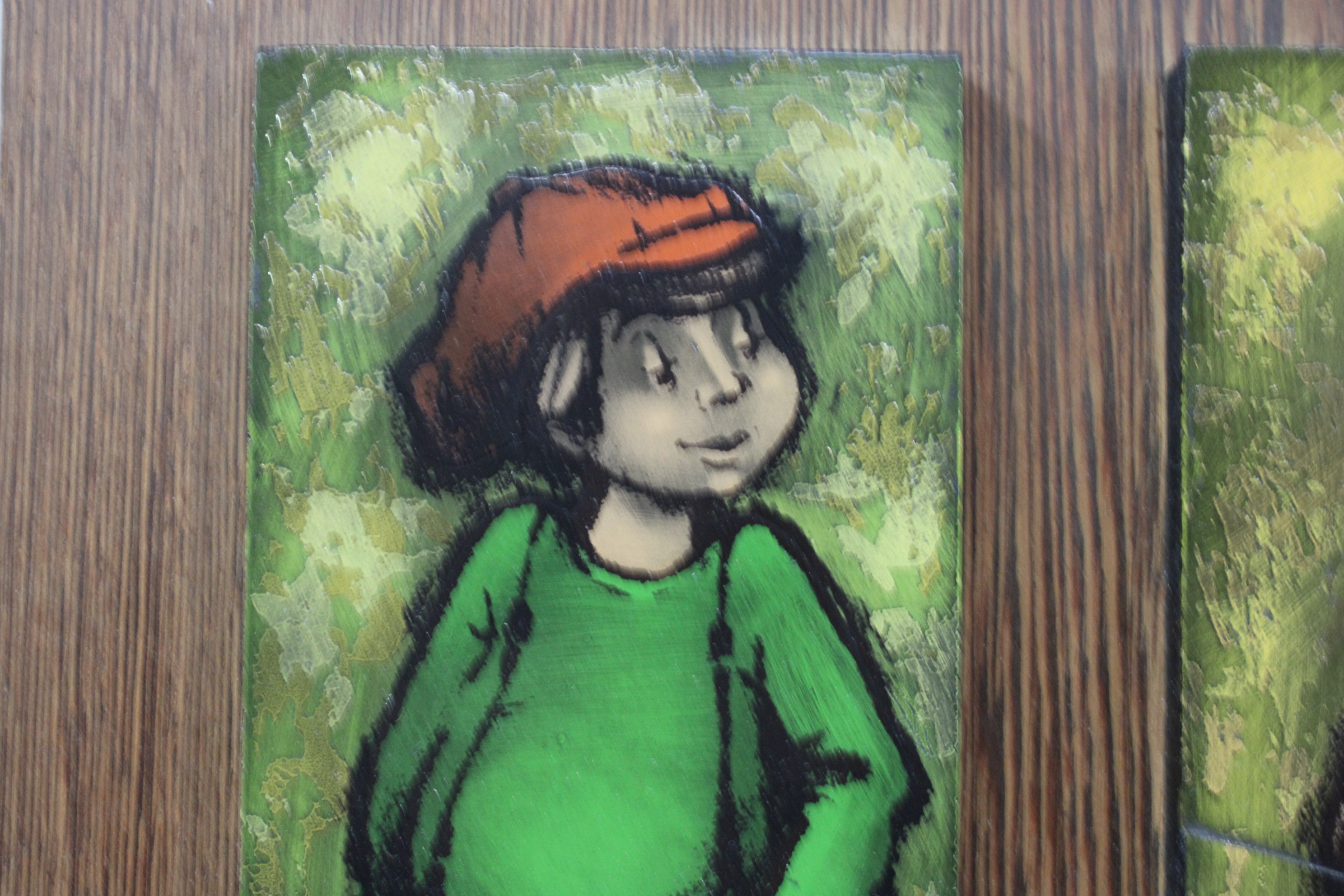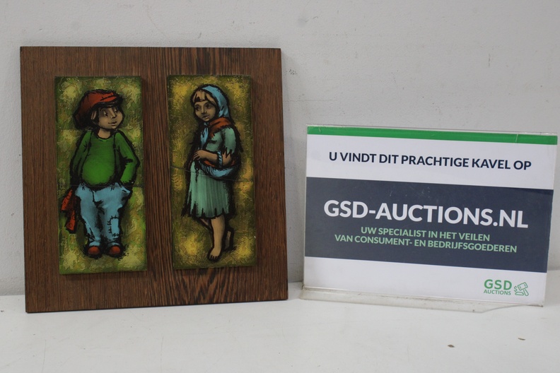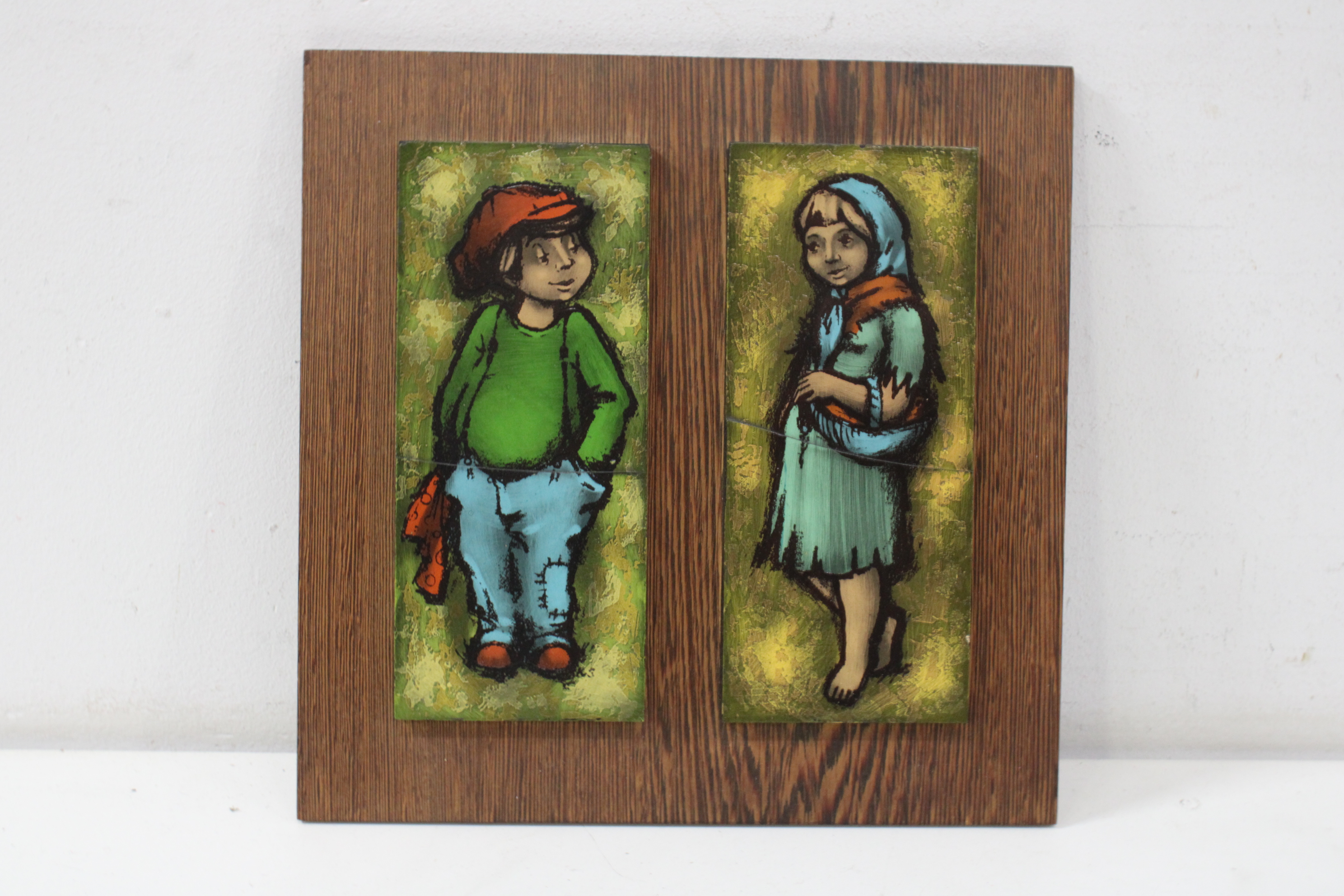 Vintage Kunststegels van 2 kinderen op houten plankje'