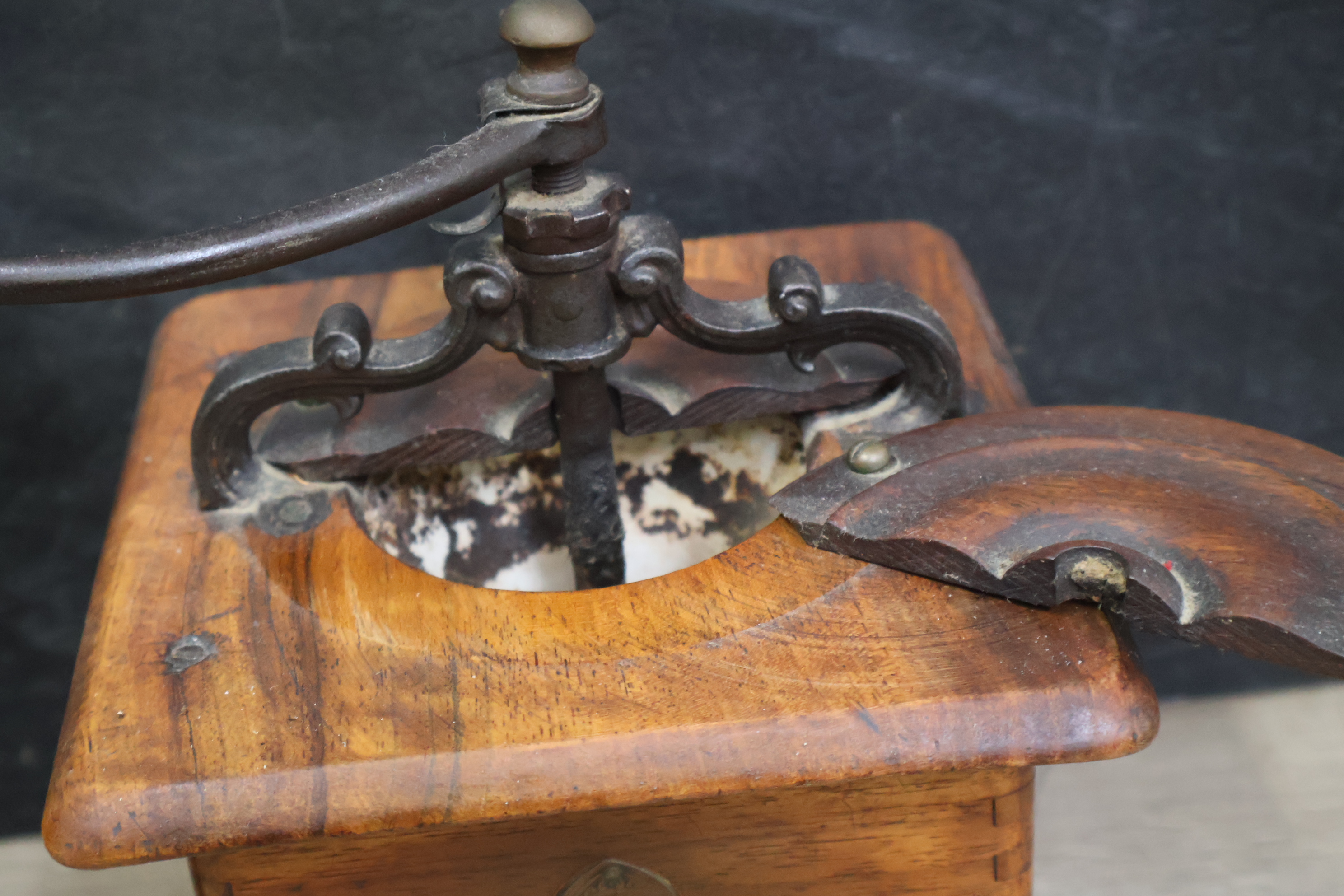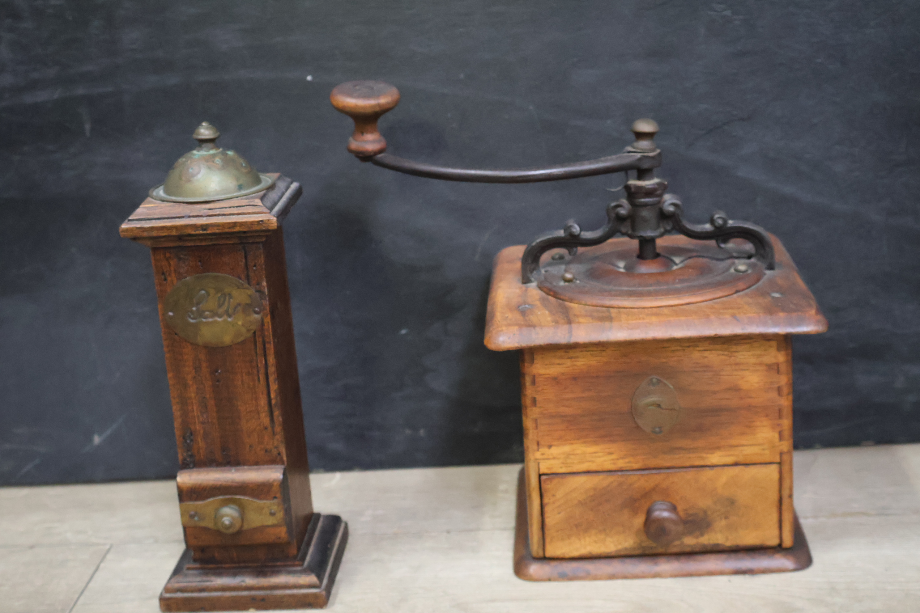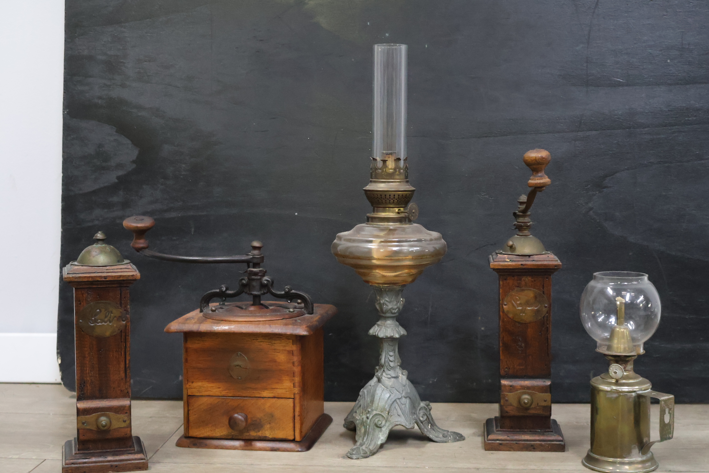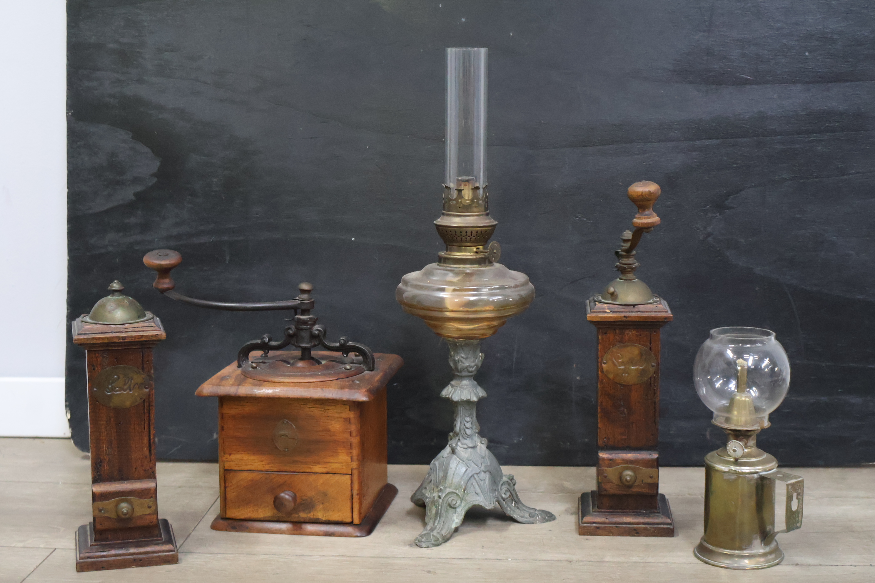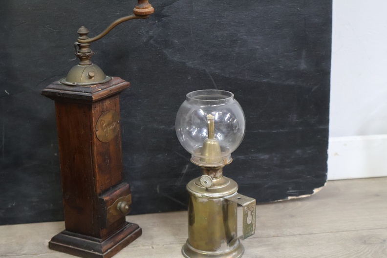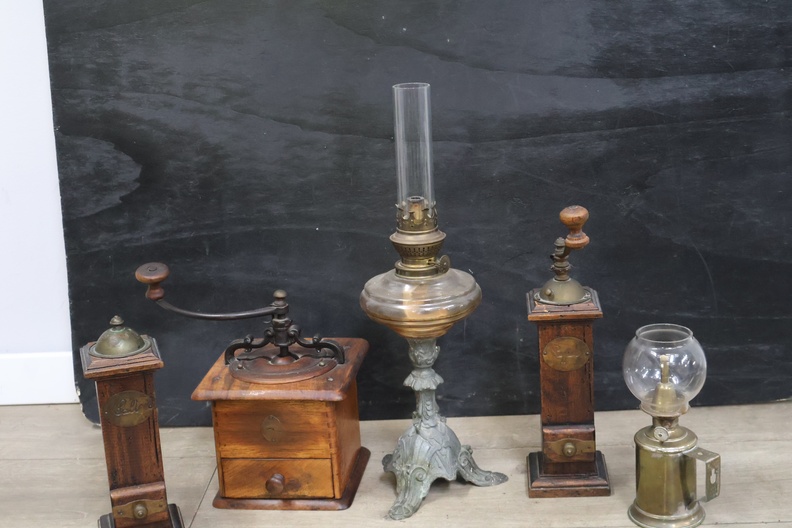 Vintage olielampen 2 stuks en koffiemolens 3 stuks