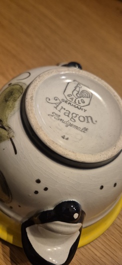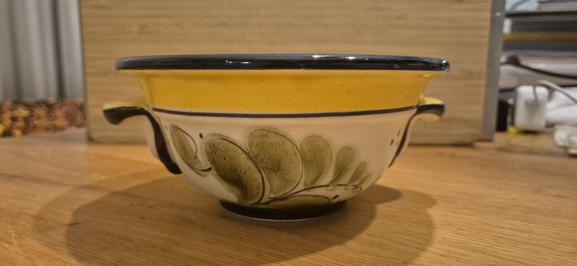Mooi uitgevoerd in warme geel-/okerkleur met decoratief bladmotief. Voorzien van twee kleine handgreepjes aan de zijkant. Onderaan gemerkt met Gallo Germany – Aragon – Handgemalt.
