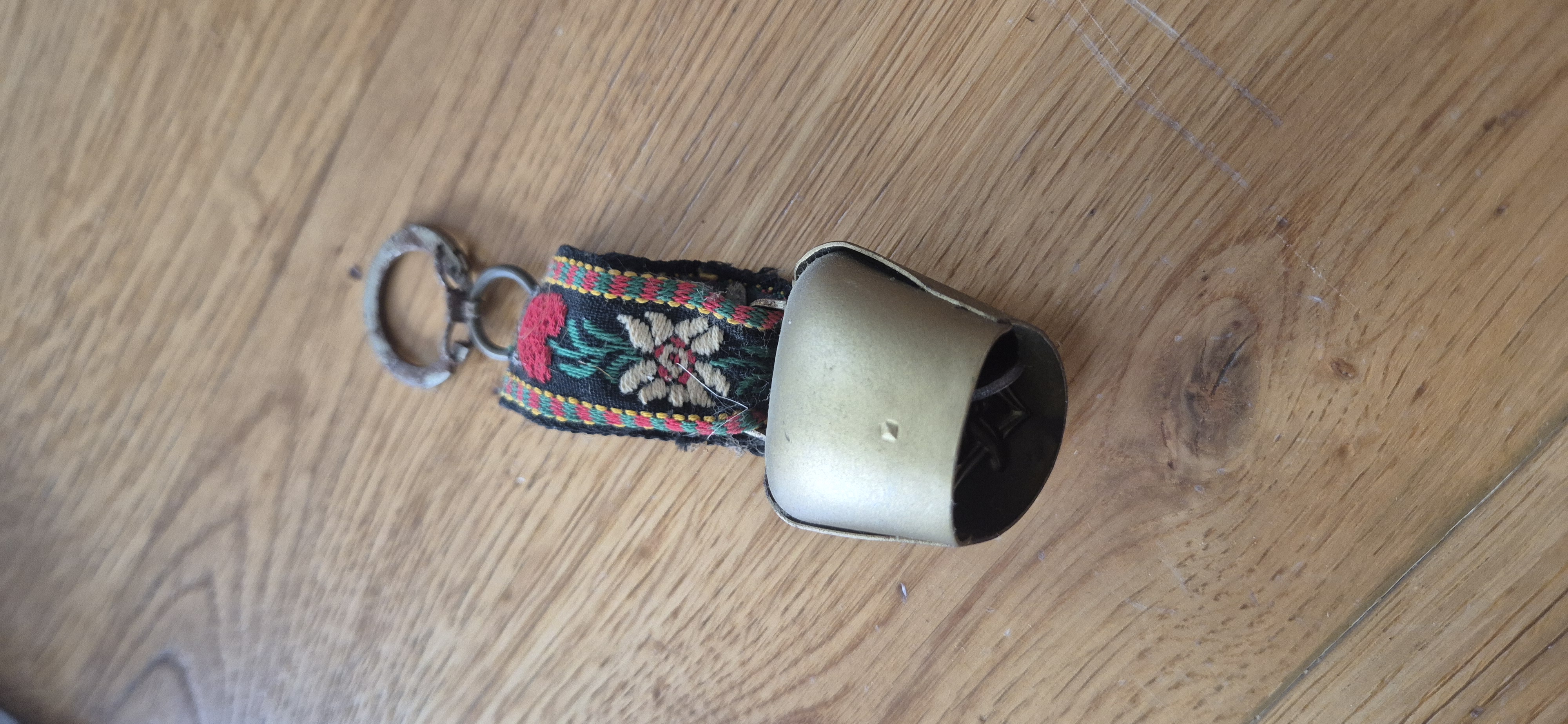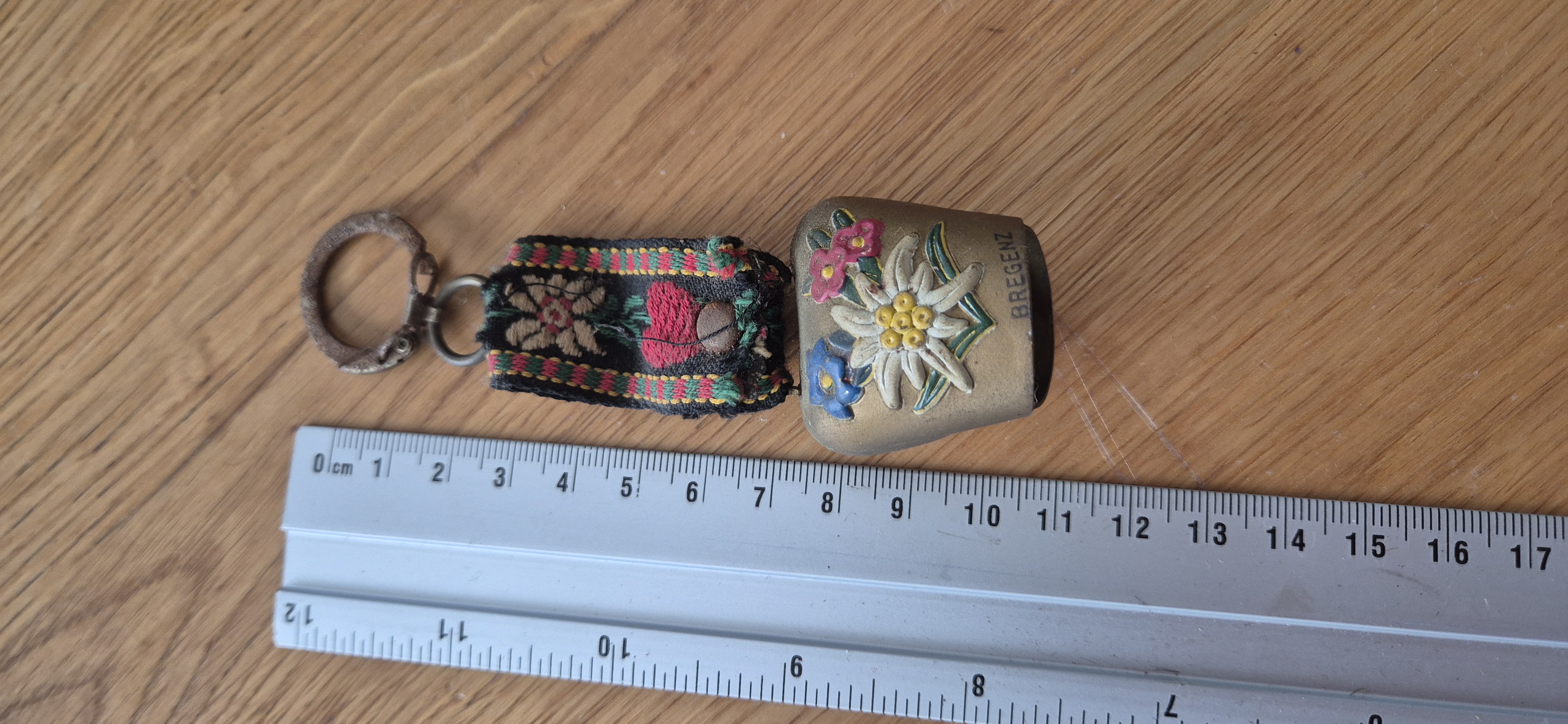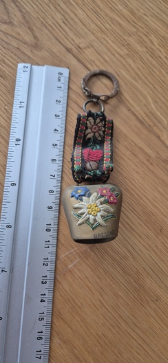 Oude metalen sleutelhanger uit Bregenz (Oostenrijk) met edelweiss-decoratie en folkloristisch stoffen lint.