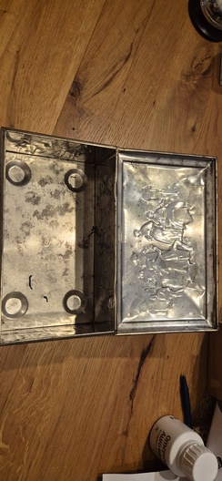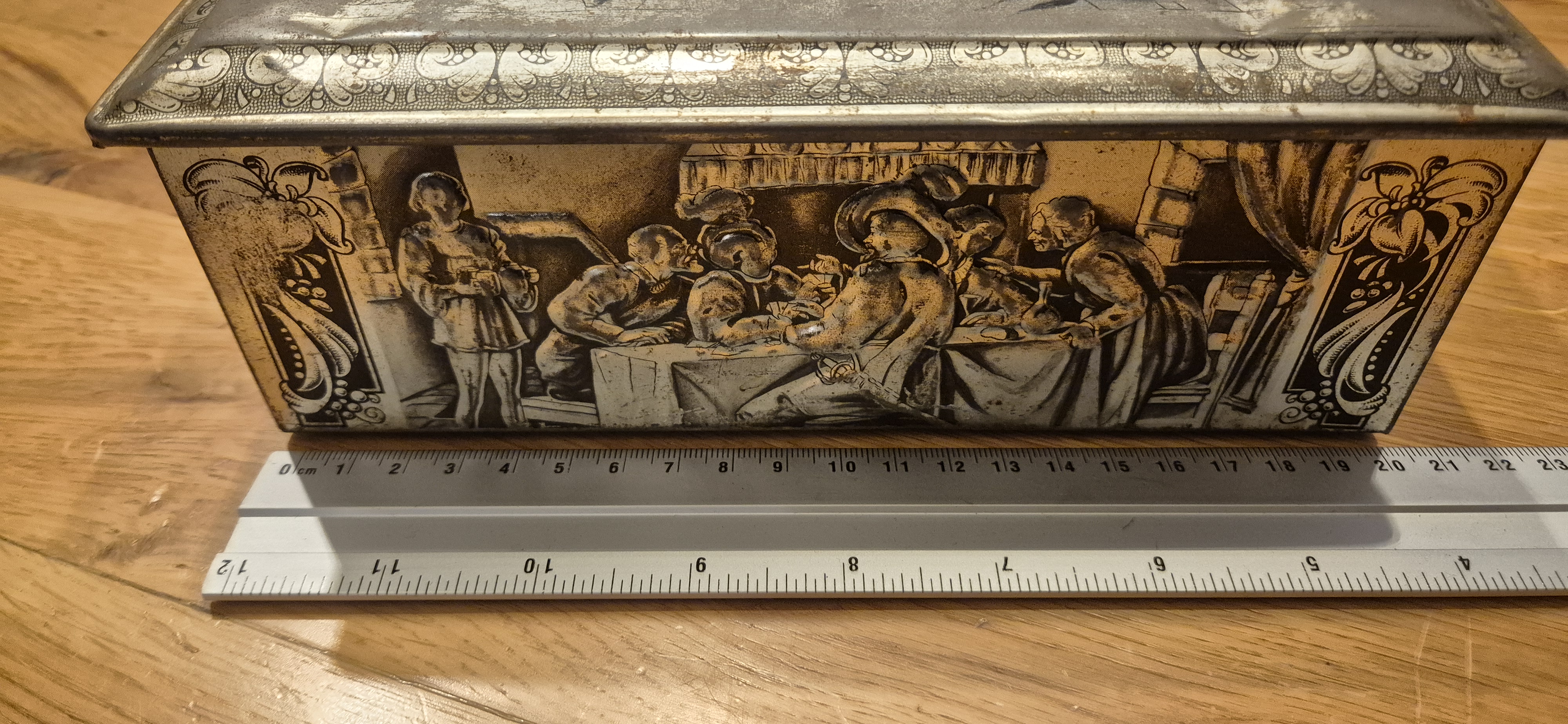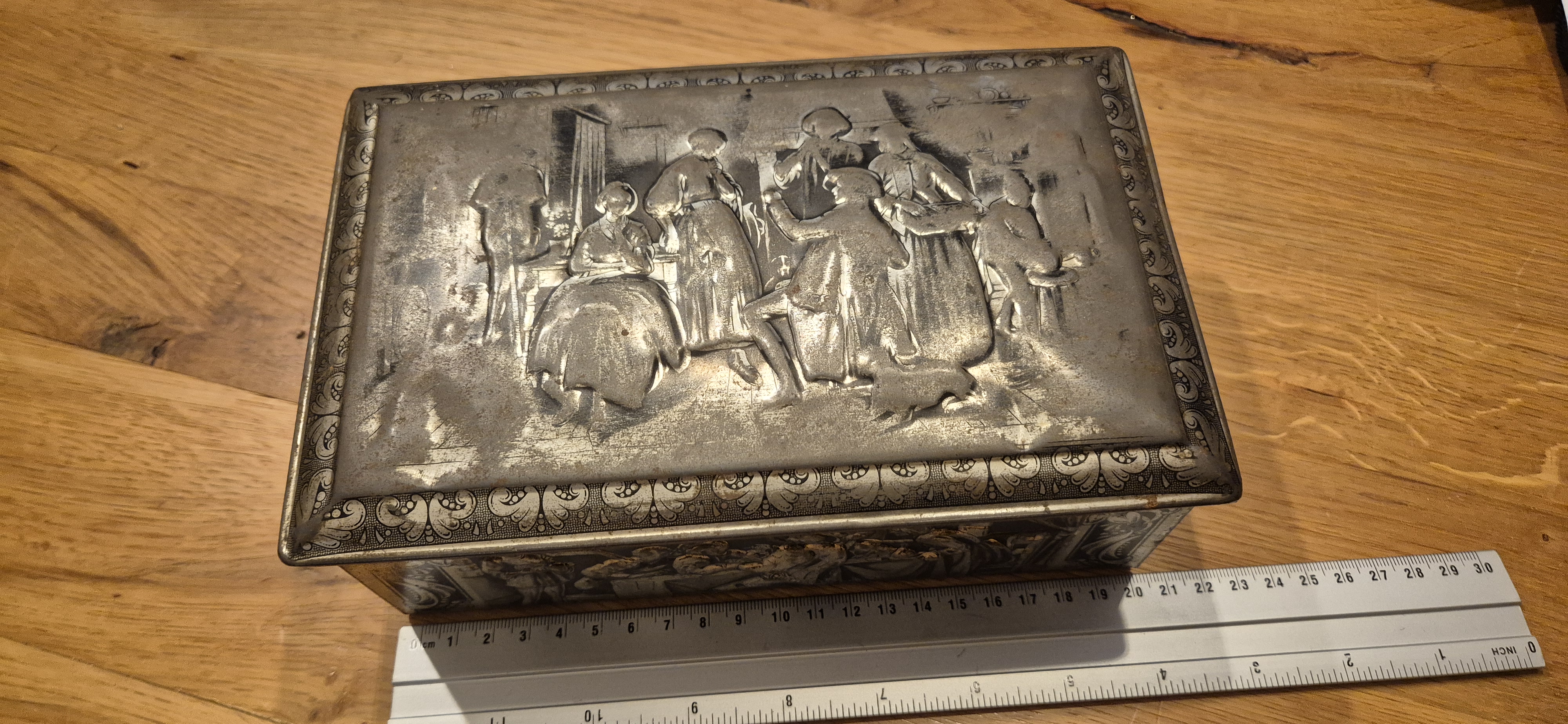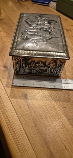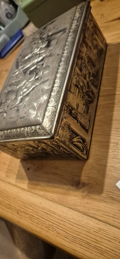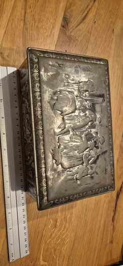 Mooie oude blikken opbergdoos met reliëf in het deksel en klassieke afbeelding op de zijkanten.