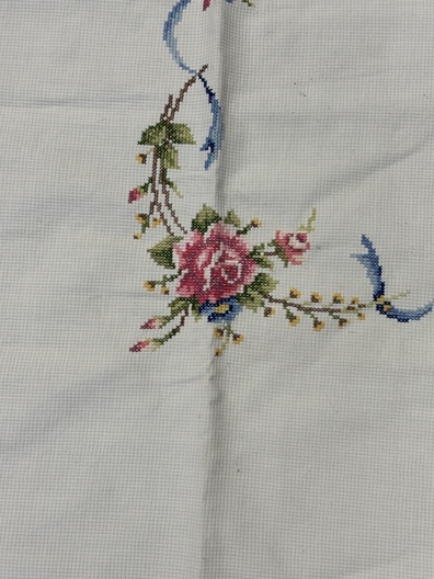 Te koop aangeboden: vierkant geborduurd kleed met romantische bloemenrand. Het kleed heeft een licht crèmekleurige ondergrond met rondom een sierlijke rand van roze rozen, blauwe linten en groene takjes in kruissteekborduurwerk.