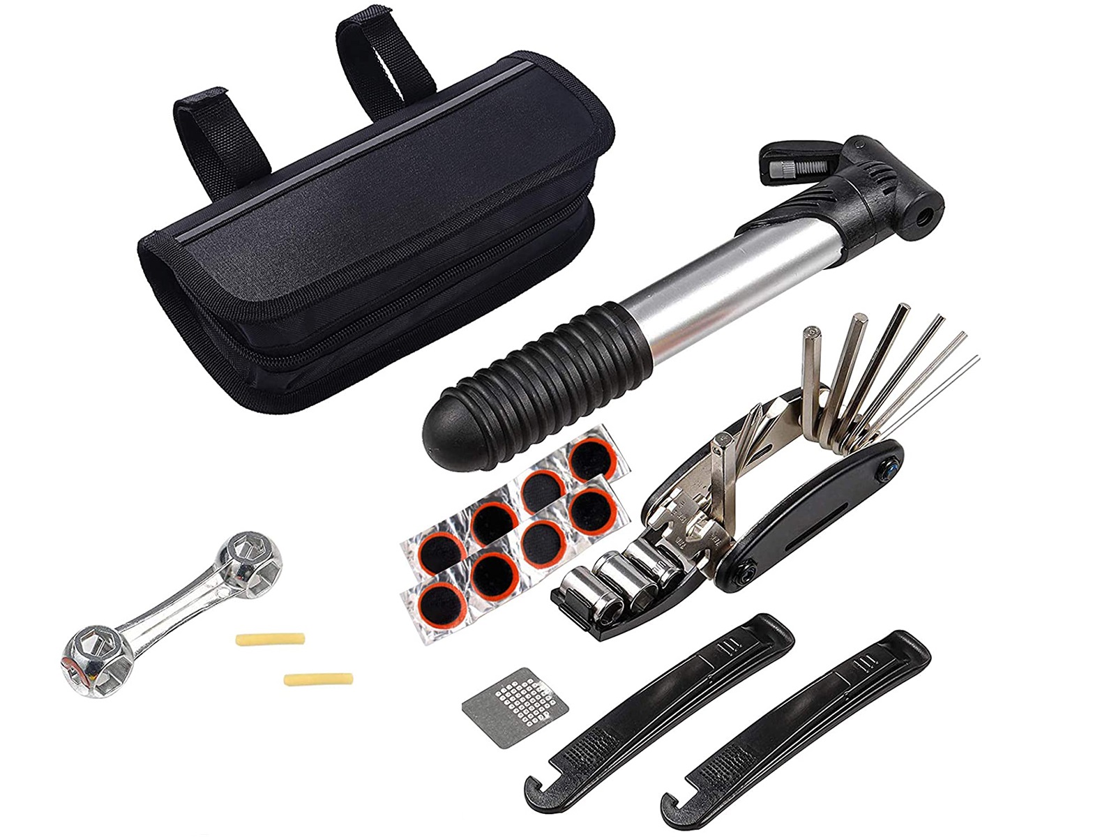 De set bestaat uit een compacte pomp, een multi tool, 2 bandenlepels, 8 plakkers, 1 moersleutel met 8 maten en opbergtas.