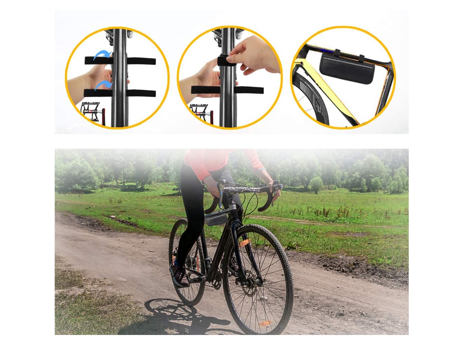 De set zit in een handige etui en is te bevestigen met klittenband aan het frame van de fiets.