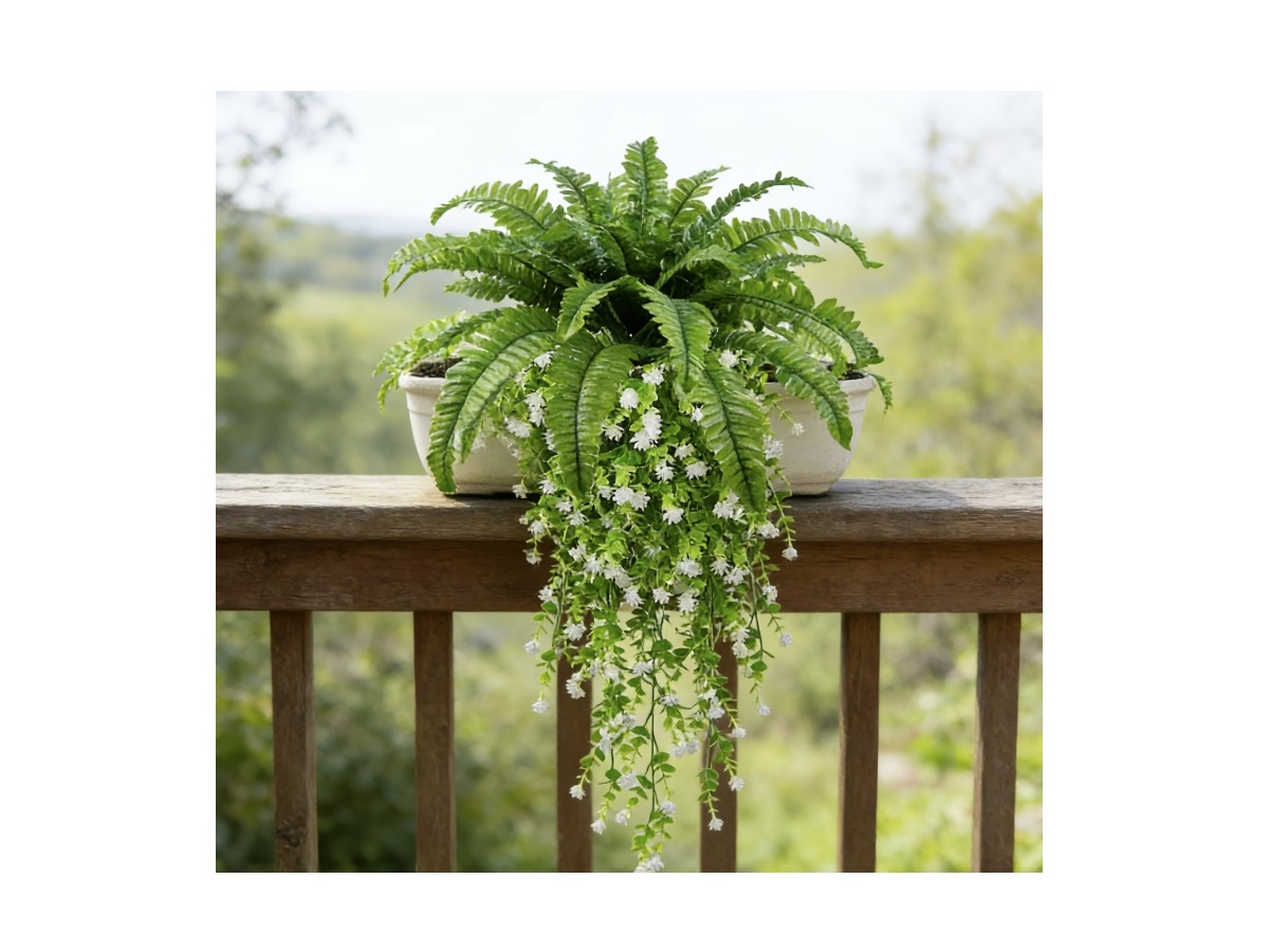 Geef je interieur een frisse en elegante boost met deze prachtige kunst varen hangplant met witte bloemen