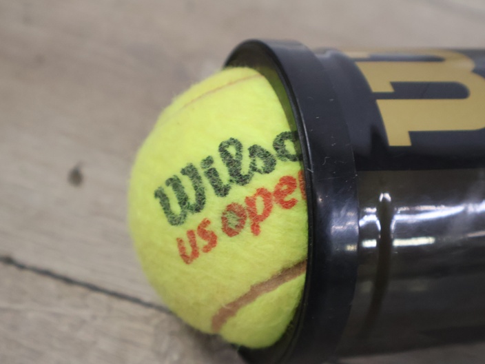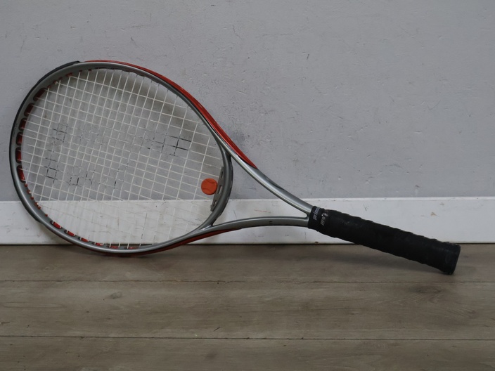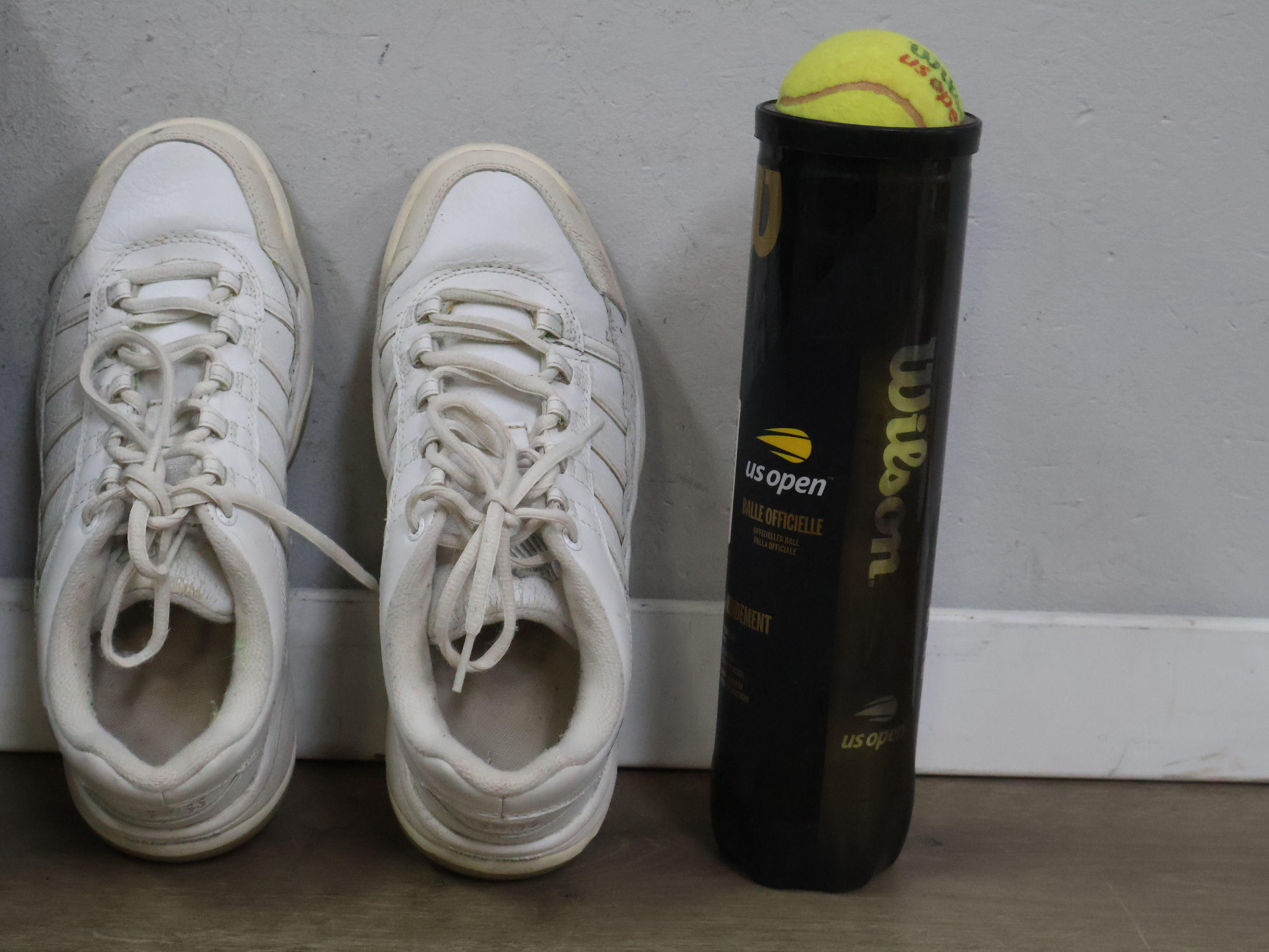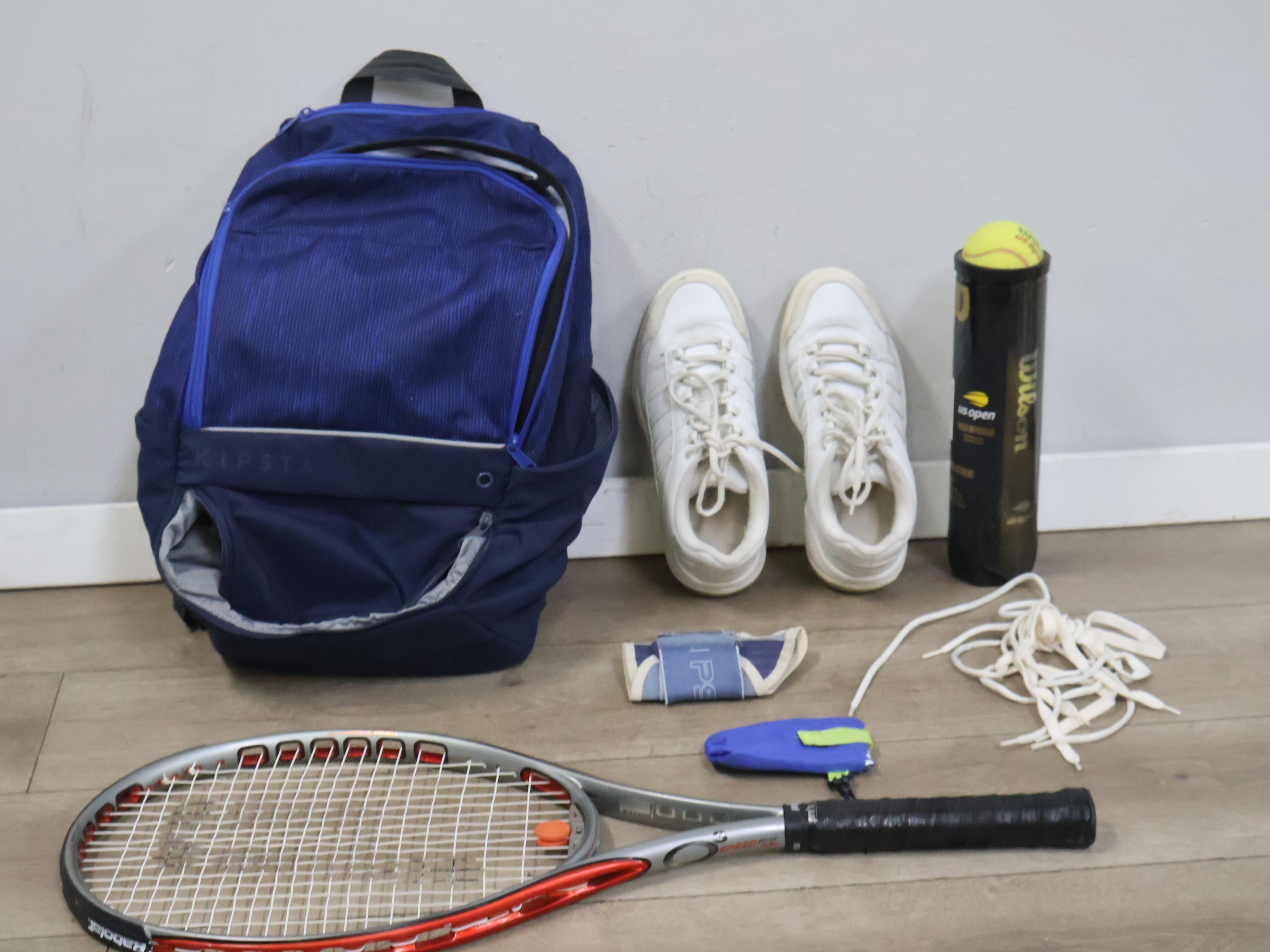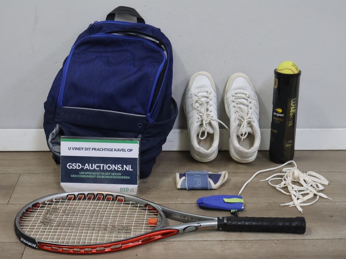 Tennisracket met sportschoenen, rugzak en tennisballen