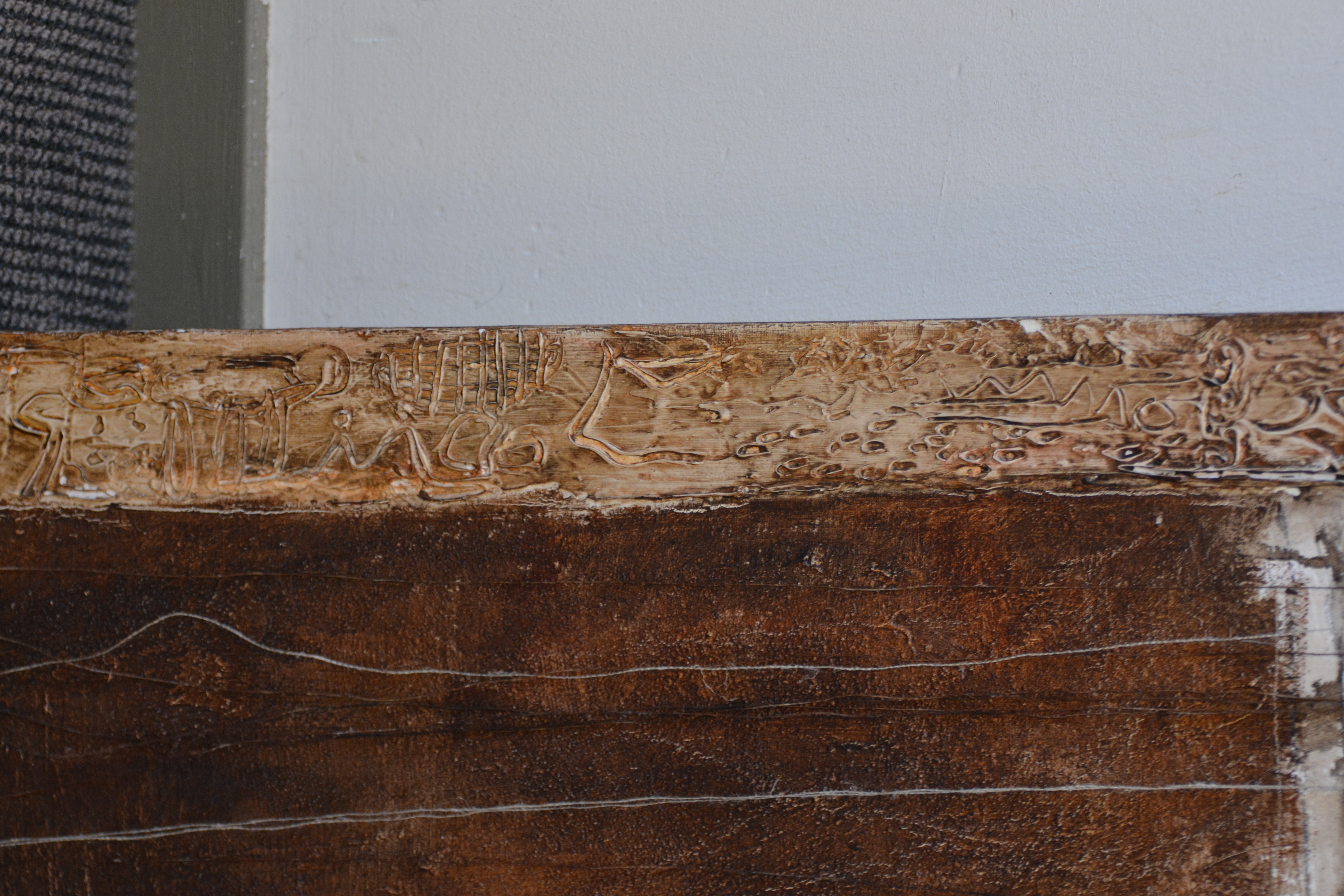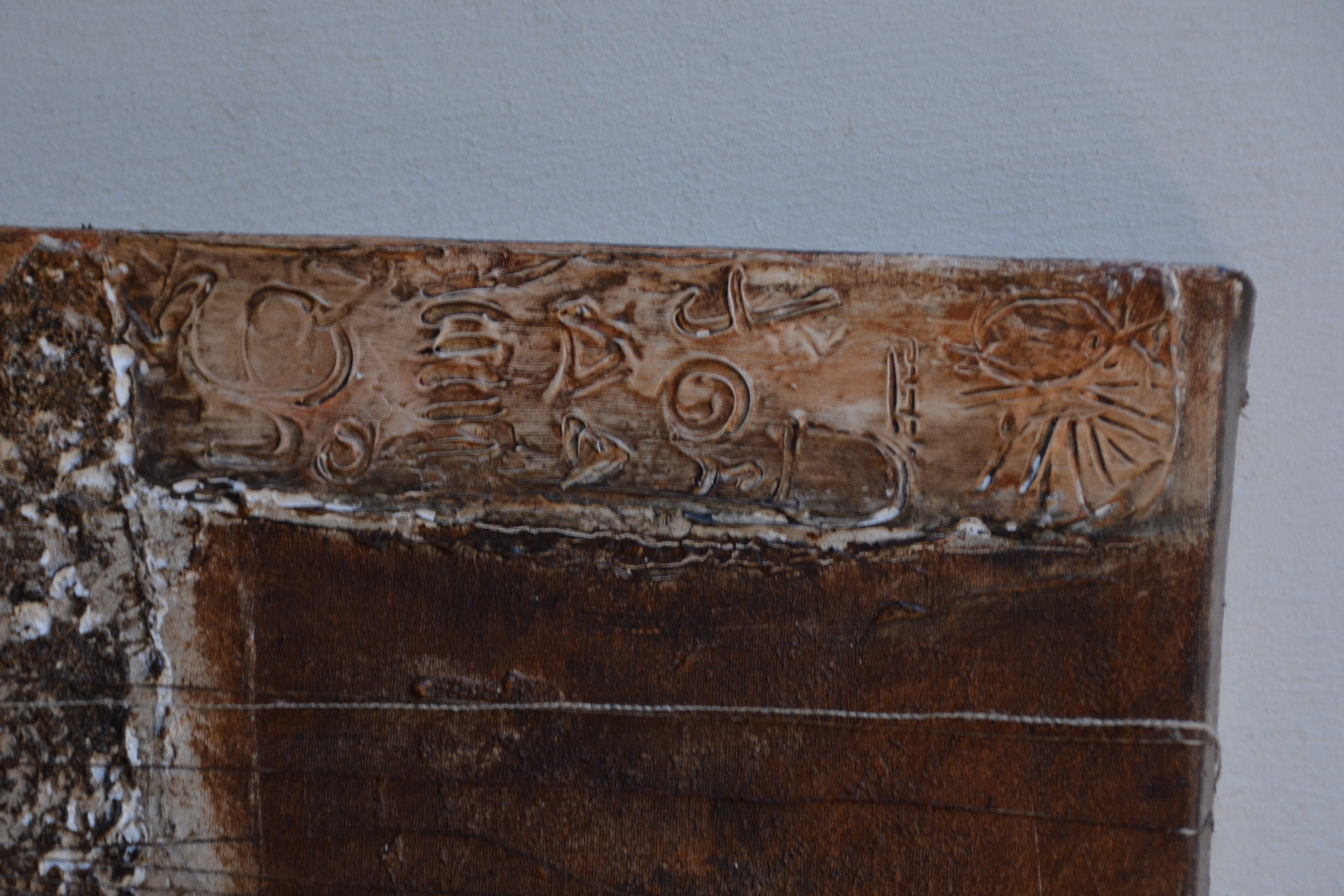 Jeanne Beenakkers (Bavel 1946-2012), was een bekend kunstenares. Ze werkte veel met acryl op canvas, dit werk is gemaakt met gemengde technieken. Achterop staat geschreven; Horiz Fig' Mogelijk de titel. Met Australische symbolen. Zonder lijst. In goede staat.