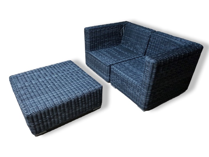 Set bestaande uit 2x een hoekdeel (90 x 78 x H72 cm), wordt een 2-zits bank en een hocker (90 x 90 x H34 cm) welke ook als salontafel gebruikt kan worden. Exclusief kussens.