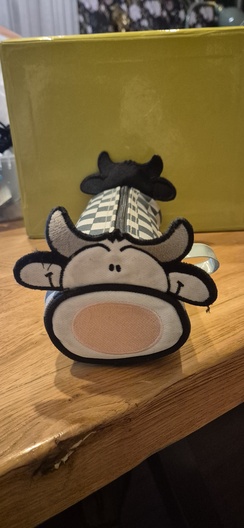 geblokt pennenetui met aan de buitenkanten een afbeelding van een koe, zie foto