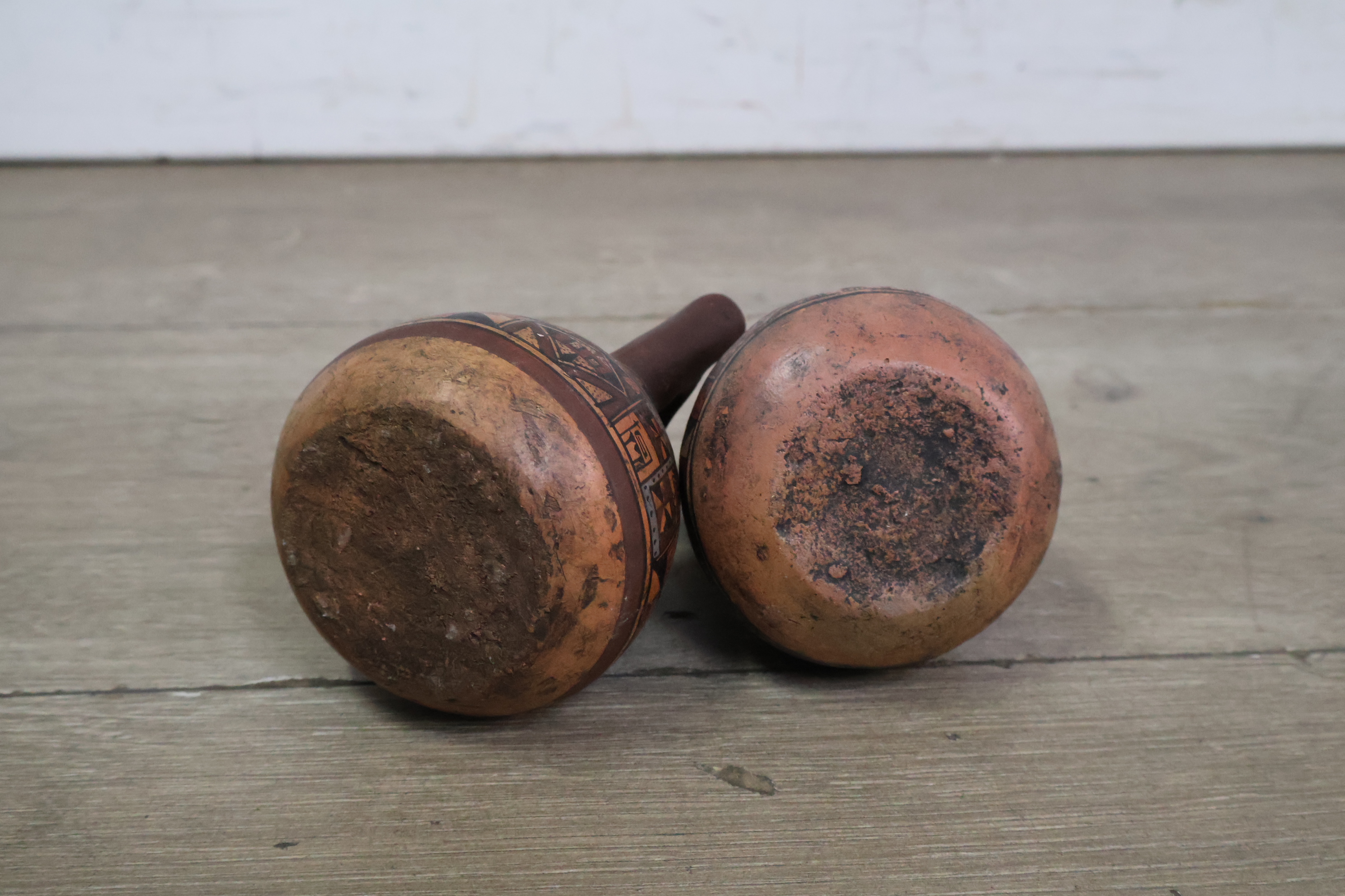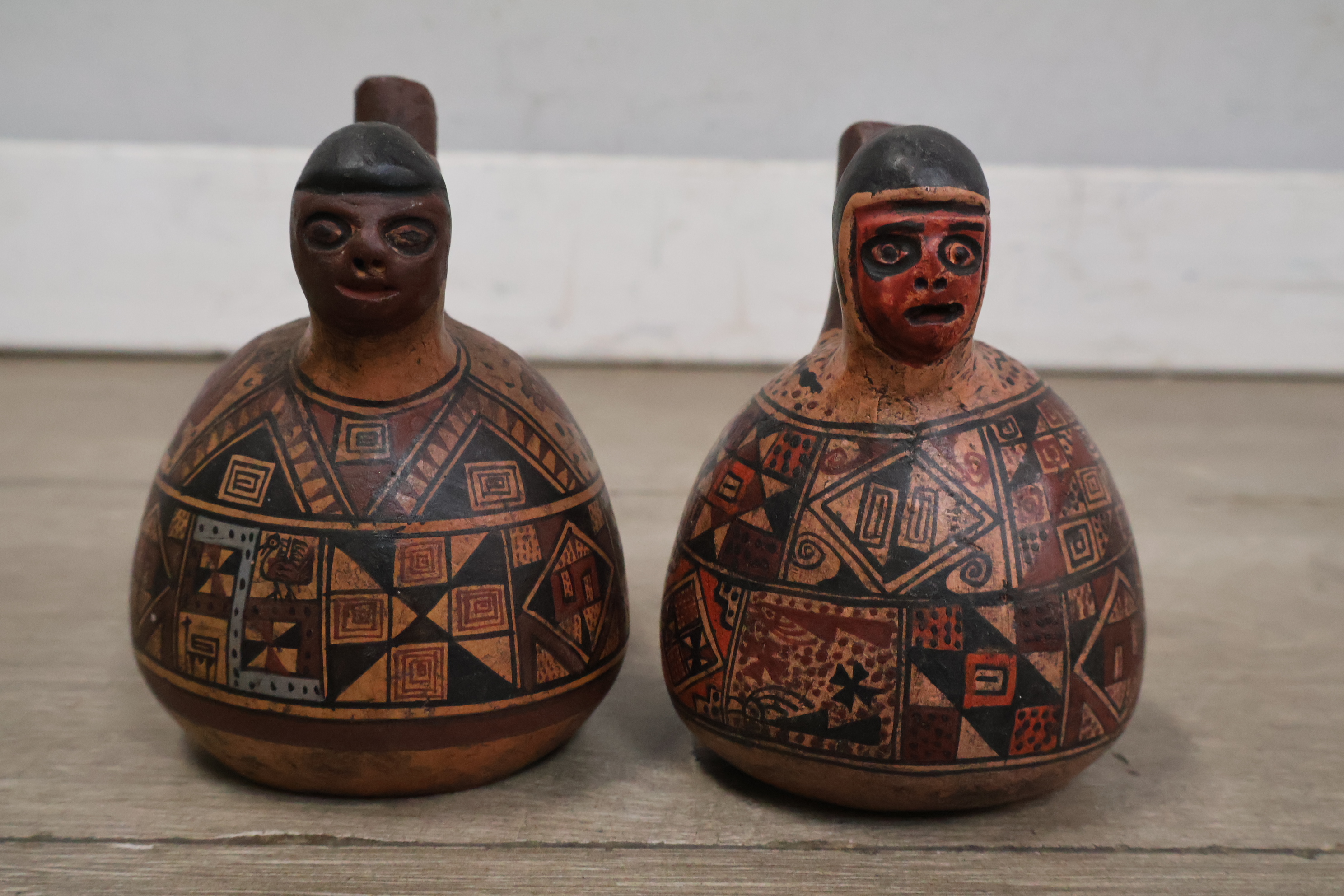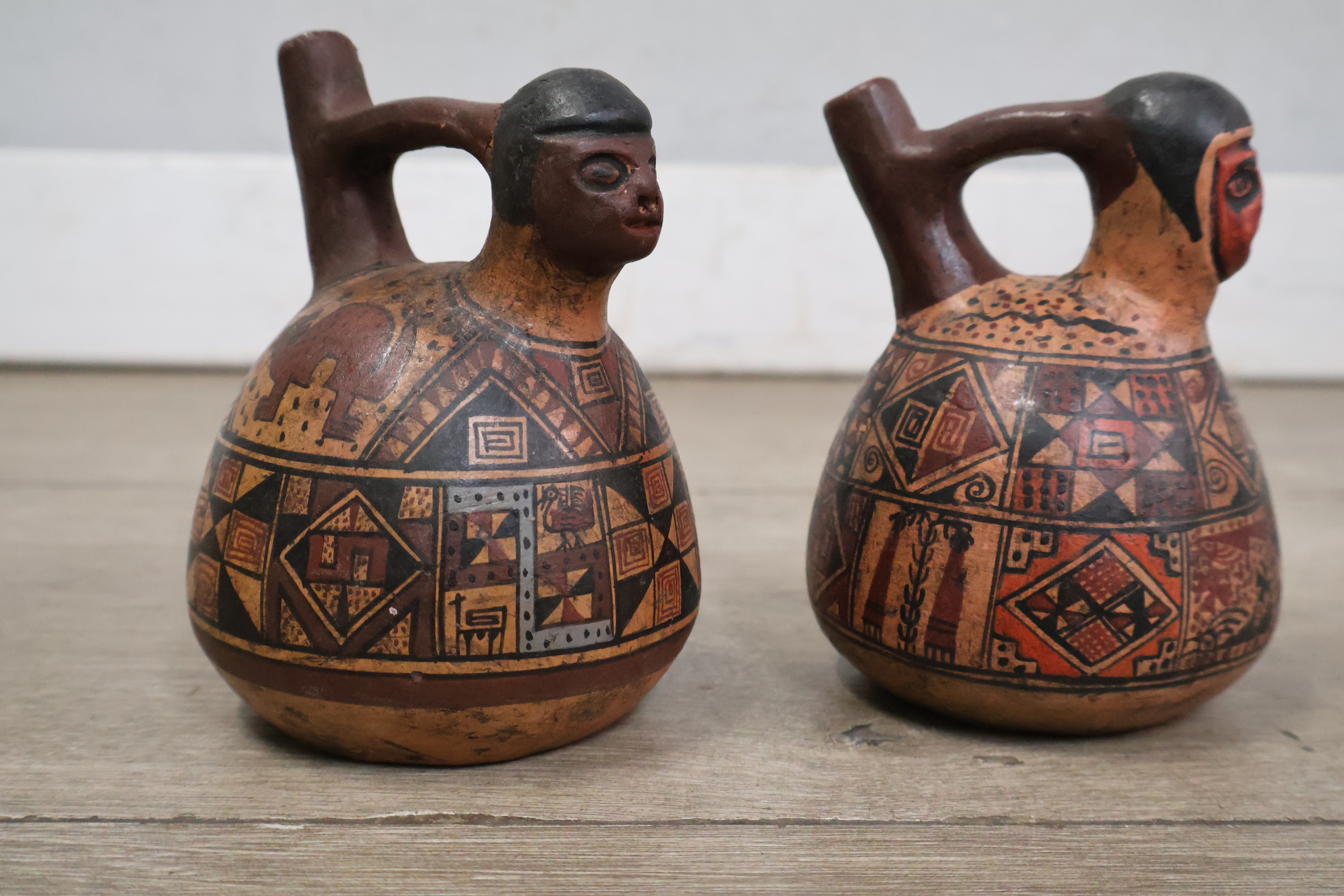 Handgeschilderde aardewerk kruiken uit Peru 2 stuks