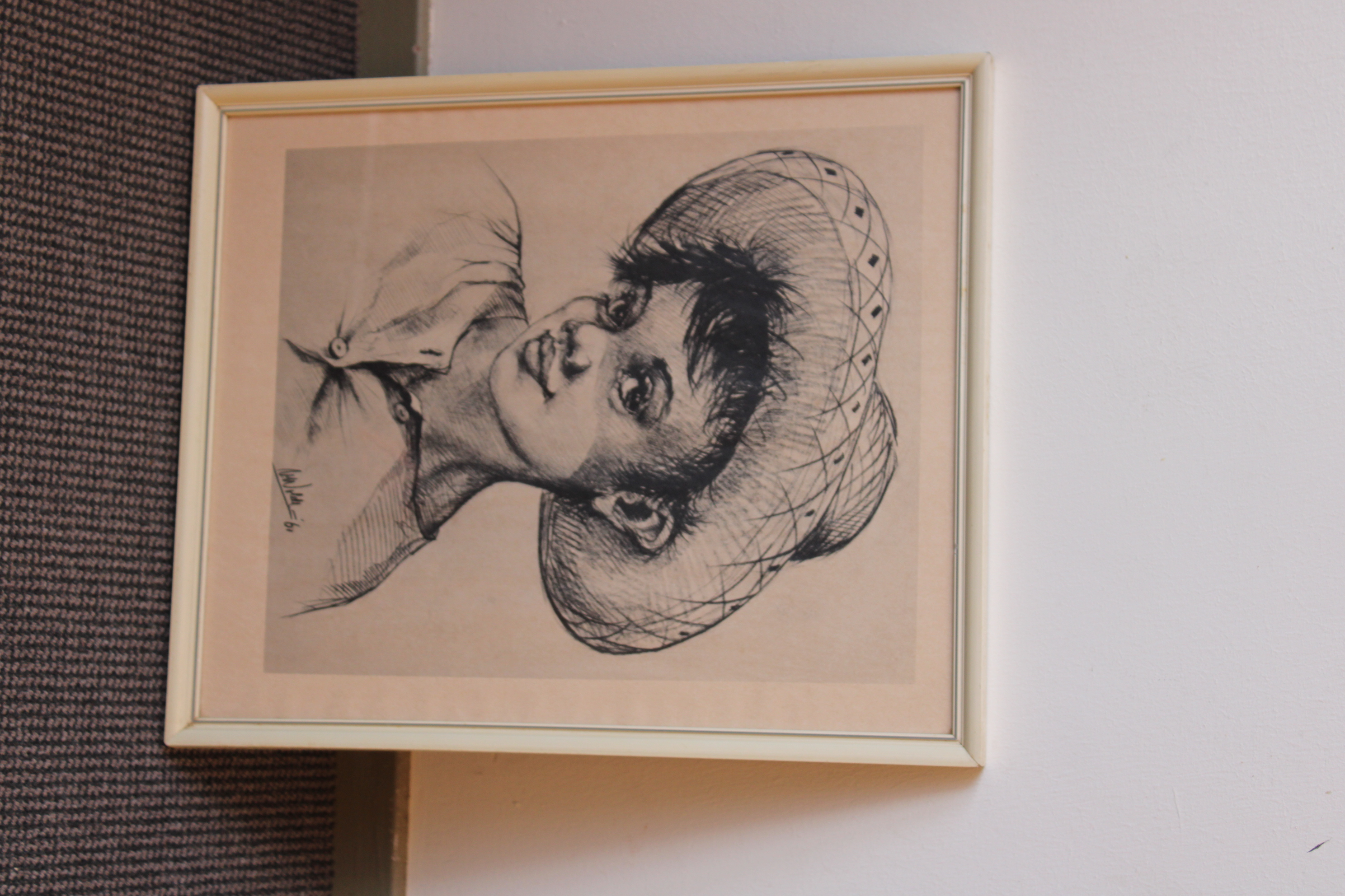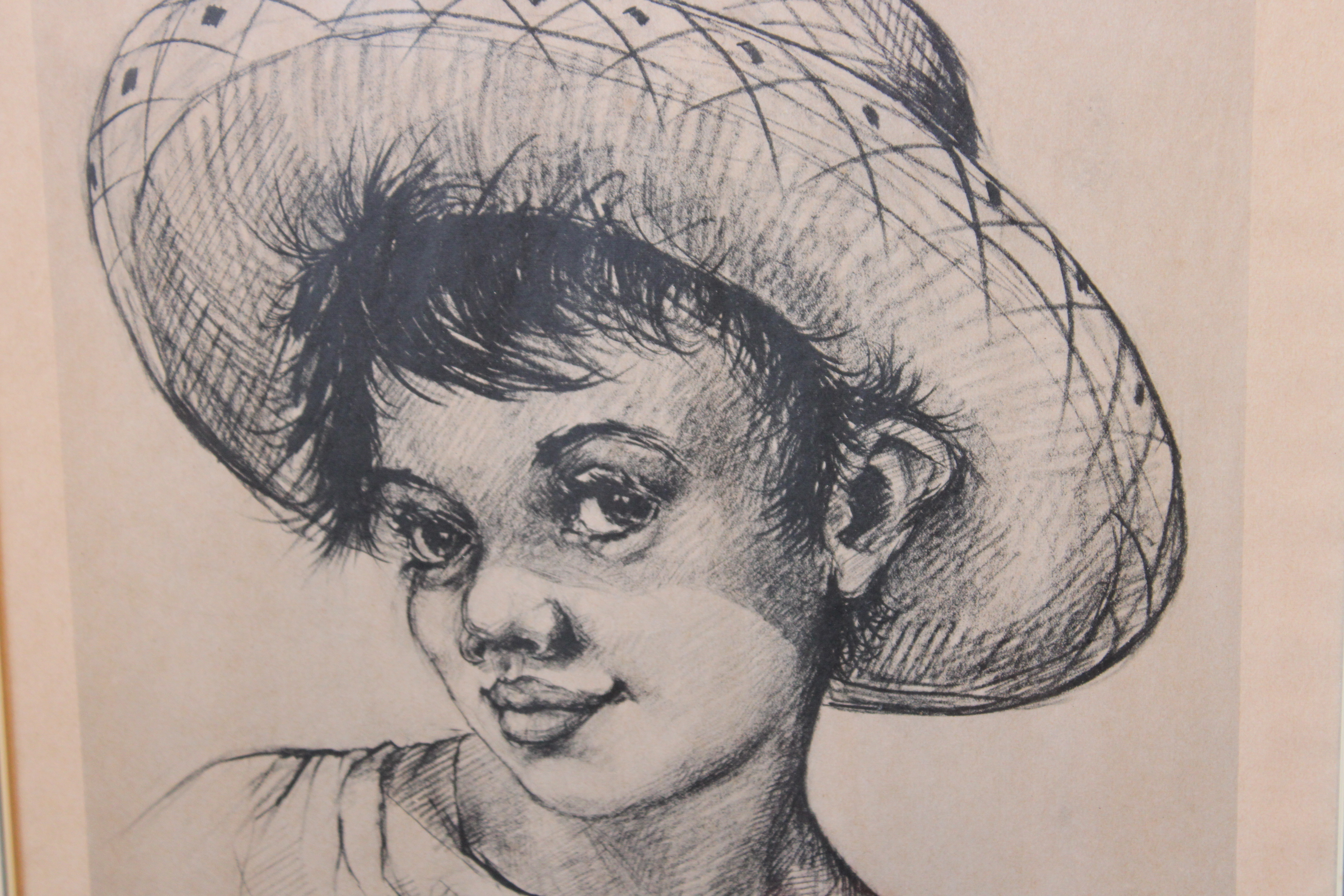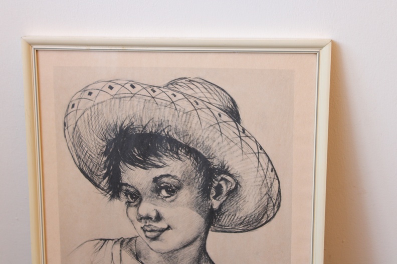 Mooie prent naareen tekening uit 1961 van V. Woldt. We zien een jongen met een strohoed. In goede staat.