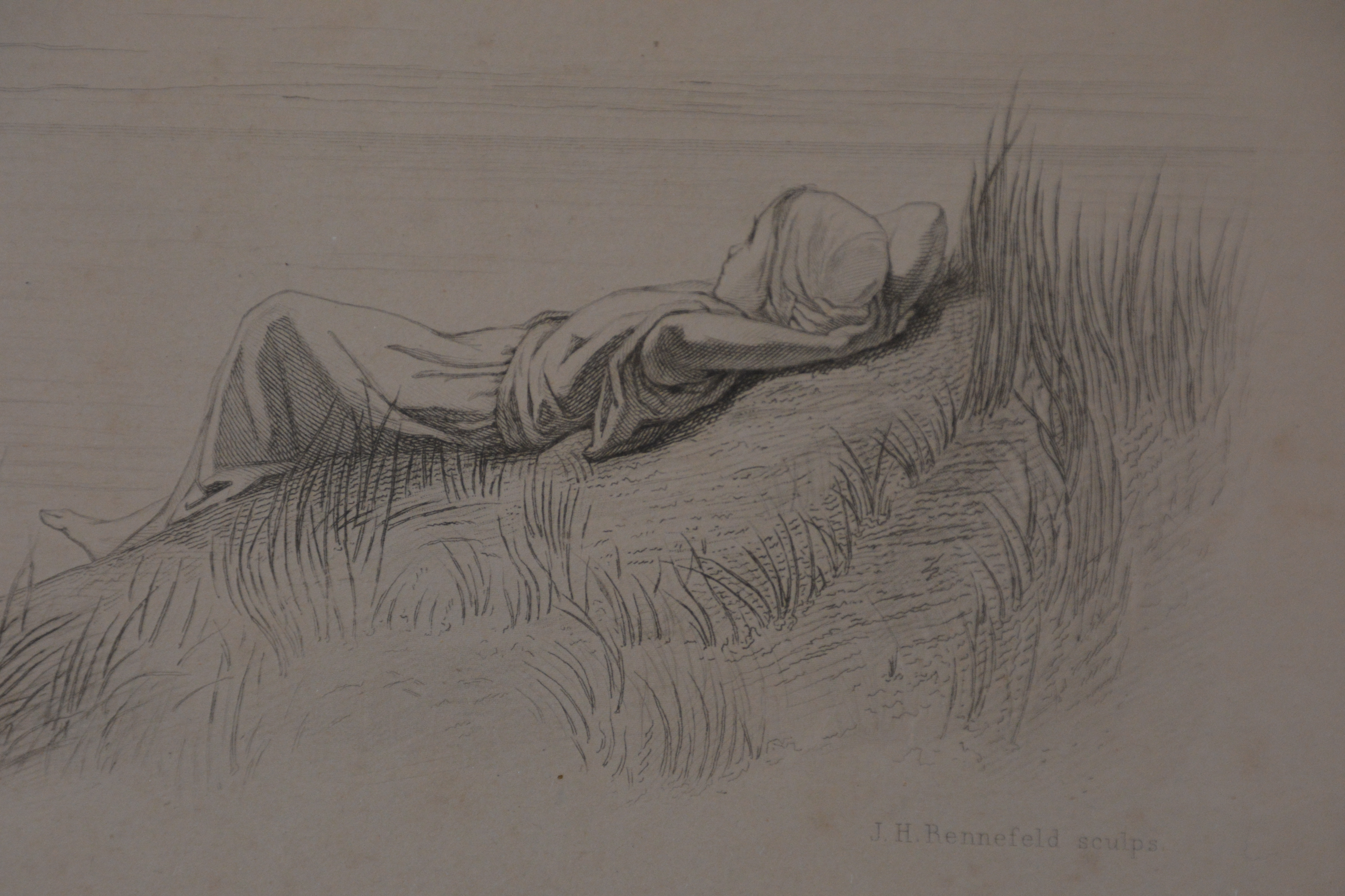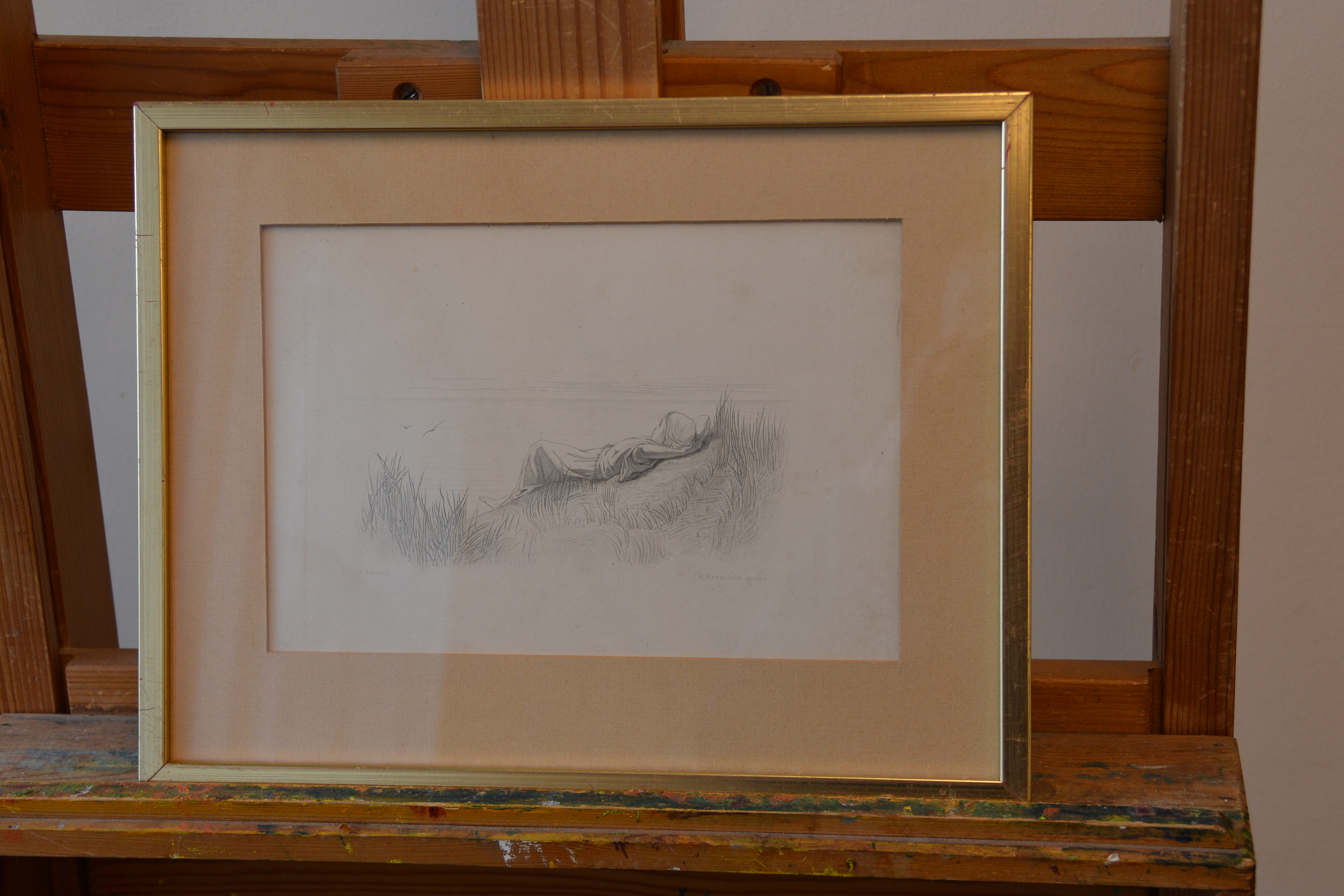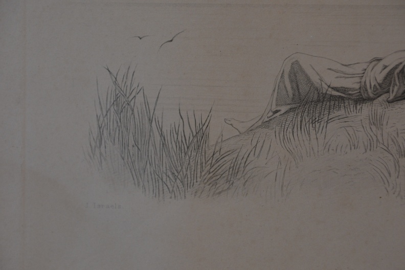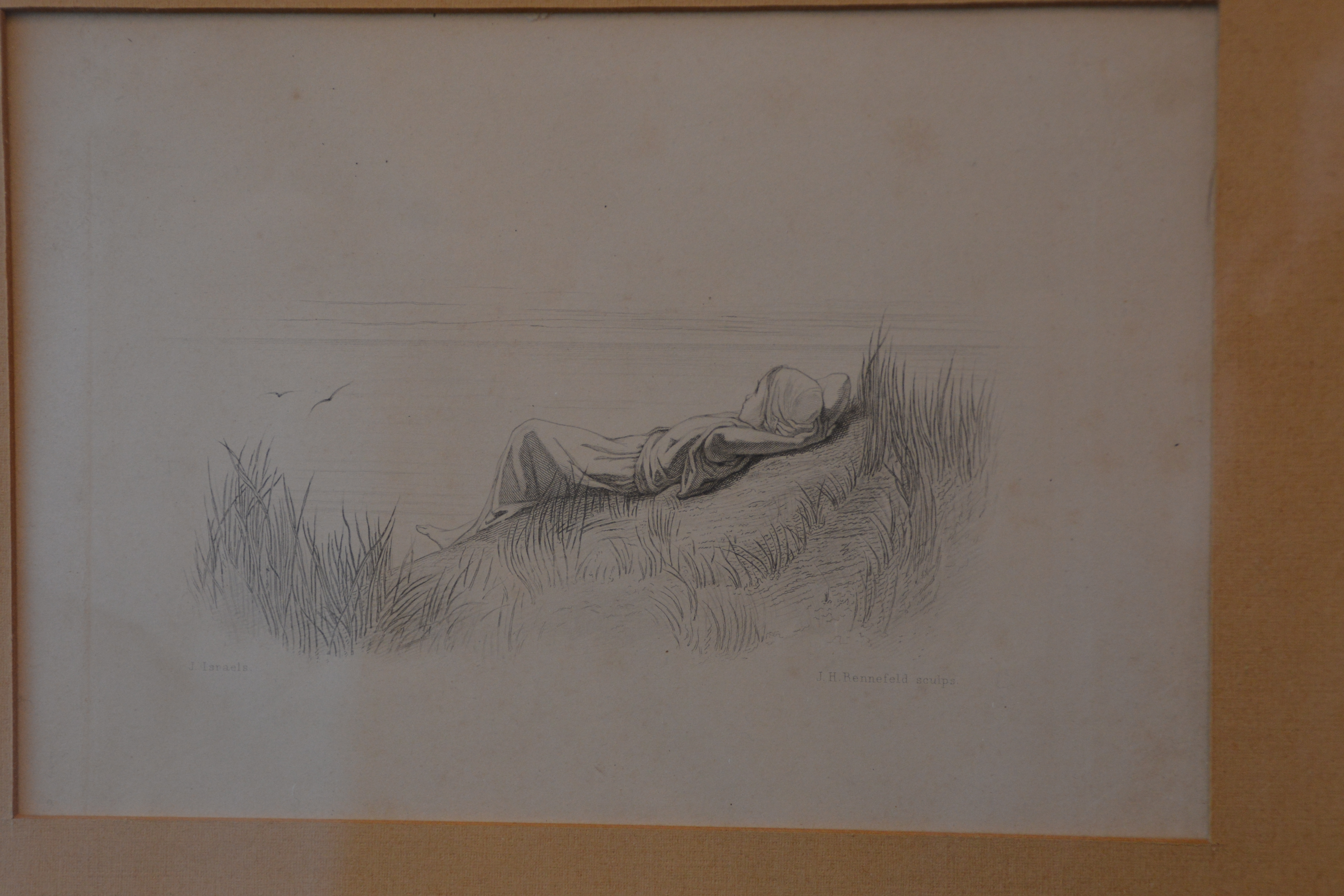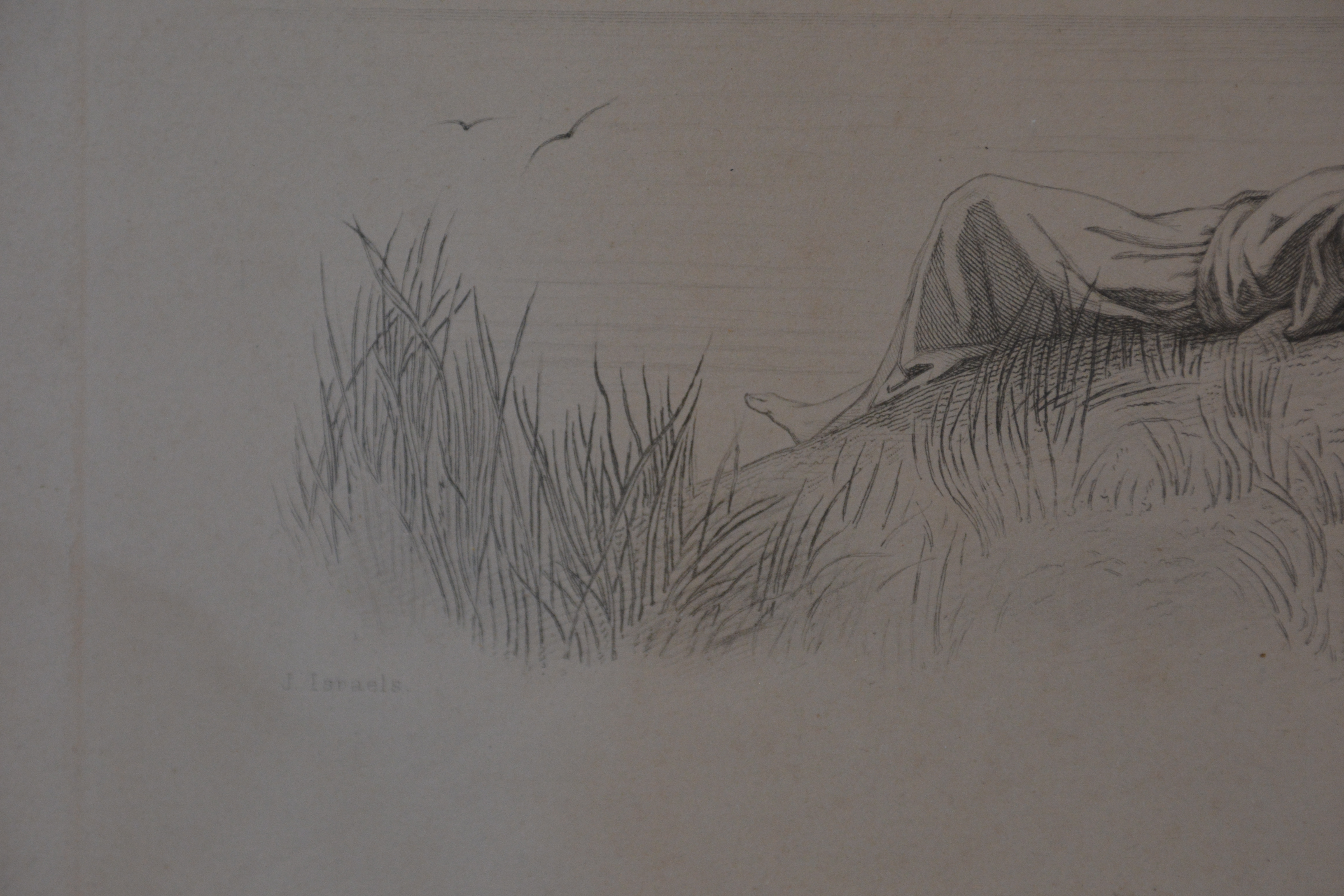 Prachtige prent van J. Israels: Liggend kind in de duinen