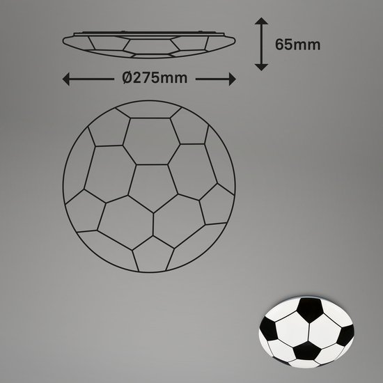 De productafmetingen van deze ronde LED plafondlamp met kunststof kap in voetballook zijn 275 mm in diameter en 65 mm hoog.