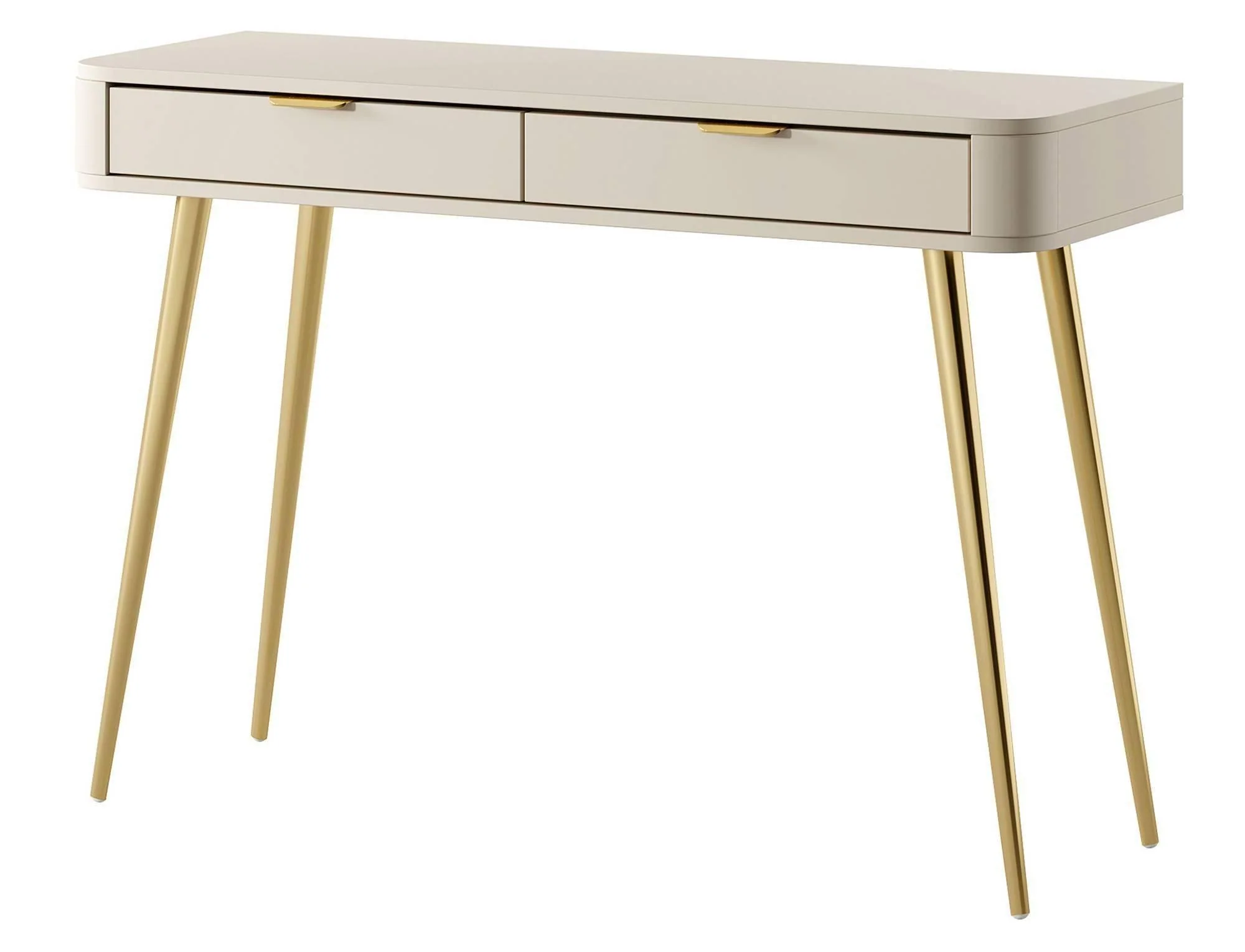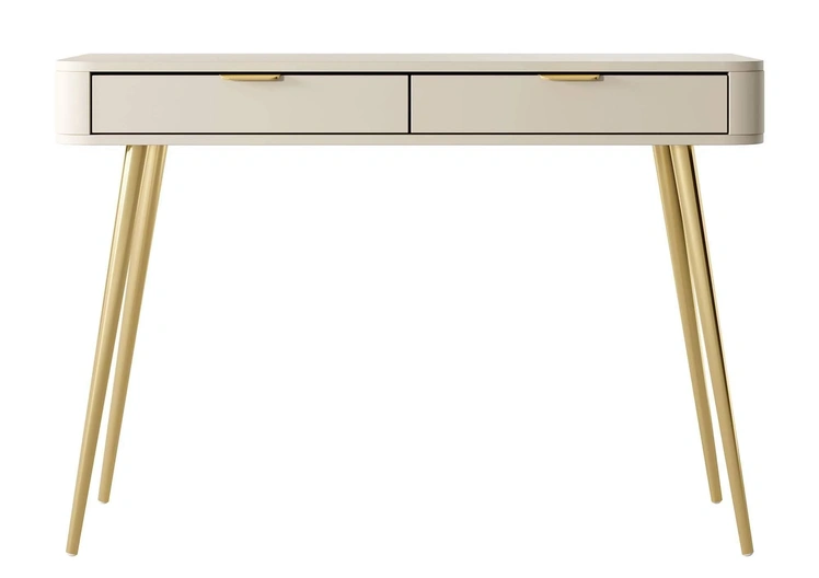 De kaptafel Olivia is een modern meubelstuk met subtiele ronde vormen die worden geaccentueerd door stijlvolle goudkleurige details. De stalen poten bieden stabiliteit en geven het geheel een mooi visueel contrast. Het robuuste stalen onderstel biedt stabiliteit en geeft het geheel een mooi visueel contrast Deze kaptafel biedt door haar laden veel praktische opbergruimte waar jij allerlei kleine spullen in kwijt kunt, ook mooi om hier een spiegel op te zetten of erboven op te hangen aan de muur! Kaptafel Olivia is vervaardigd uit hoogwaardig spaanplaat en is voorzien van een metalen onderstel.