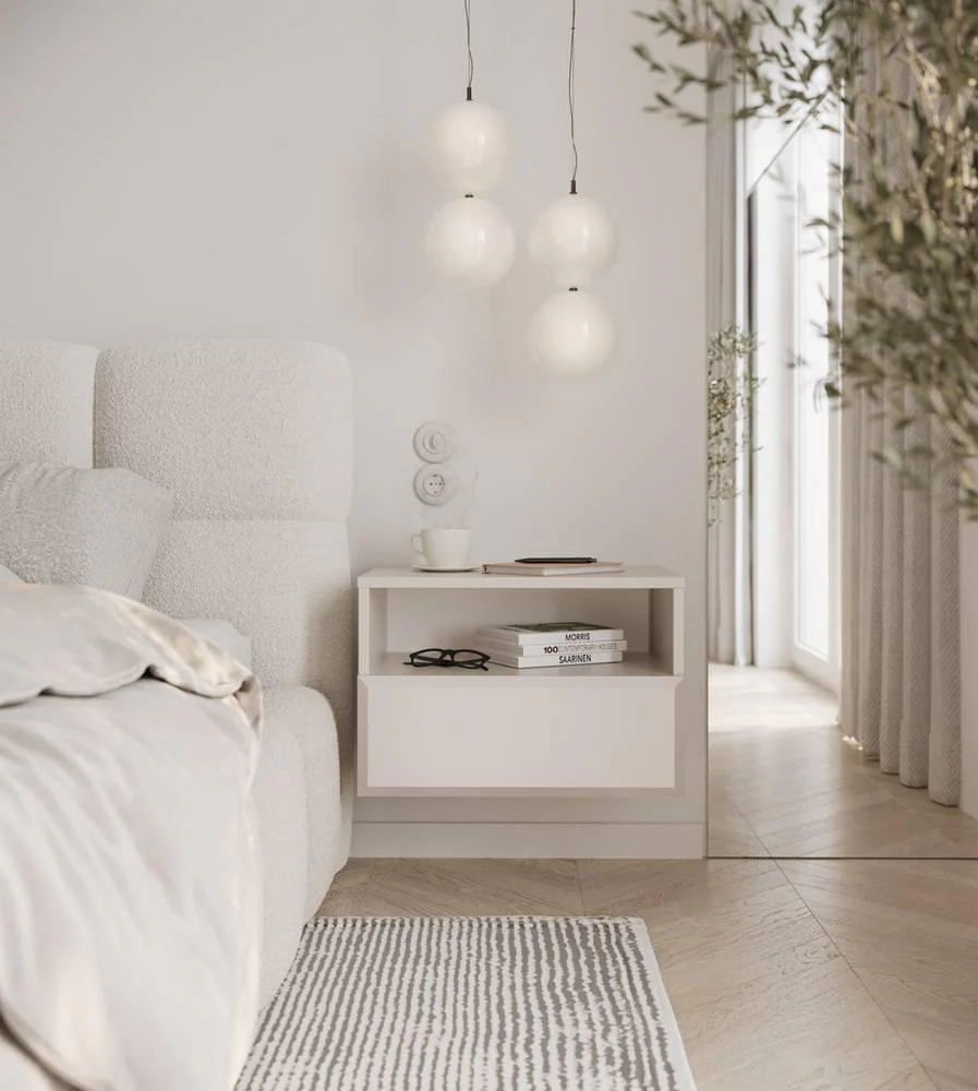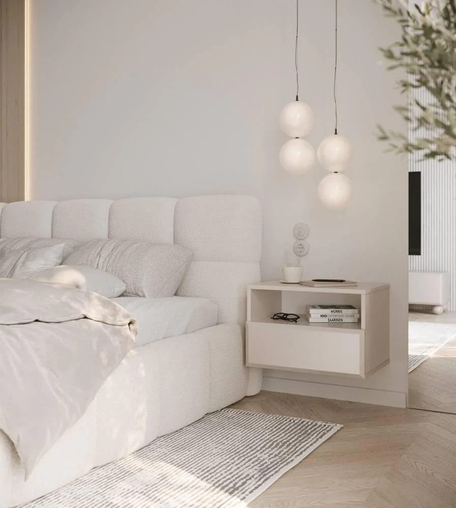 Ons Coco zwevende nachtkastje combineert een strak ontwerp met subtiele details zoals de schuingezaagde randen op de fronten. Dankzij het zwevende design houdt deze kast de ruimte luchtig én maakt schoonmaken een fluitje van een cent. Gemaakt van gelamineerd spaanplaat met stevige PVC-randen, is dit meubel duurzaam en bestand tegen dagelijks gebruik.