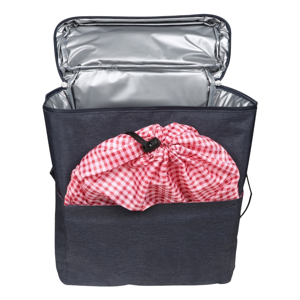 Dubbele picknickfietstas van heather R-PET met een praktische indeling. Eén kant is geïsoleerd om eten en drinken koel te houden, de andere kant bevat een complete serviesset voor vier personen. Met geruite voering, een apart vak voor een fles wijn en universele bevestiging geschikt voor de meeste fietsen, inclusief e-bikes. Afmetingen ca. 34 cm.