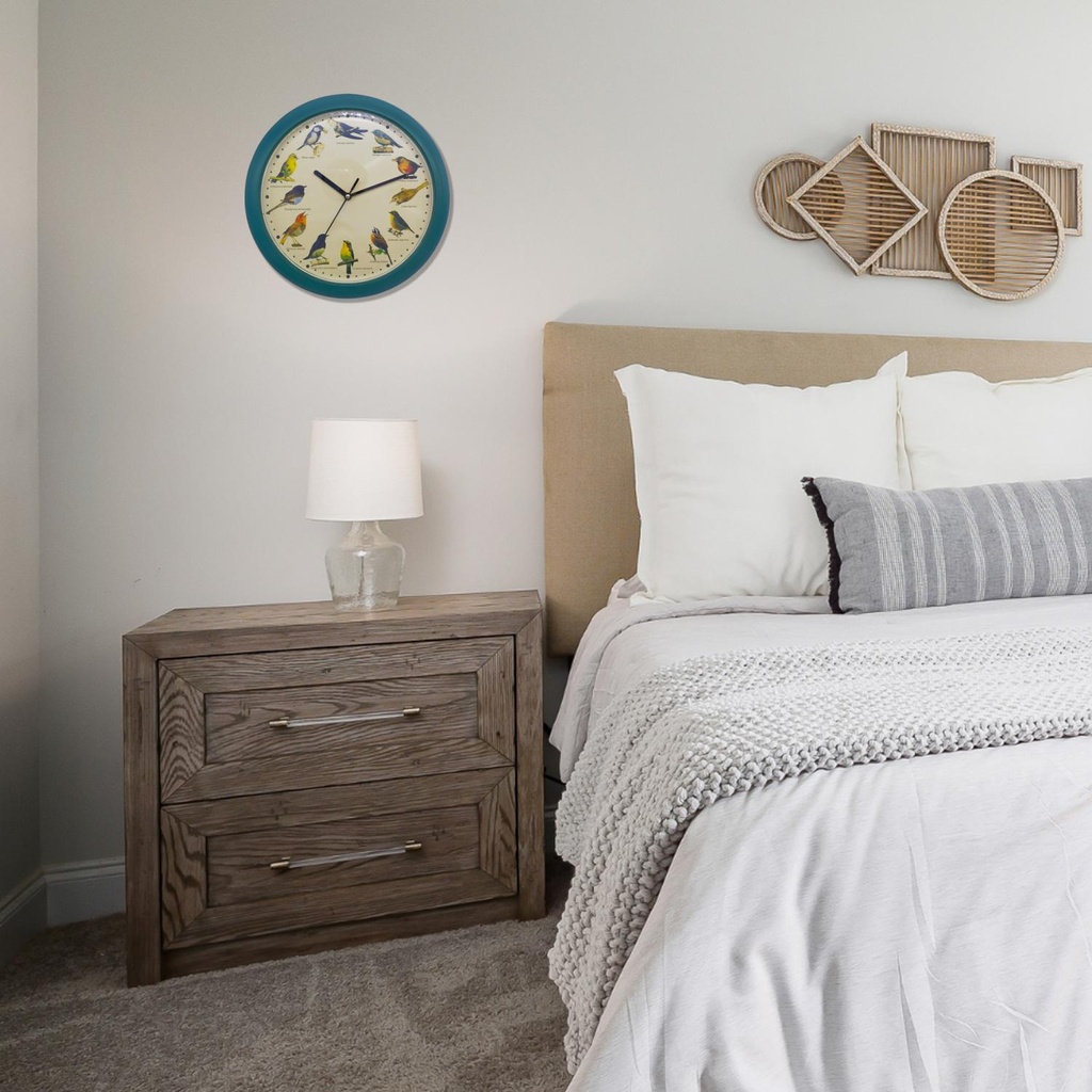 De Chirping Songbird Clock is ideaal voor alle leeftijden en biedt meer dan alleen betoverende geluiden. Laat kinderen spelenderwijs kennismaken met de verschillende melodieën van verschillende vogelsoorten en stimuleer zo hun nieuwsgierigheid en waardering voor de wonderen der natuur. Voor volwassenen dient het als een zachte herinnering aan de schoonheid van het buitenleven en bevordert het een diepere band met de natuurlijke wereld. Het instellen van deze prachtige klok is moeiteloos - plaats gewoon 3 AA-batterijen (niet meegeleverd) en de vogelserenade begint. Je kunt gerust zijn in de wetenschap dat de klok 's nachts geruisloos werkt, zodat je rustig en ongestoord kunt slapen.