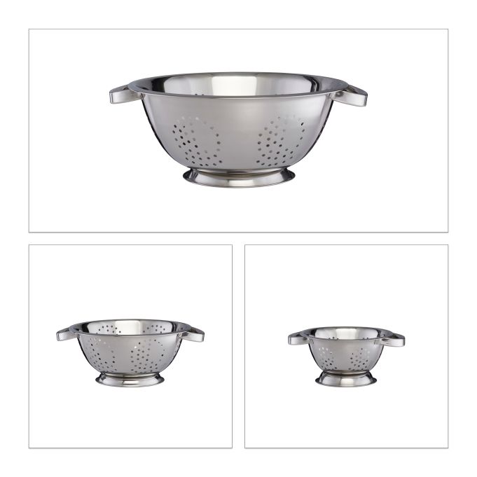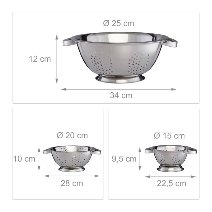 Deze praktische set met drie zeven hoort thuis in iedere keuken. Kies bij het koken de geschikte zeef-maat afhankelijk van de hoeveelheid eten. De vergieten zijn uitermate geschikt voor het wassen van verse groente, fruit of salade. De handvatten maken het mogelijk de groentezeef ook bij hete inhoud vast te houden. Door de vele gaten aan de zijkant en in de bodem loopt het wasser snel en efficiënt weg. Het tijdloze design van glanzend roestvrij staal maakt de keukenzeef ook optisch tot een eye catcher.