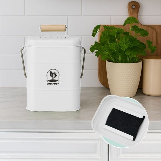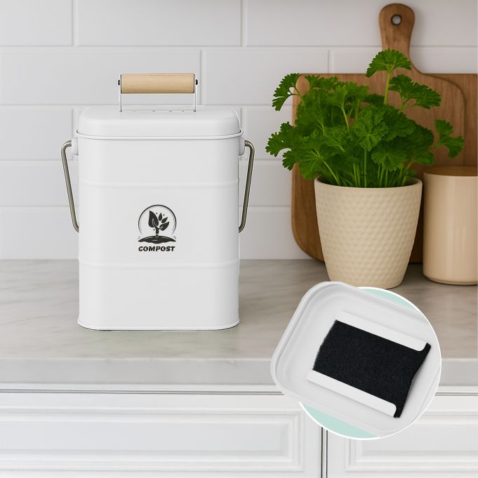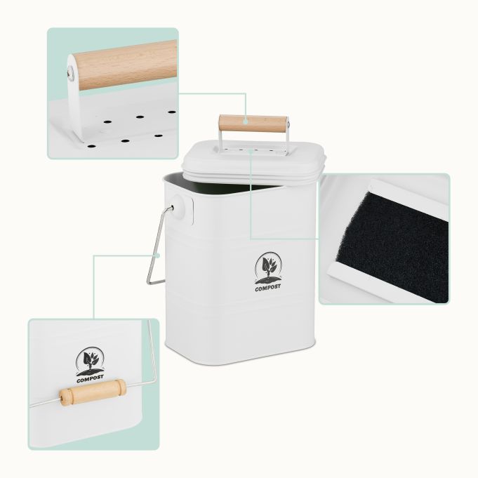 Deze compostemmer is ideaal voor koffiedik, eierschalen en ander groenafval. In de deksel van het gft-afvalbakje zitten gaatjes voor voldoende luchttoevoer en de koolfiters neutraliseren vieze geurtjes. Dit maakt hem ook geschikt om op het aanrecht te plaatsen. Dankzij het hengsel is de afvalemmer gemakkelijk te dragen en te legen.