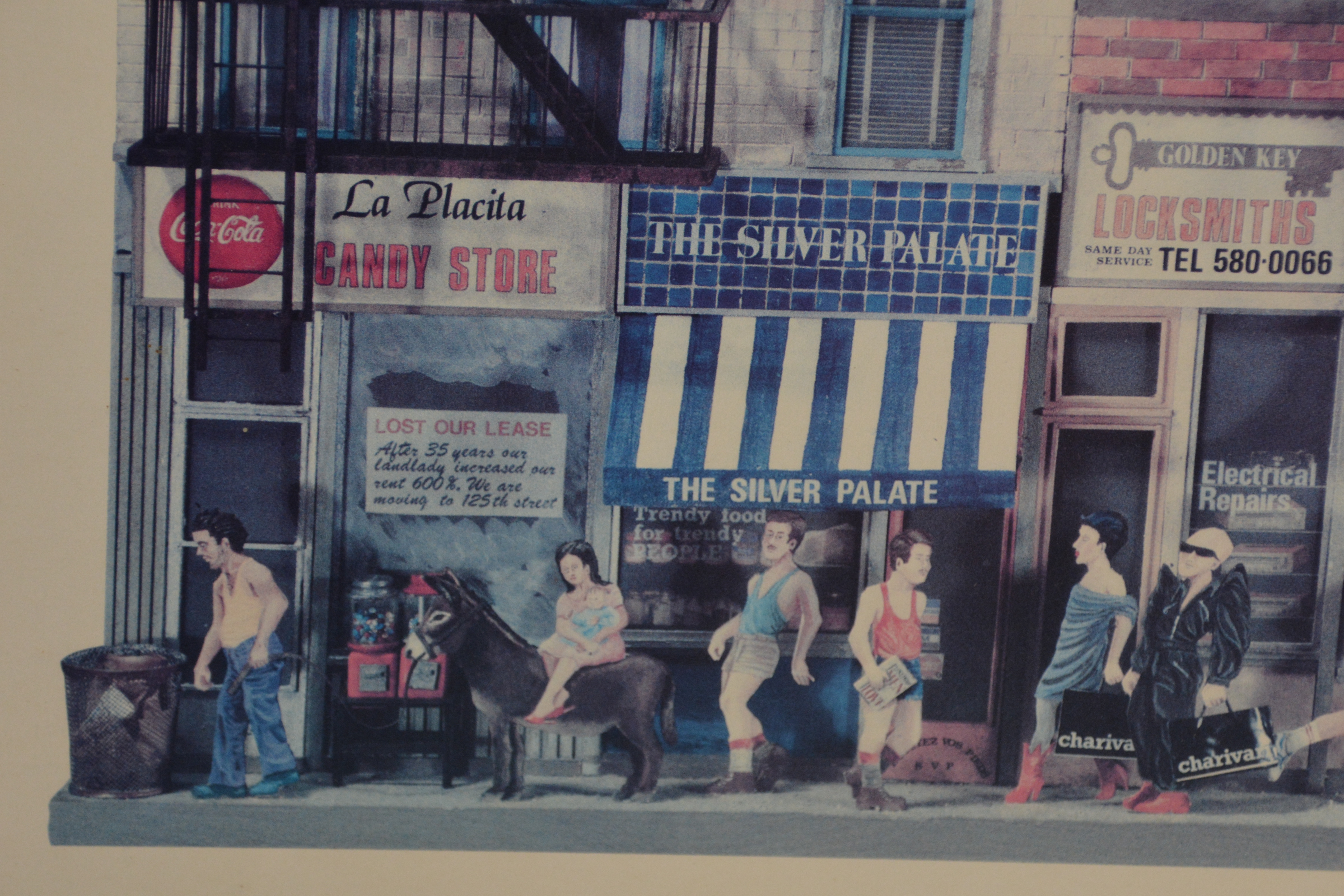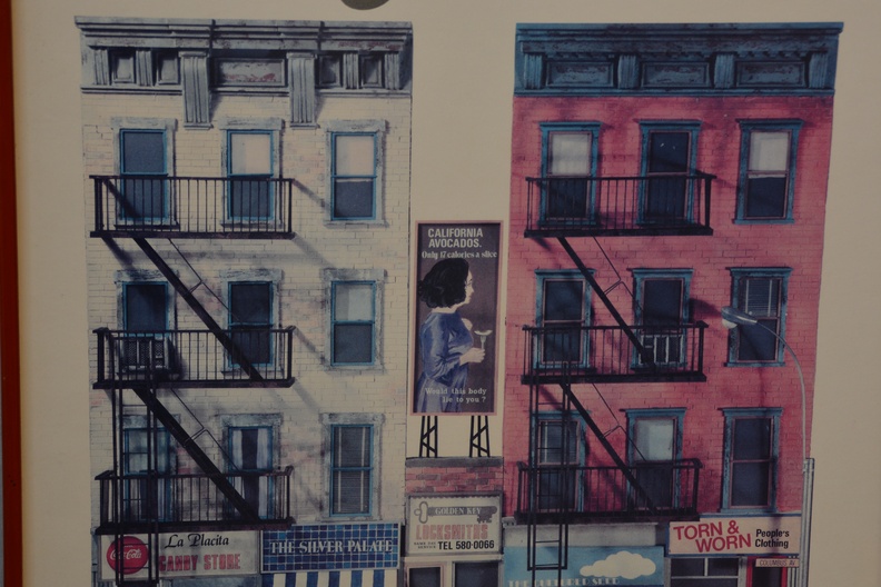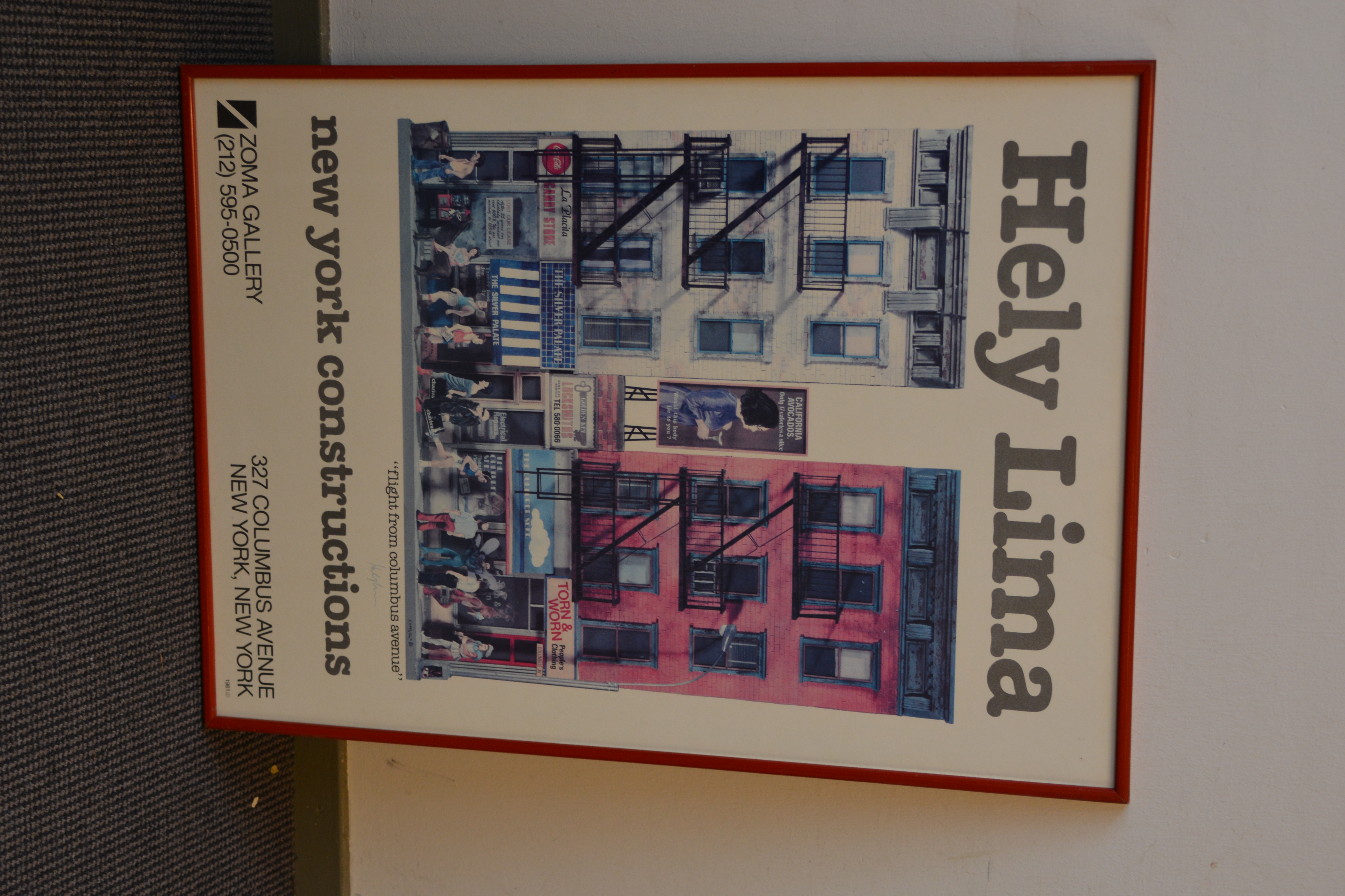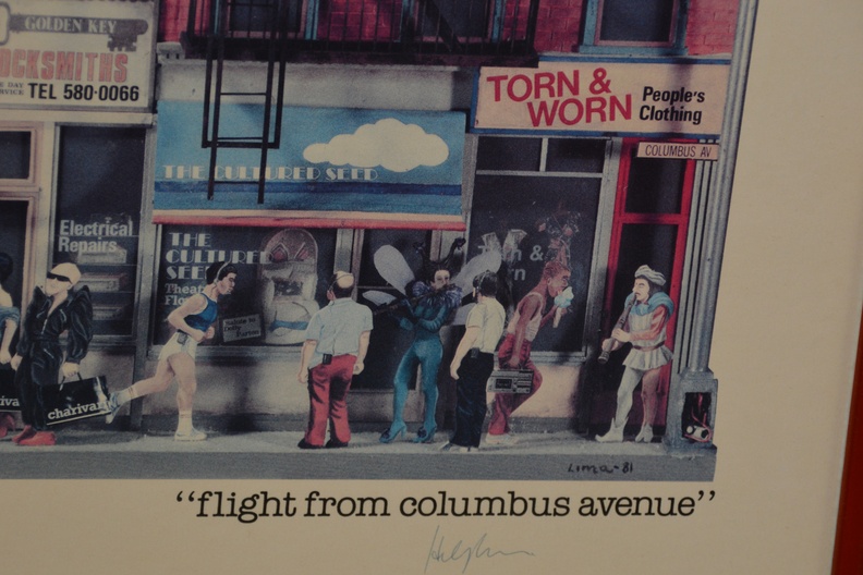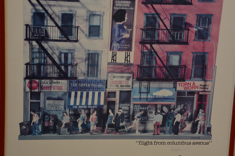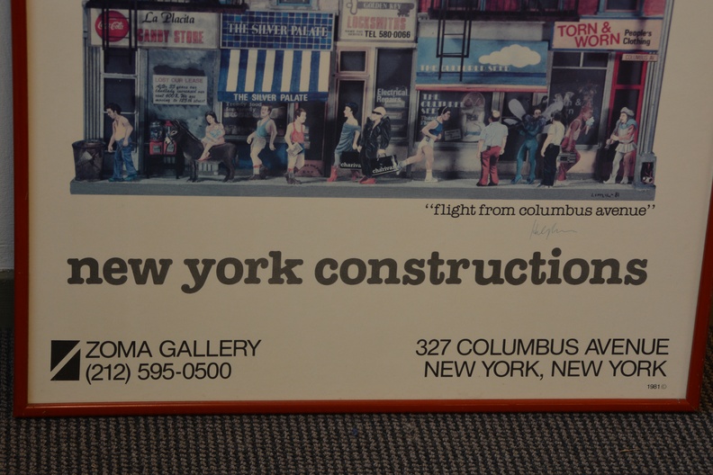 Van de kunstenaar Hely Lima, getiteld “New York Constructions”. Het toont een gedetailleerde illustratie van gevels van gebouwen aan Columbus Avenue in New York City. De poster is uitgegeven door de Zoma Gallery, gevestigd op 327 Columbus Avenue in New York. Het kunstwerk is oorspronkelijk gemaakt in 1981-1982. Hely Lima is een Braziliaans kunstenaar, gevestigd sinds 1970 in New York.