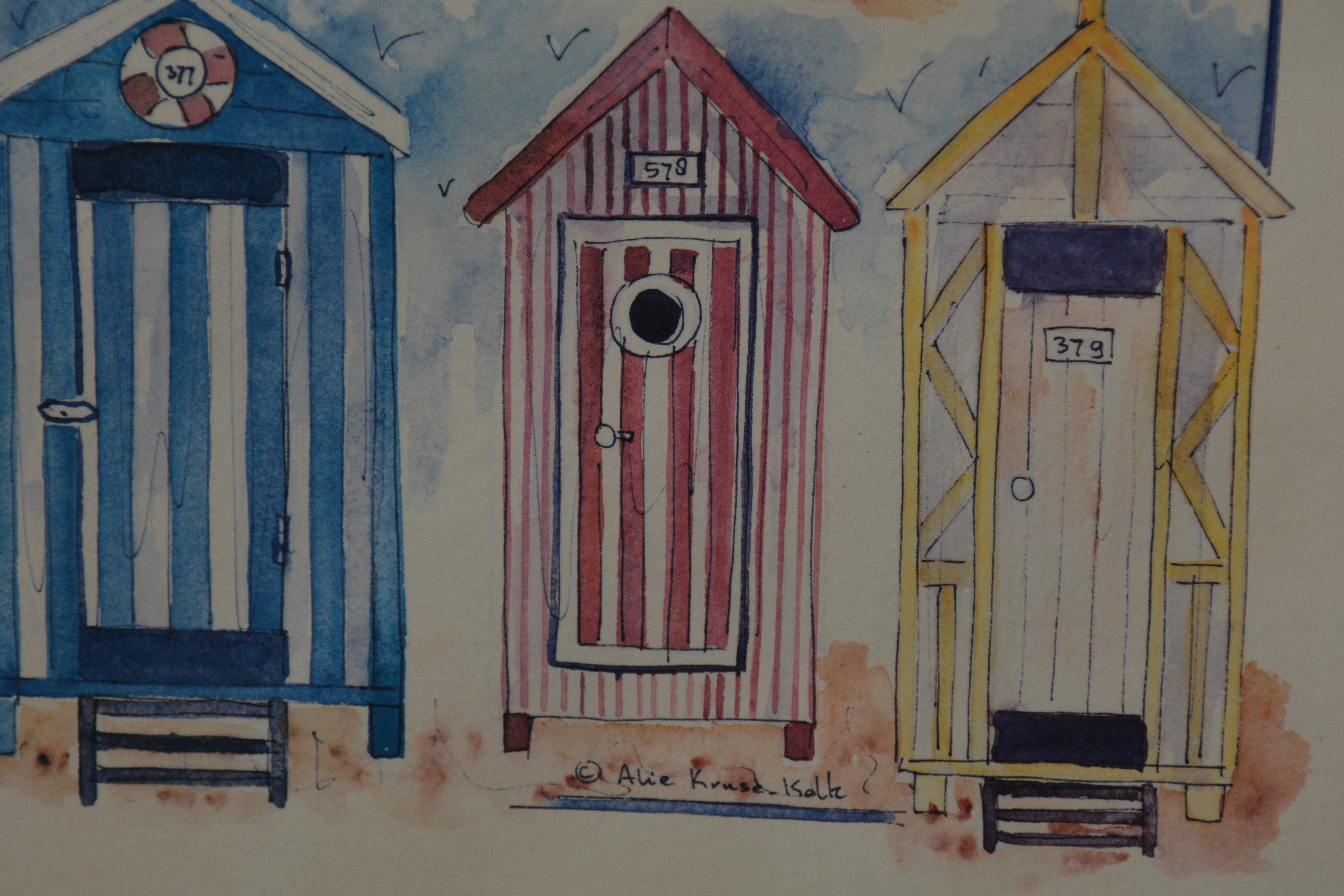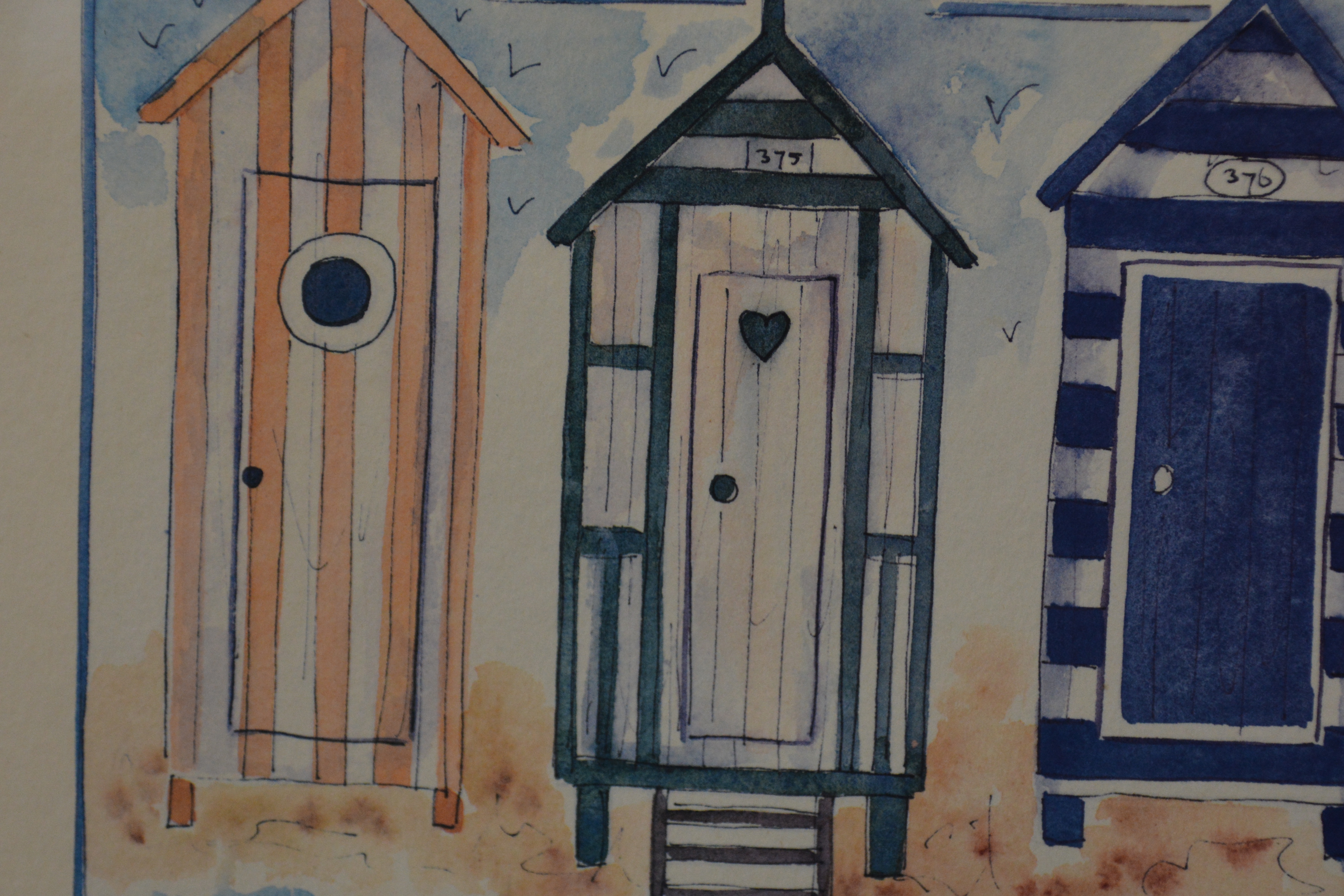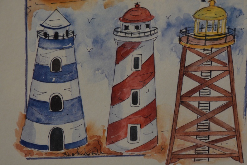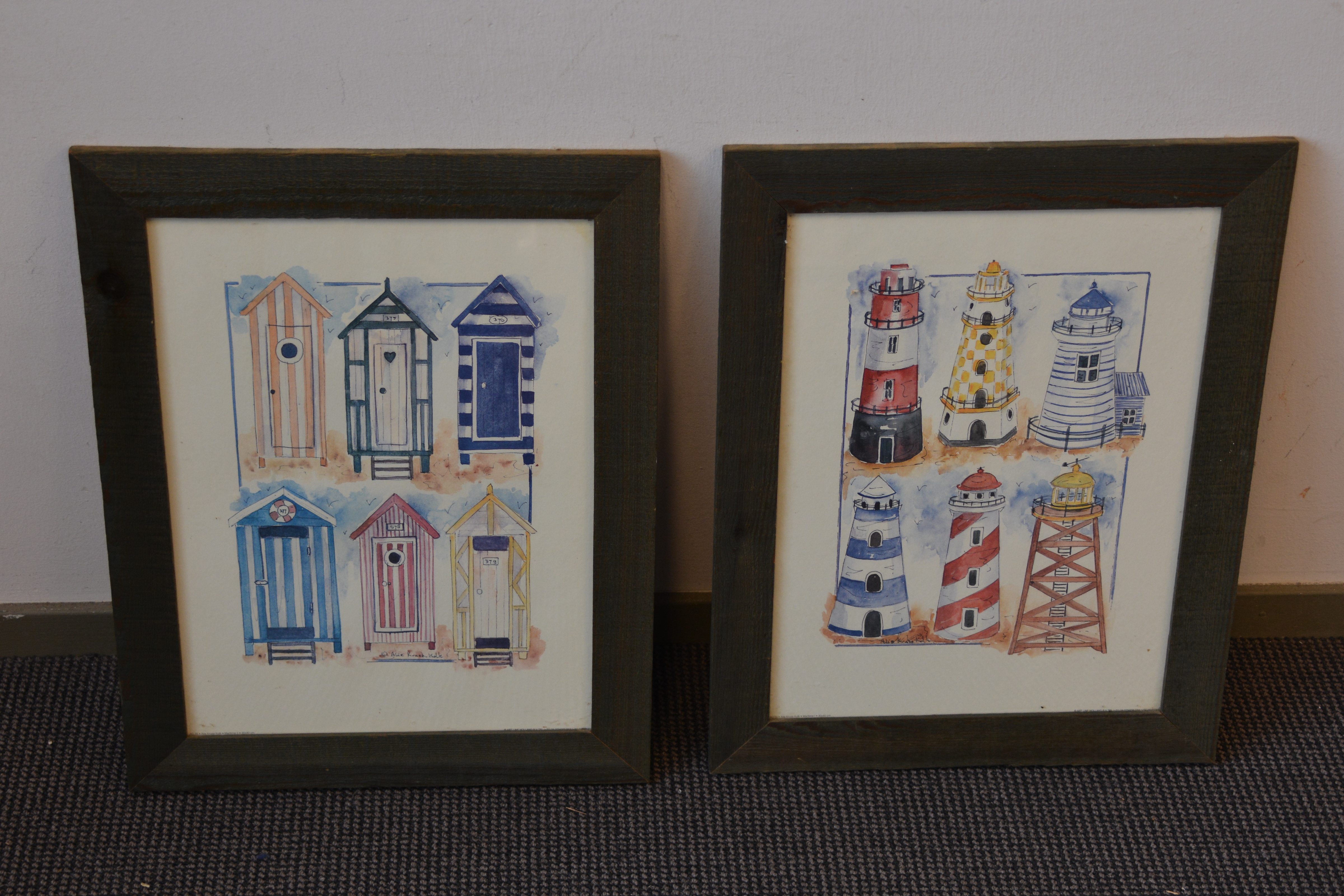 Kavel v 2 aquarellen: Strandhuisjes en vuurtorens