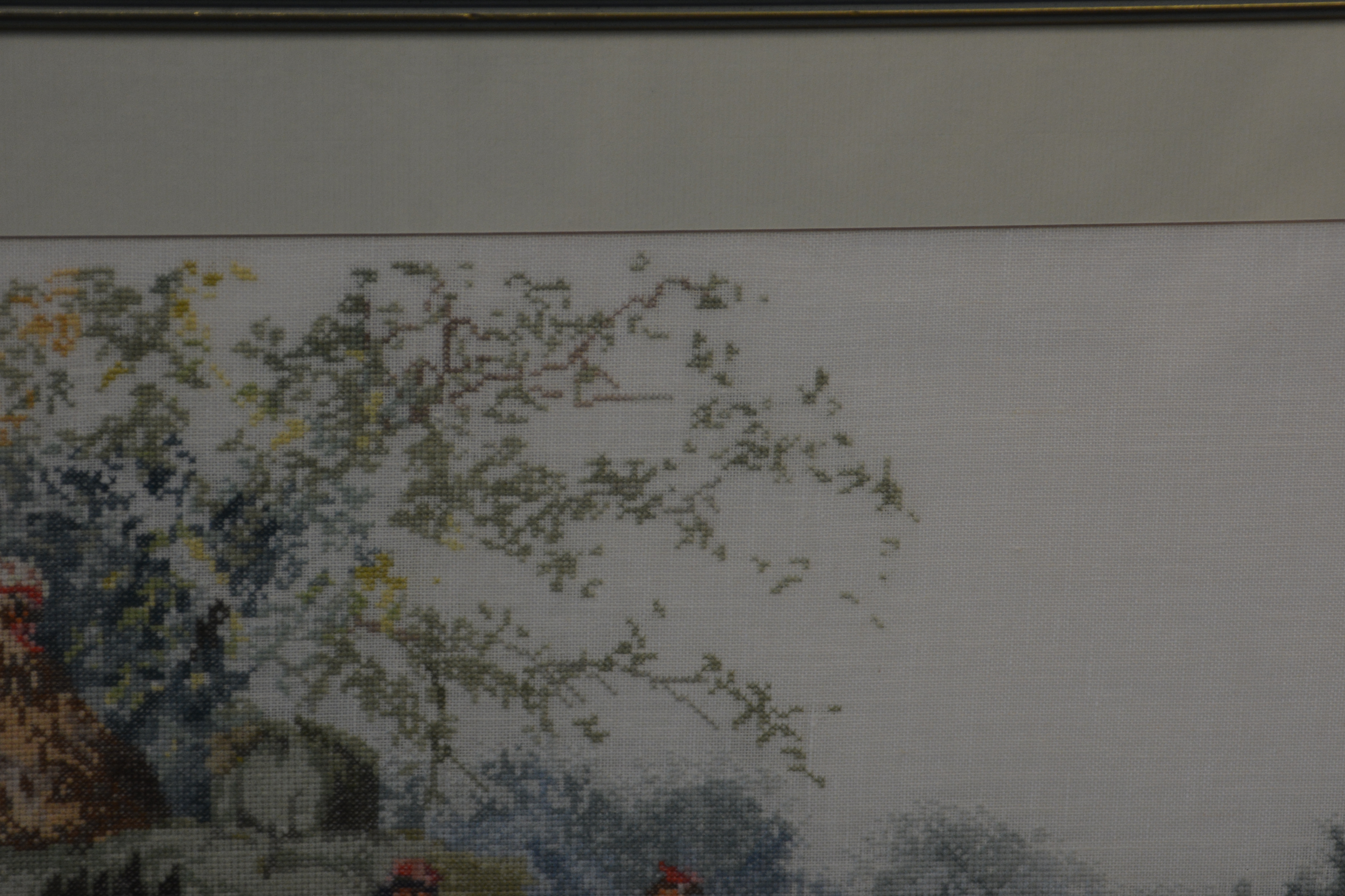 Zijde op linnen geborduurd. Mooi geborduurd. In zeer goede staat en ingelijst. Mooi lentewerk of om met Pasen op te hangen.