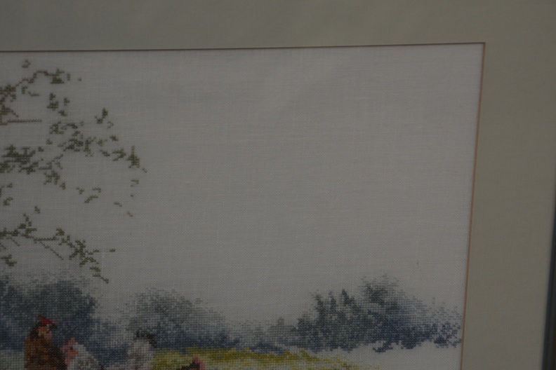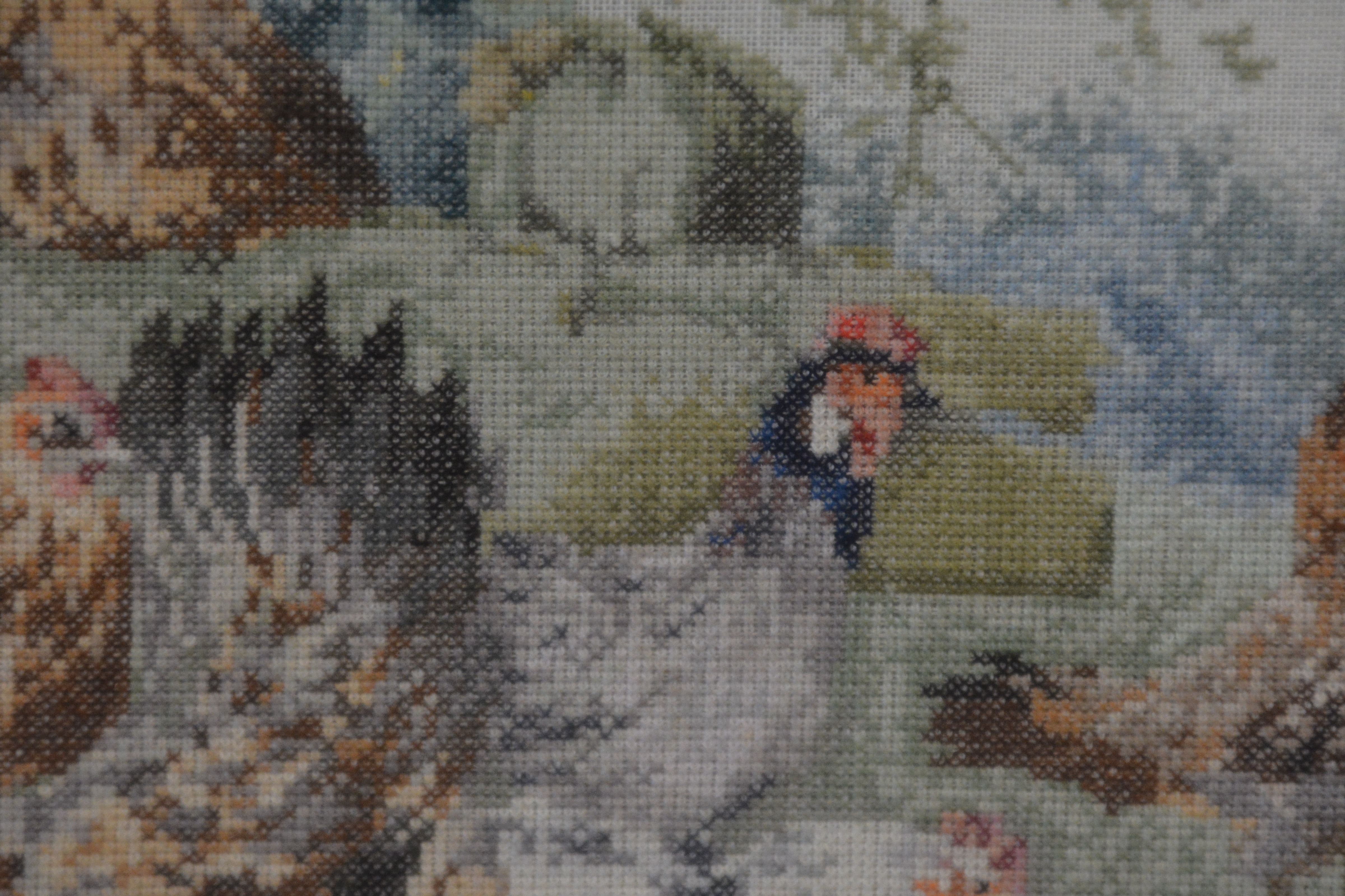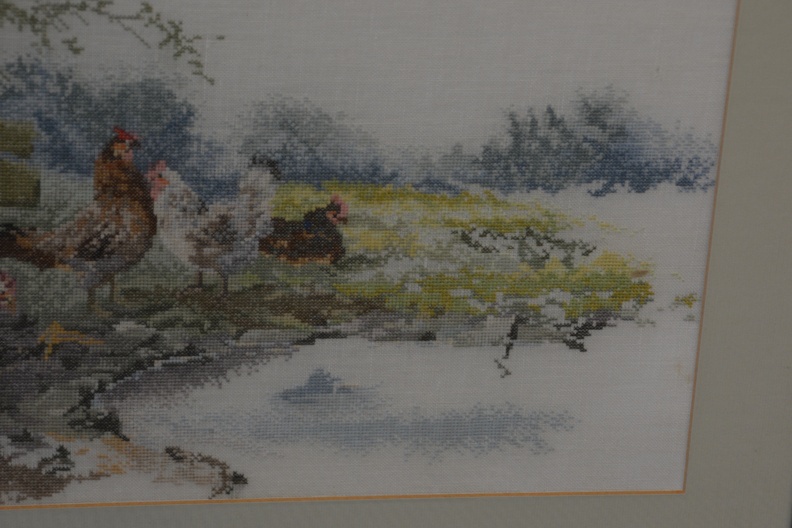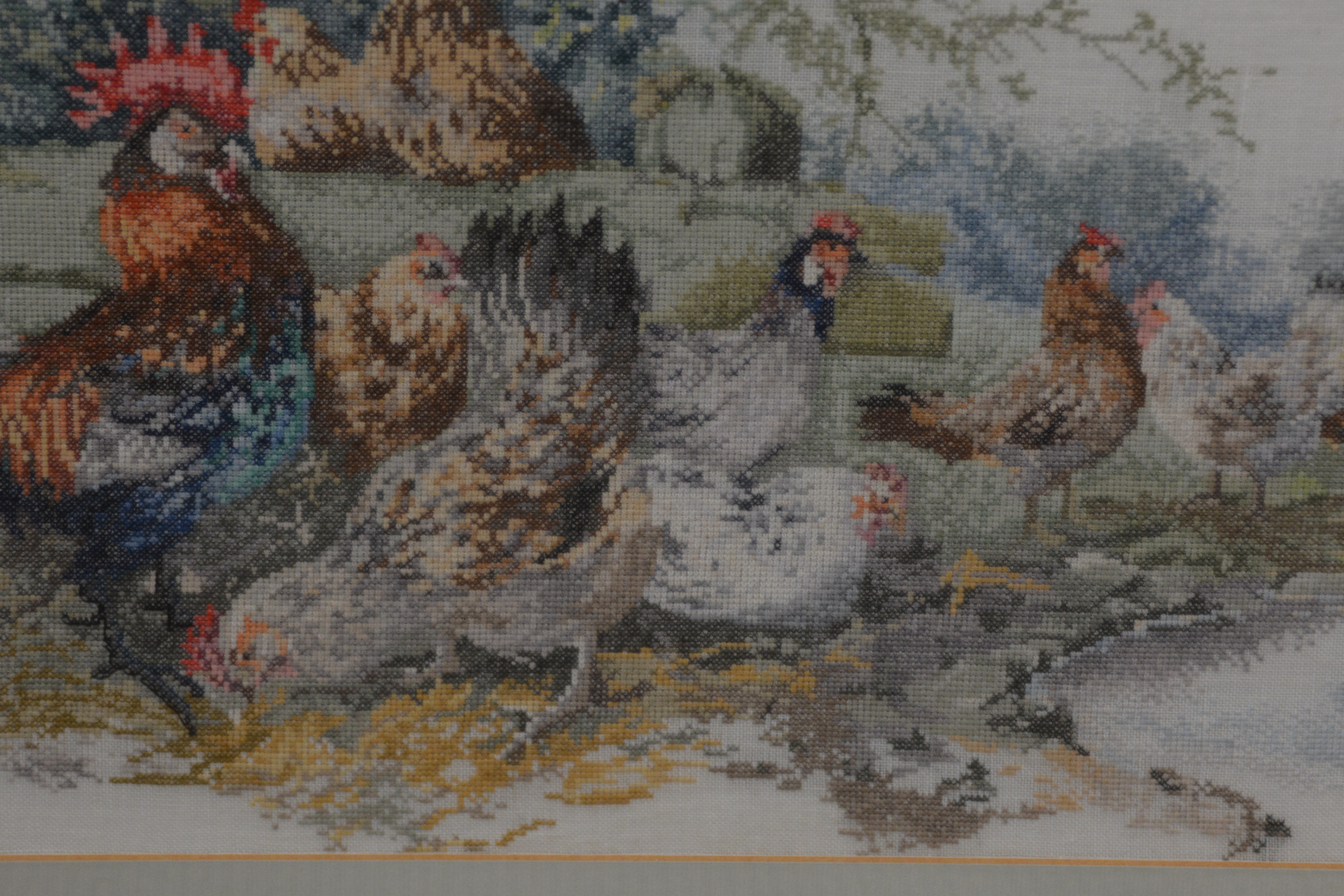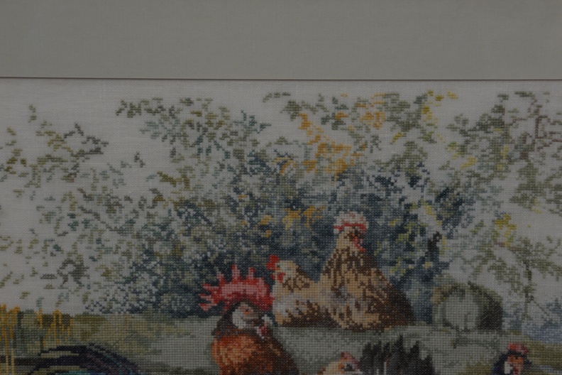 Naaldkunst. Geborduurde haan en kippen.