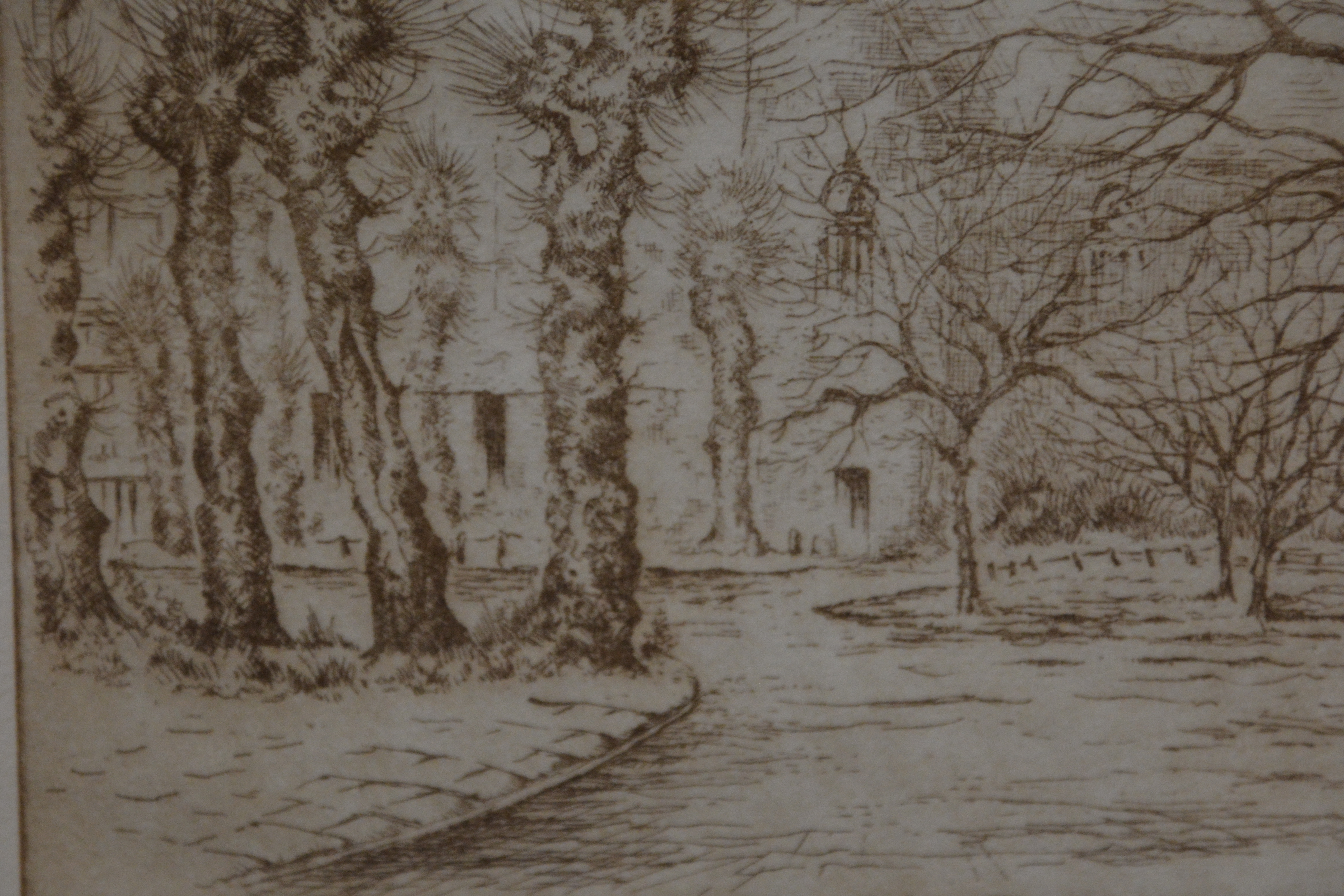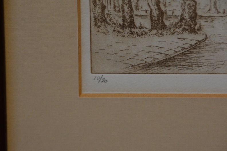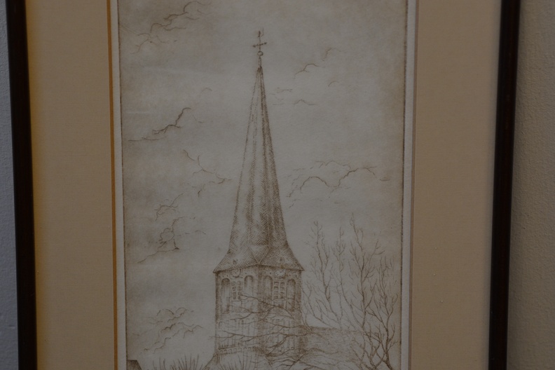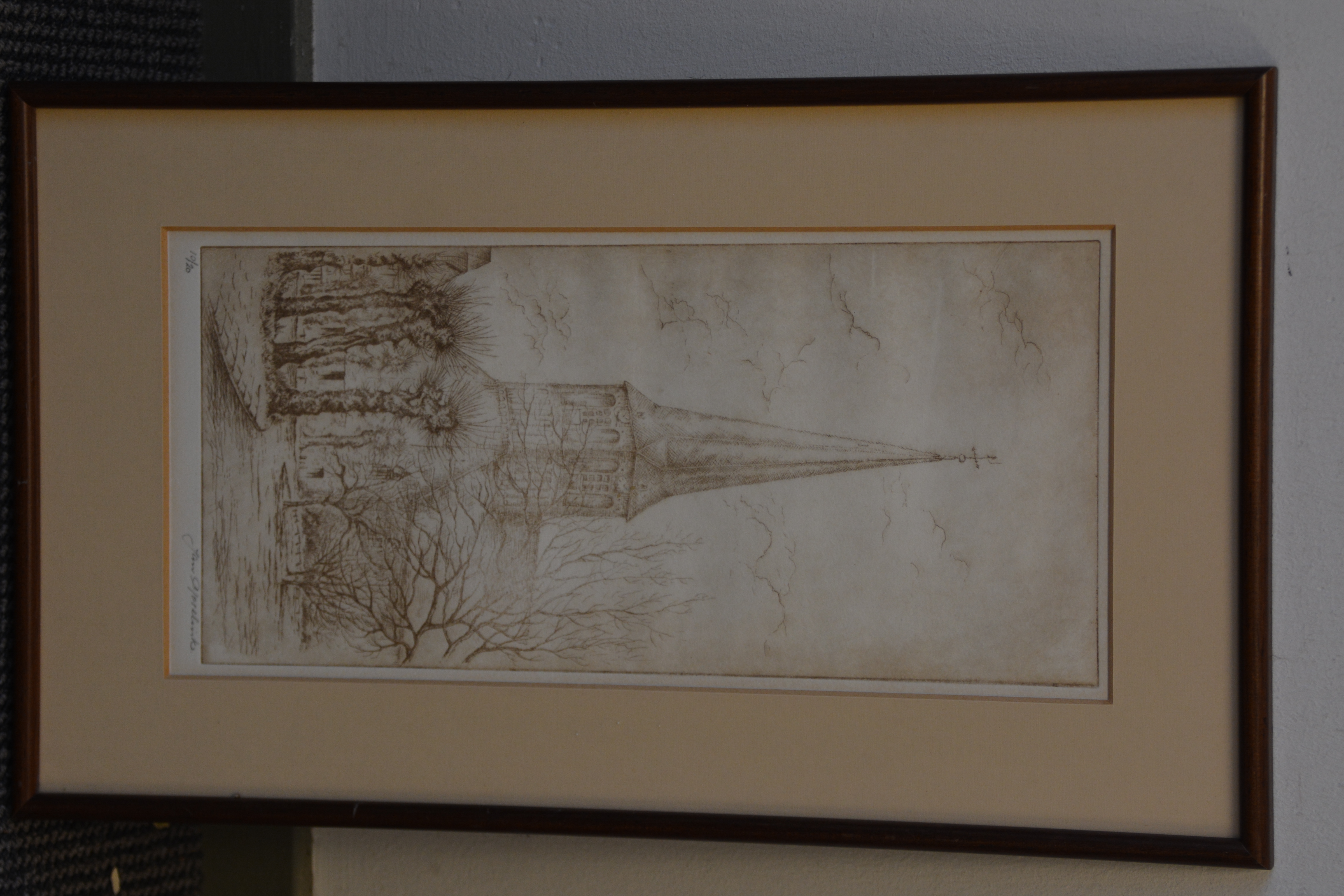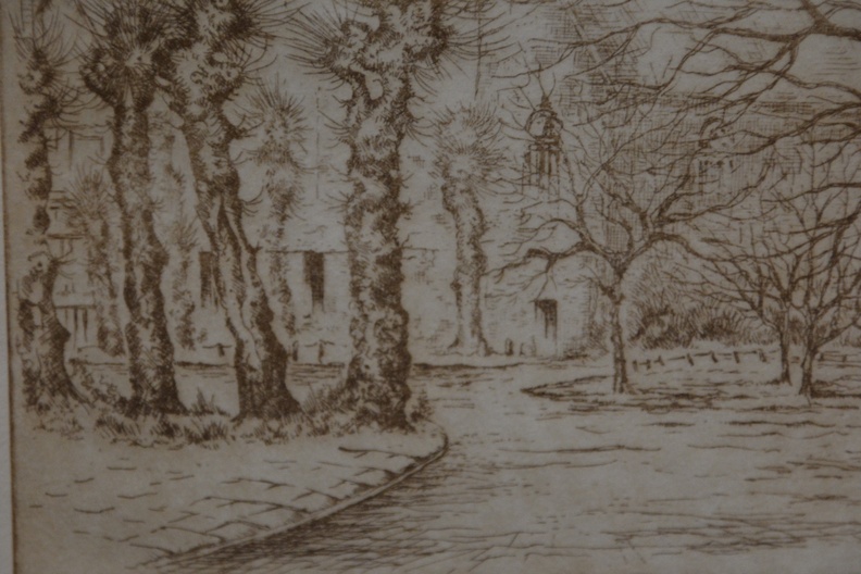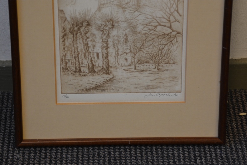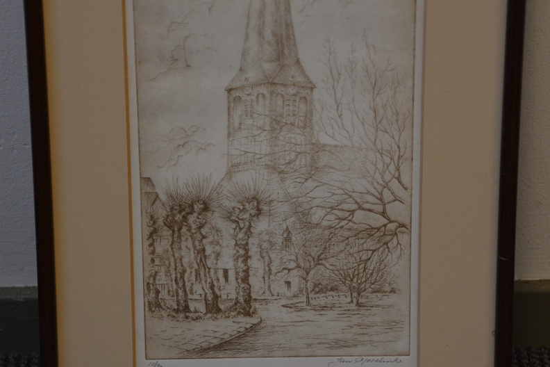 Origineel, no. 10/20 stuks. Jan Goselink geboren in 1928 in Collendoorn (Hardenberg), aquarellist, etser, schilder. Na zijn lerarenopleiding nam Jan Goselink tekenlessen en behaalde de L.O.-akte tekenen. Hij is echter altijd werkzaam geweest als docent wiskunde en maakte zijn tekeningen, etsen, aquarellen, gouaches en olieverfschilderijen in zijn vrije tijd. Hij heeft een voorkeur voor onderwerpen dicht bij huis en vooral de natuur, dier en plant, is voor hem een inspiratiebron. Voor het werk van de schilder en illustrator Anton Pieck heeft hij grote bewondering en dat heeft invloed gehad op zijn werk. De oorspronkelijhke kerk stond aan de zeedijk langs de Zuiderzee, maar werd na stormschade en brand in 1825 afgebroken. Ingelijst en onder een passe-partout. In goede staat.