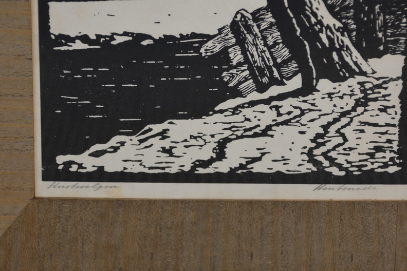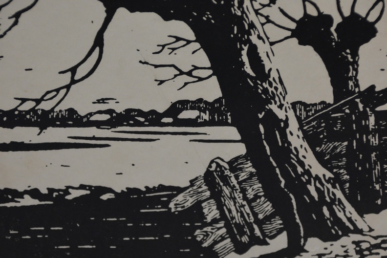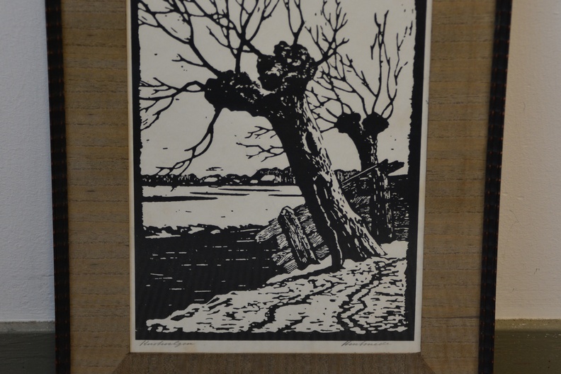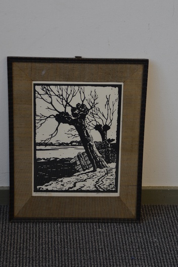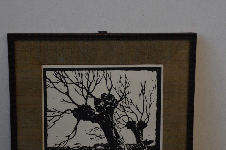 Dit is een houtsnede met als onderwerp knotwilgen, gemaakt door kunstenaar Ed Jeska, rond 1930. Hij was bekend om zijn houtsneden van landschappen en bomen. Het werk toont een karakteristiek Nederlands landschap met knotwilgen, vaak in rustieke of winterse setting. Jan Staats Kiewiet, gebruikte het pseudoniem Ed Jeska. Arnhem 1899 - Den Haag 1977. Autodidact. Oprichter en directeur van de Academie van Beeldende Kunsten in Den Haag.In goede staat.