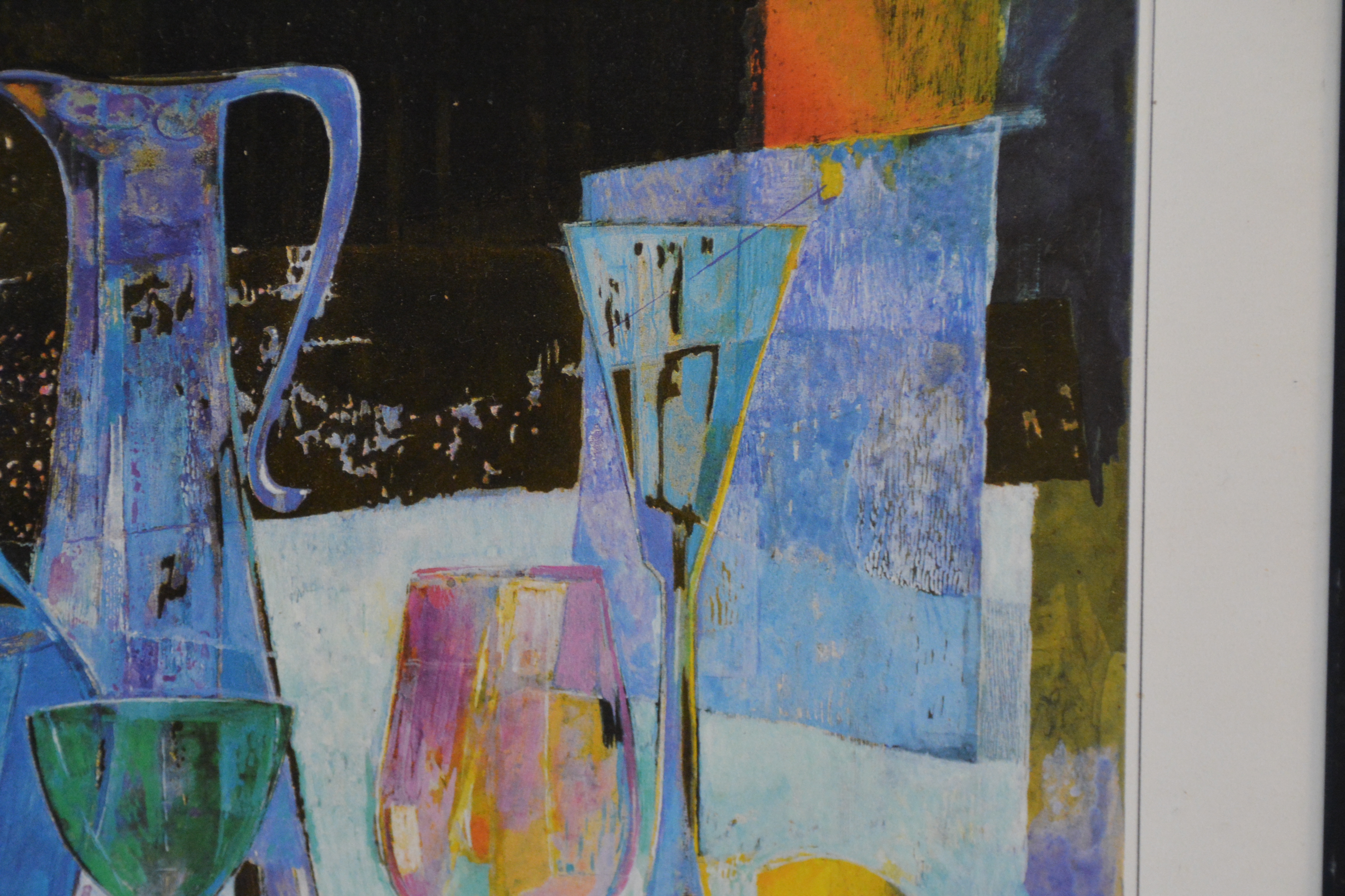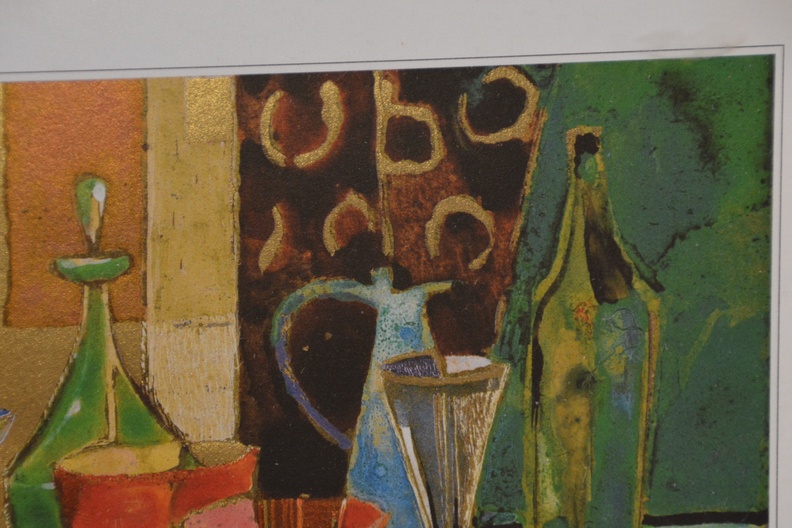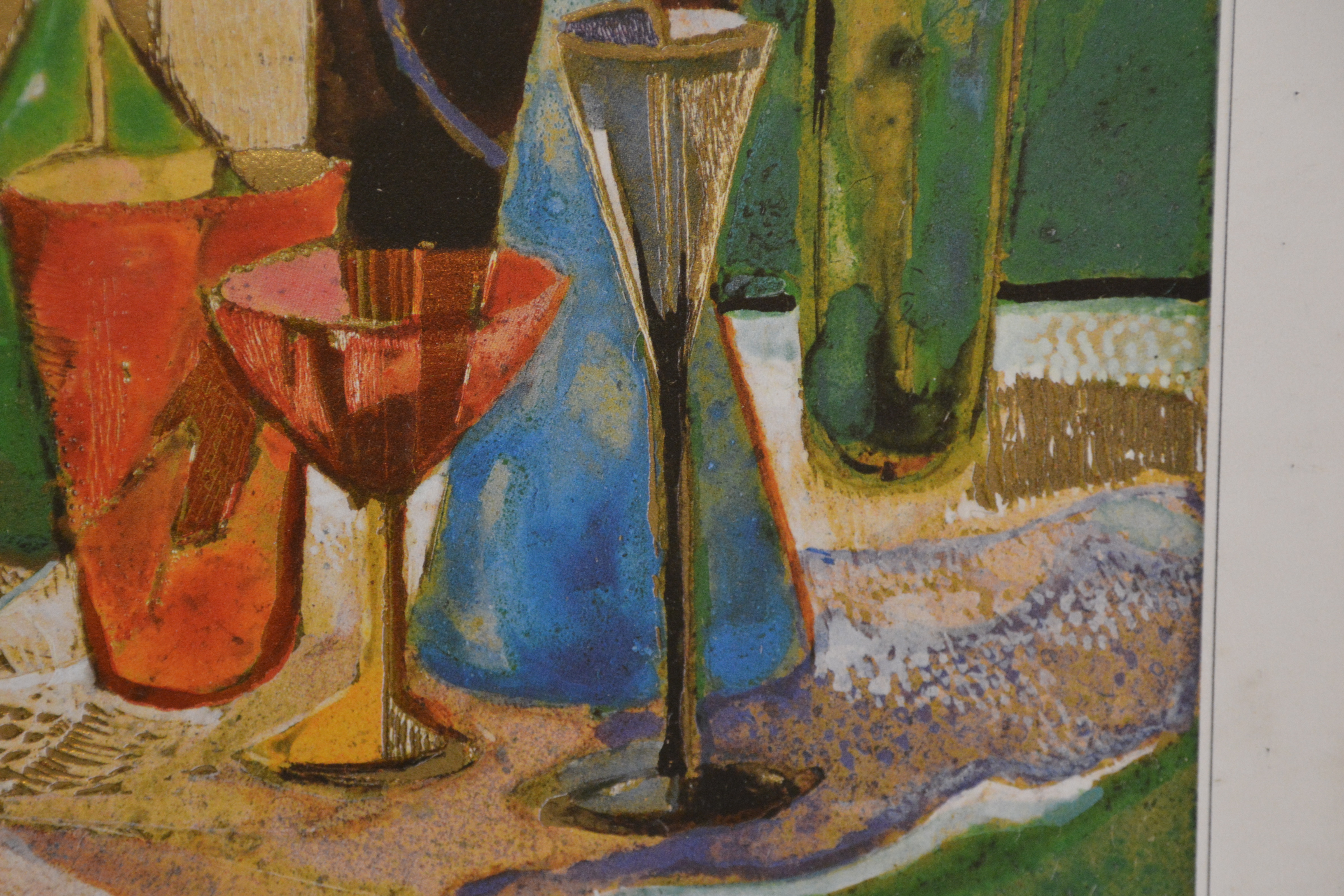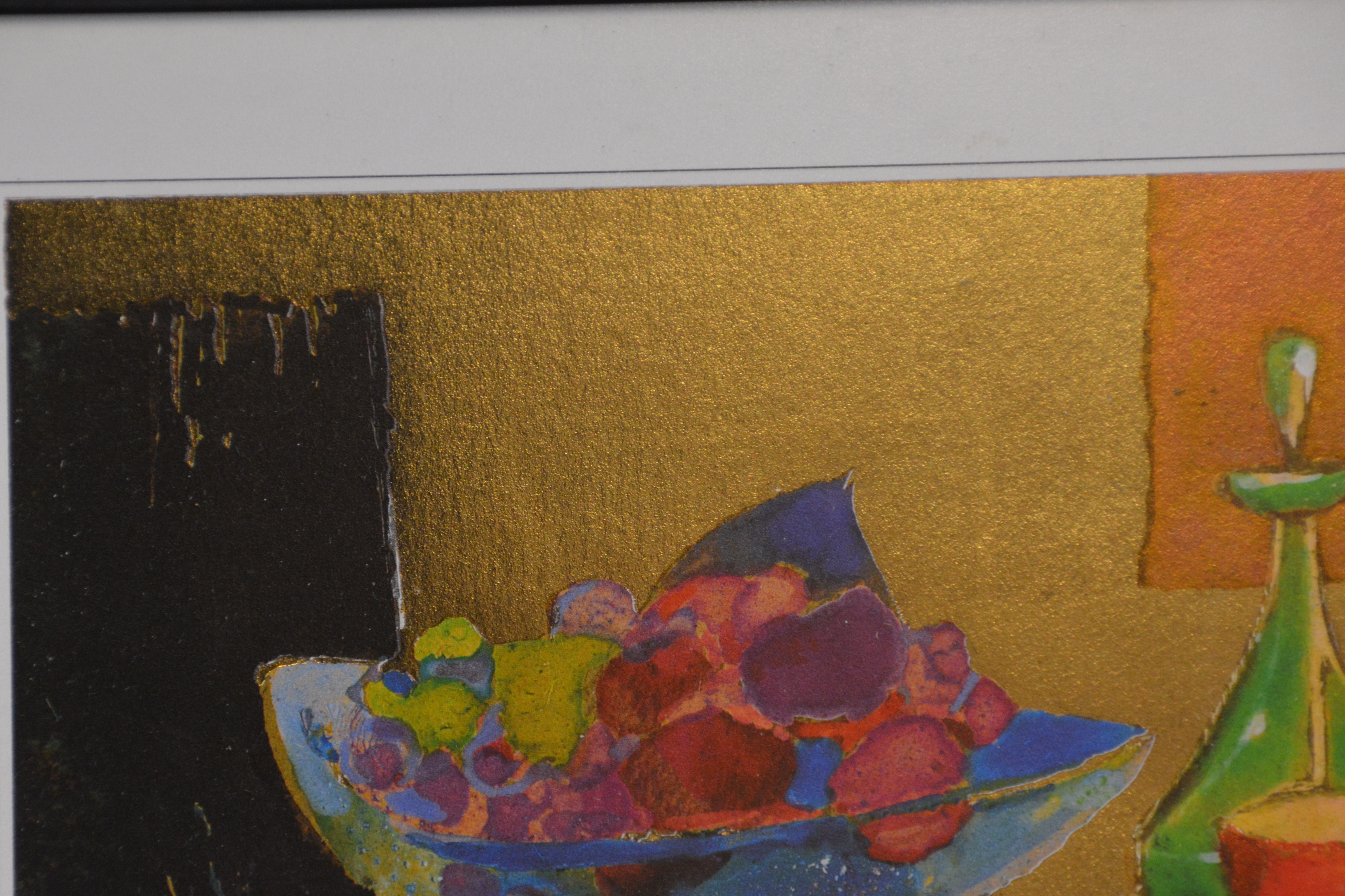 2 Ingelijst artprints. Goudkleurige achtergronden. Vrolijk en kleurig werk. In goede staat.
