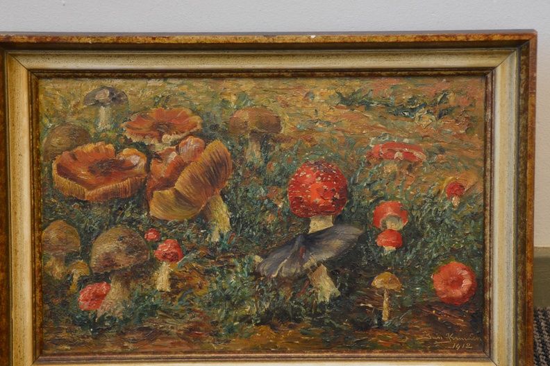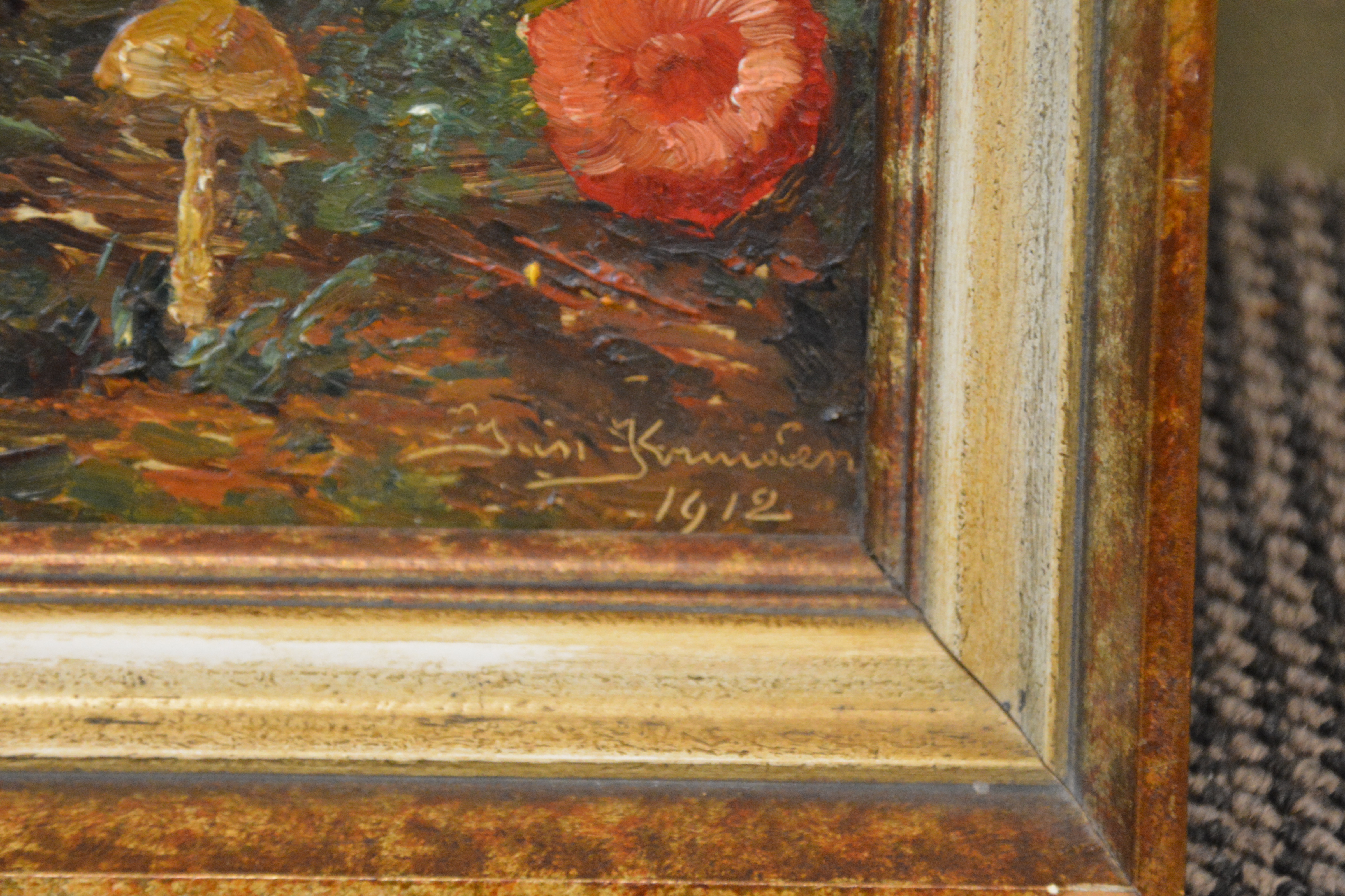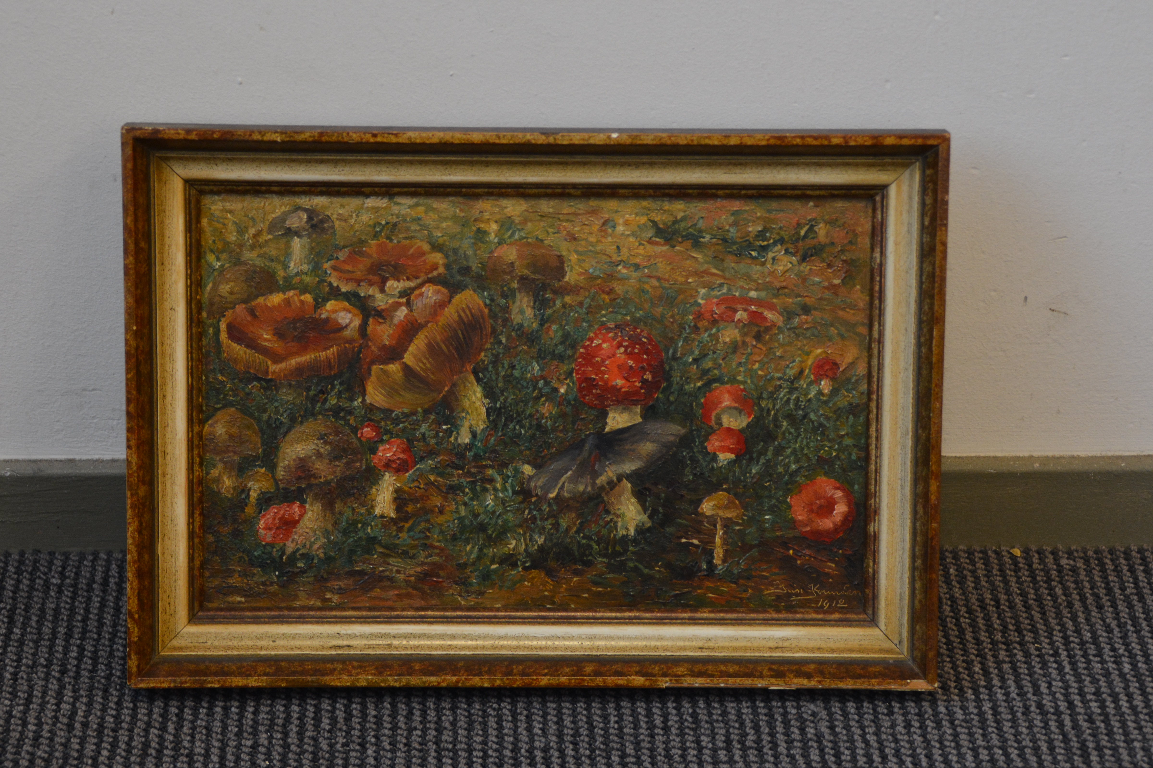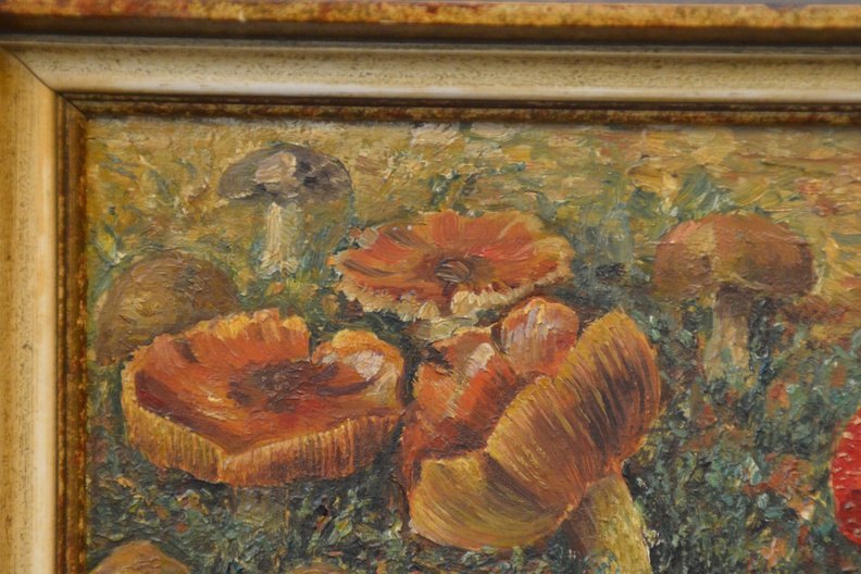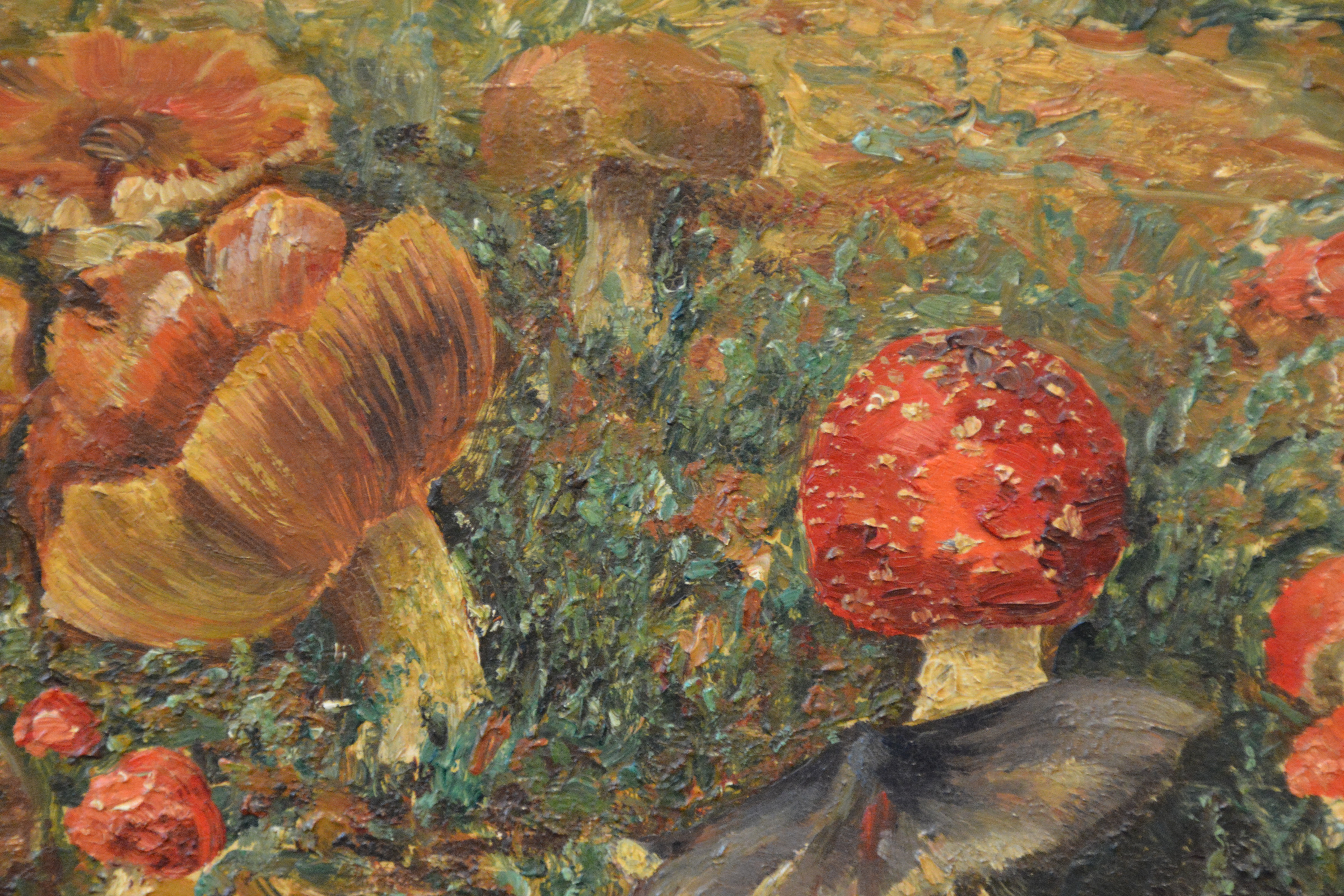 Prachtig geschilderd olieverfschilderij van Jan Kruidenier uit 1912. Het is een herfstlandschap met diverse soorten paddestoelen. Dik opgezet, in goede staat. Jan Kruidenier, geboren in Rotterdam 1874, Overleden Apeldoorn 1948. Opleiding: Rijksschool voor Kunstnijverheid (Amsterdam) · Werkzaam in Rotterdam (stad).