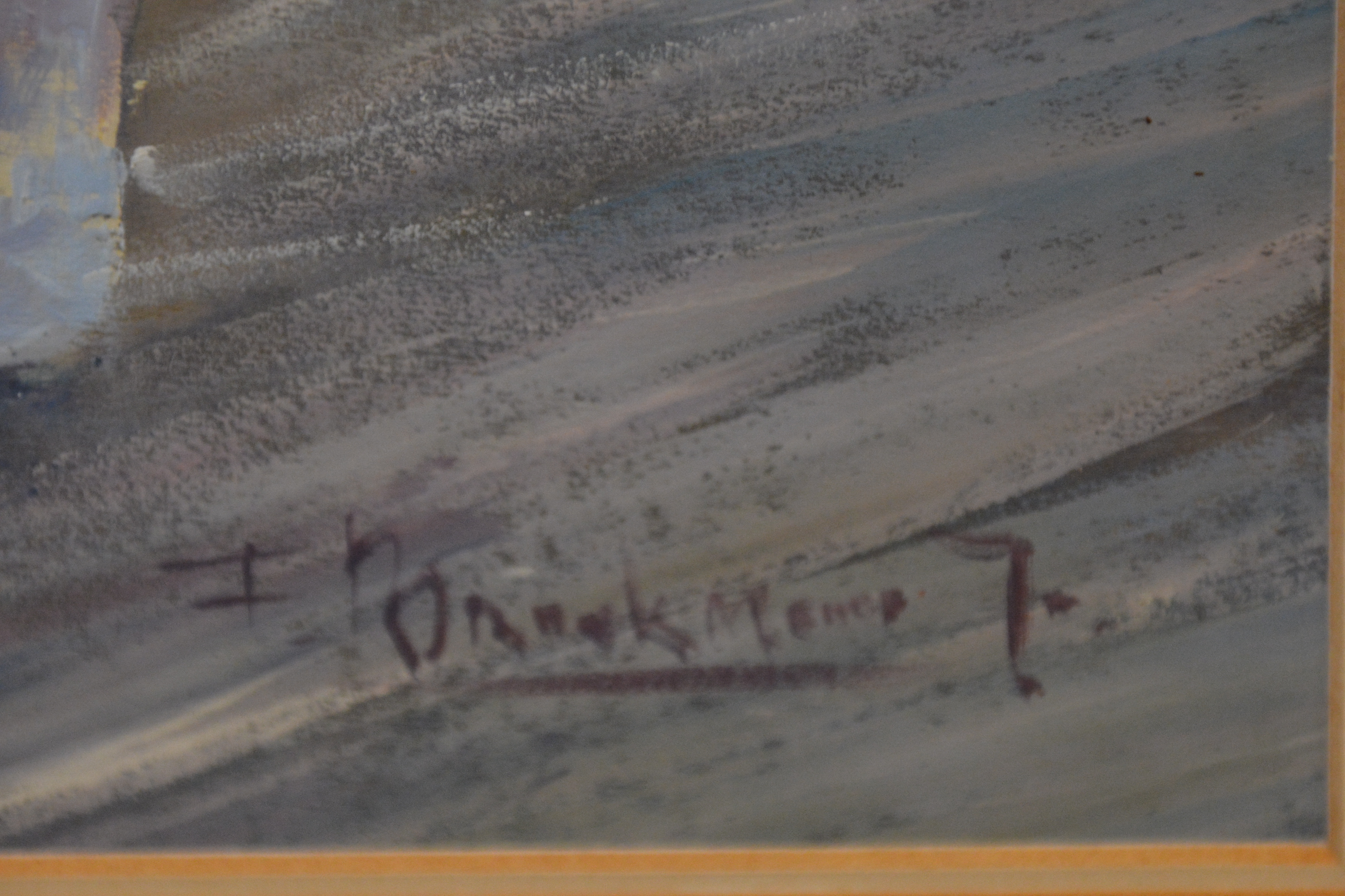 Graai schilderij gemaakt met verf en krijt van een tuinkamer of een terraskamer. Vervaardigd door I. Broekmans jr. Ingelijst en in goede staat.