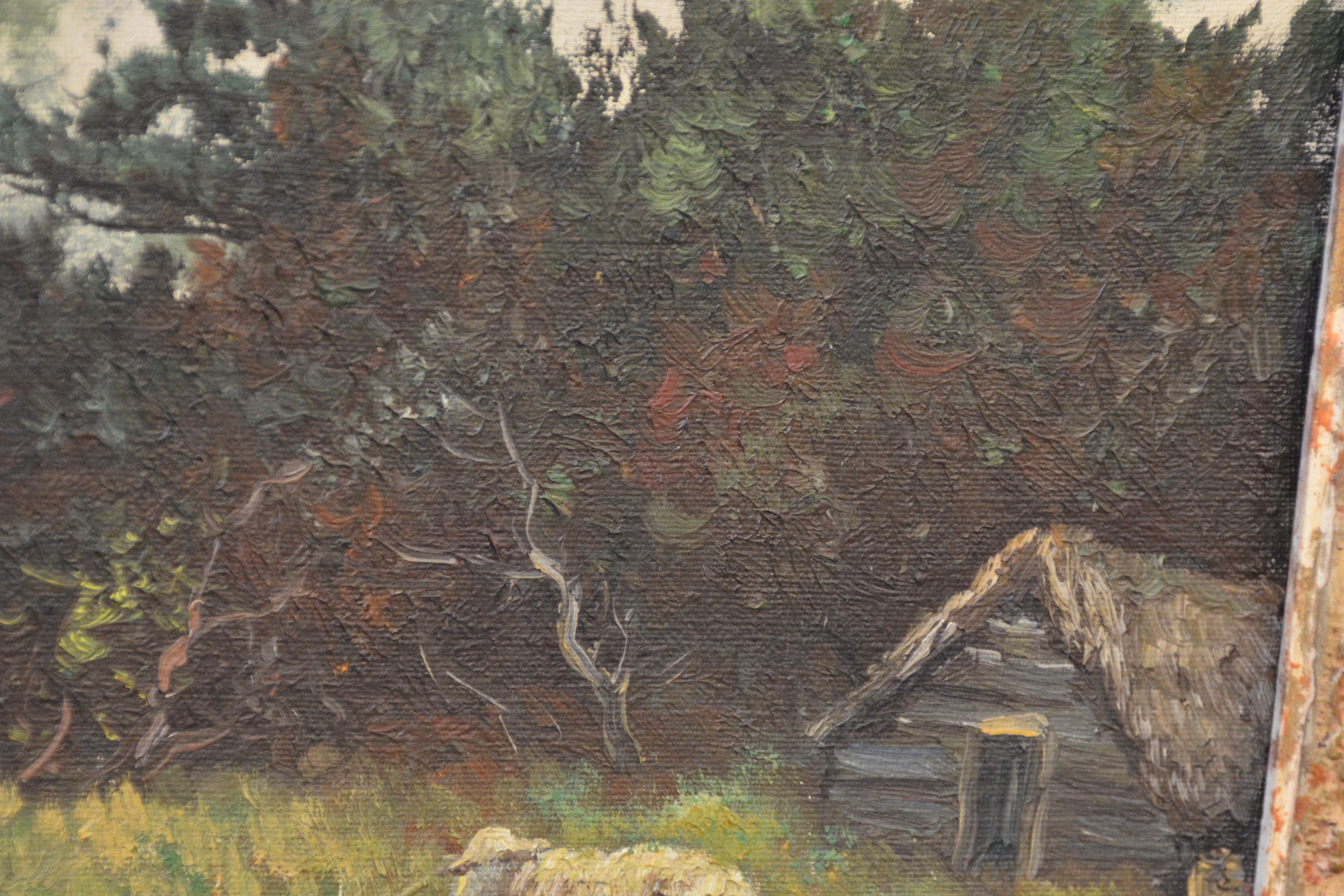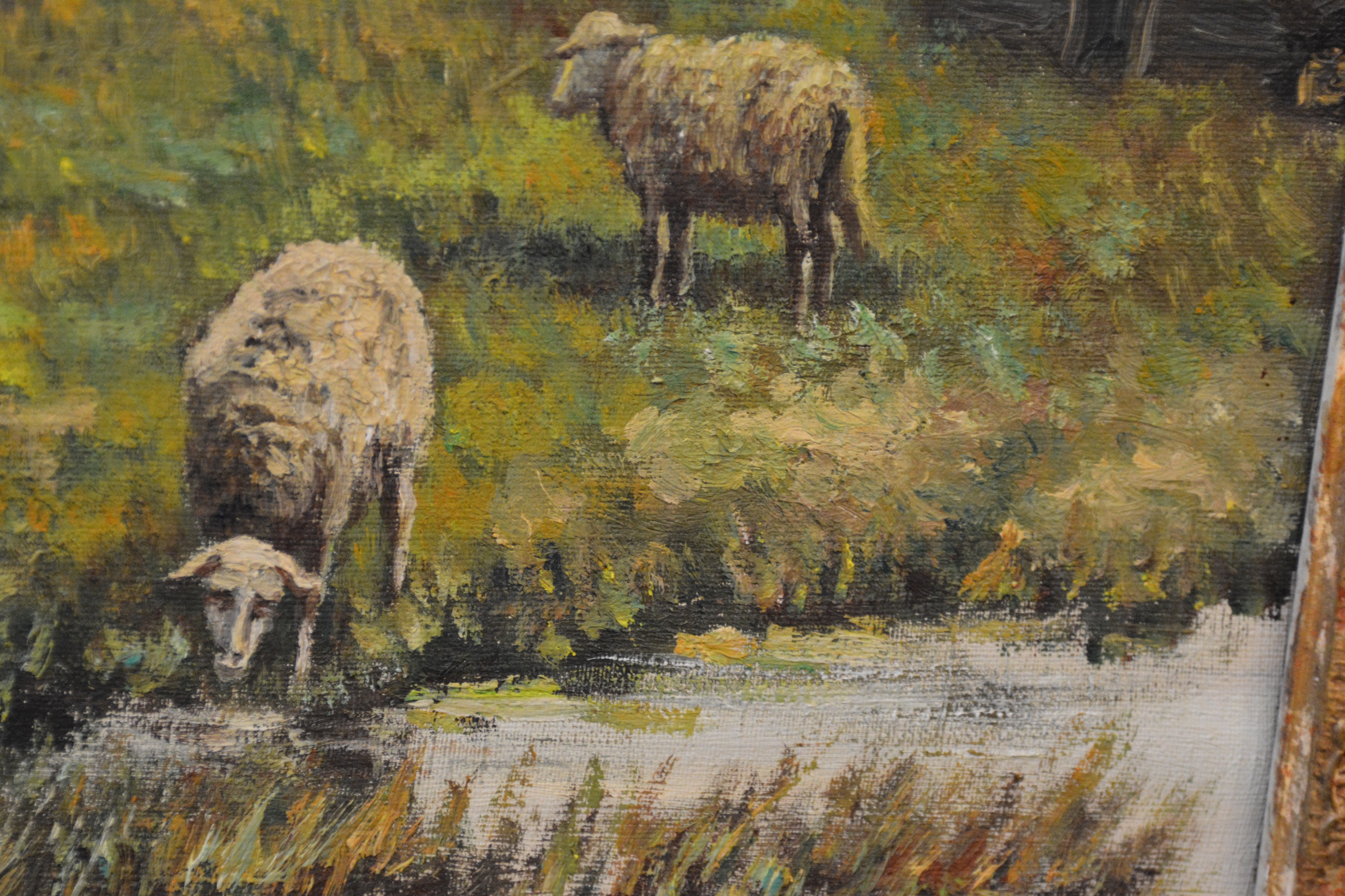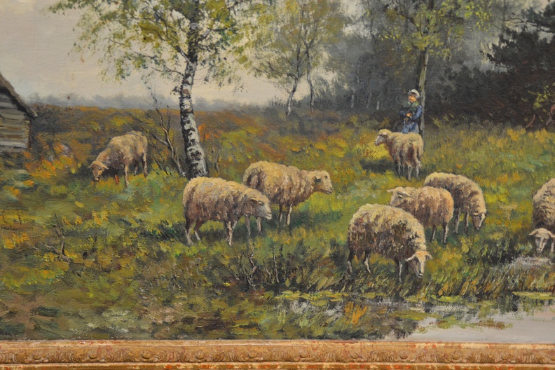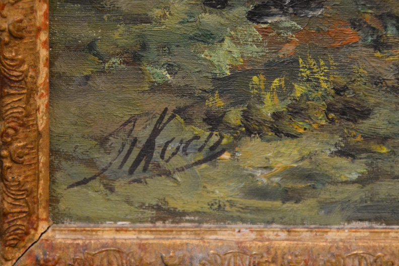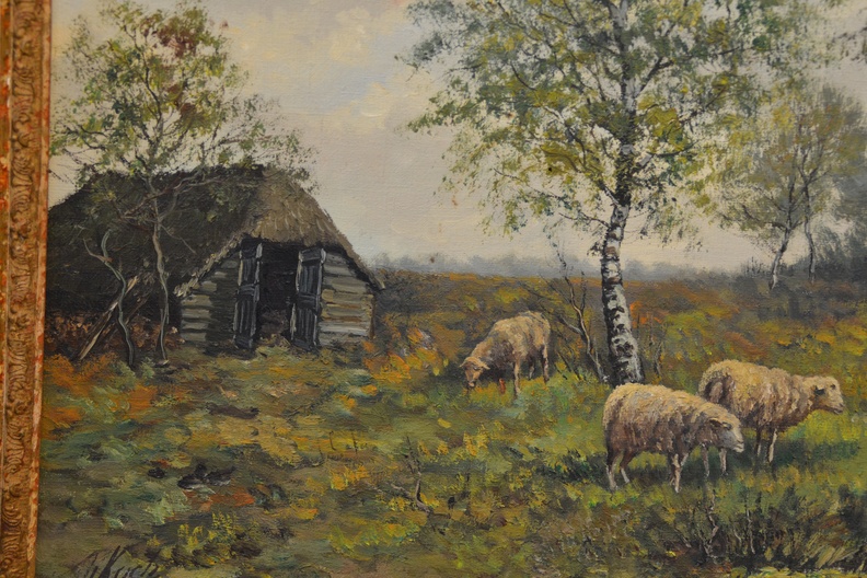 Signatuur is niet duidelijk: Kan J.I. Koch zijn of M. Kock. Het werk is een olieverfschilderij met lijst. We zien een boerderij met schapen. Ik vermoed van rond 1900-1930. Olieverf op doek. In goede staat. Fraaie lijst maar wel wat verbleekt.