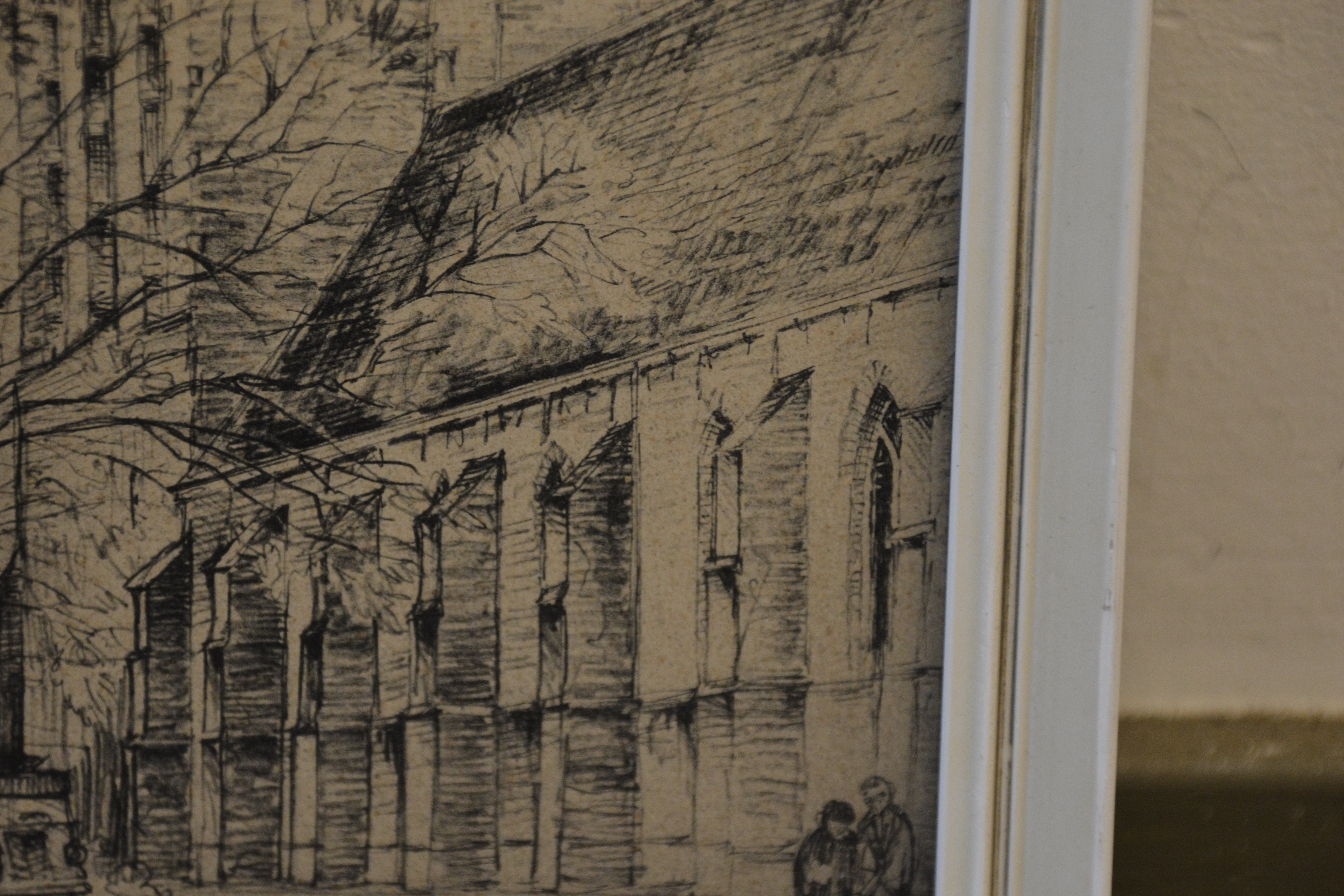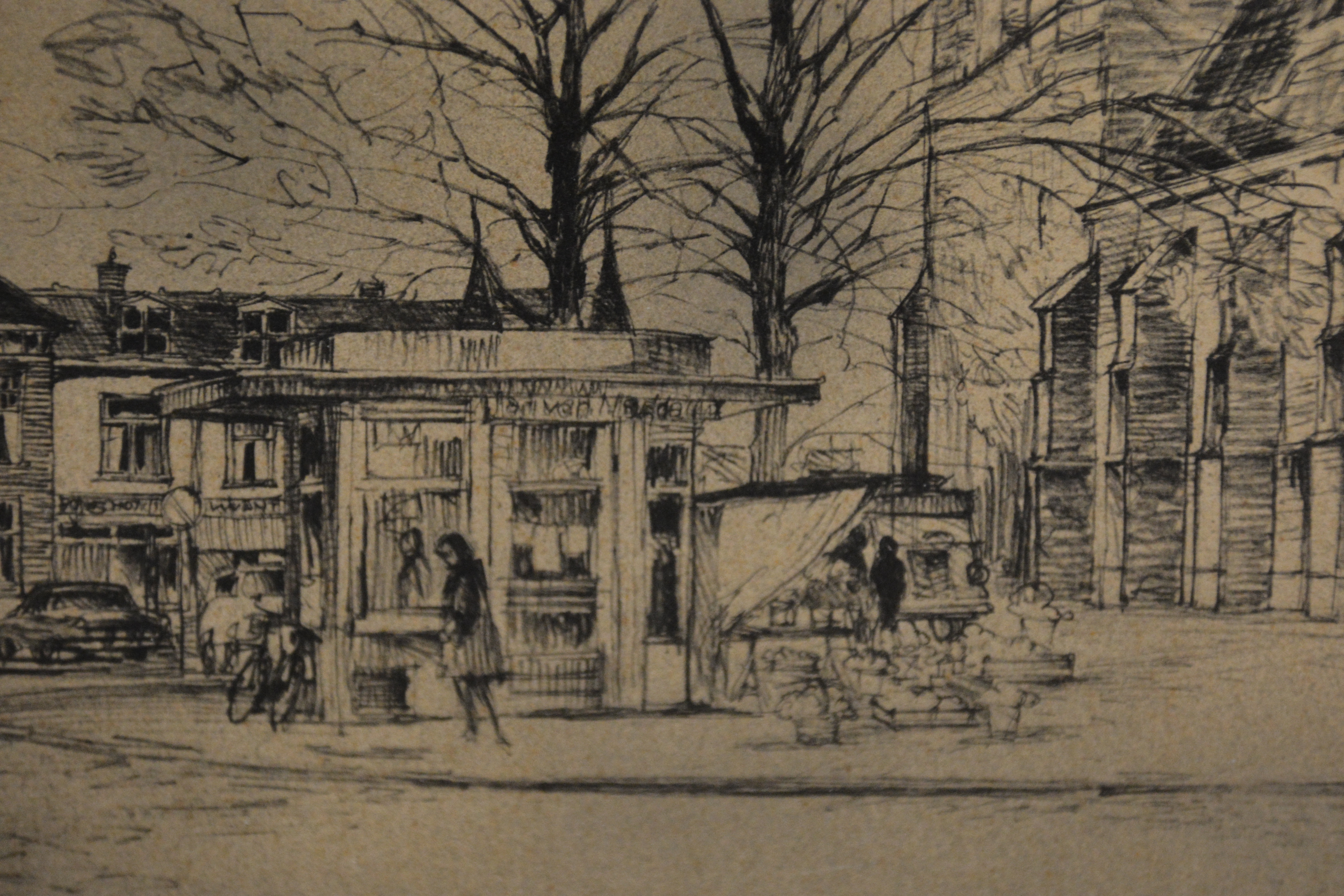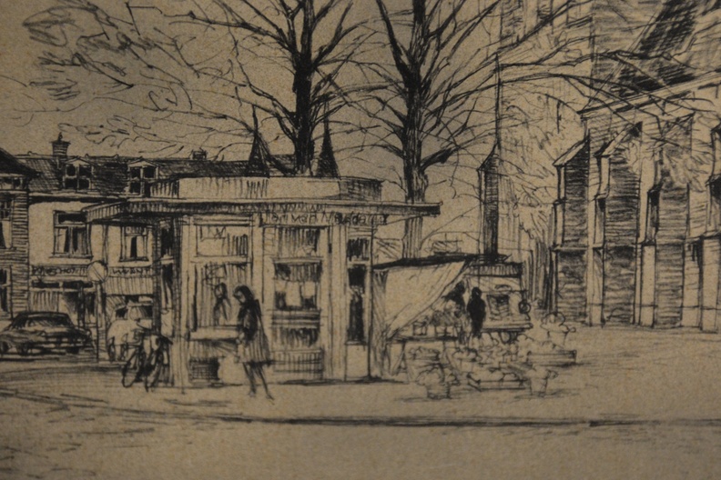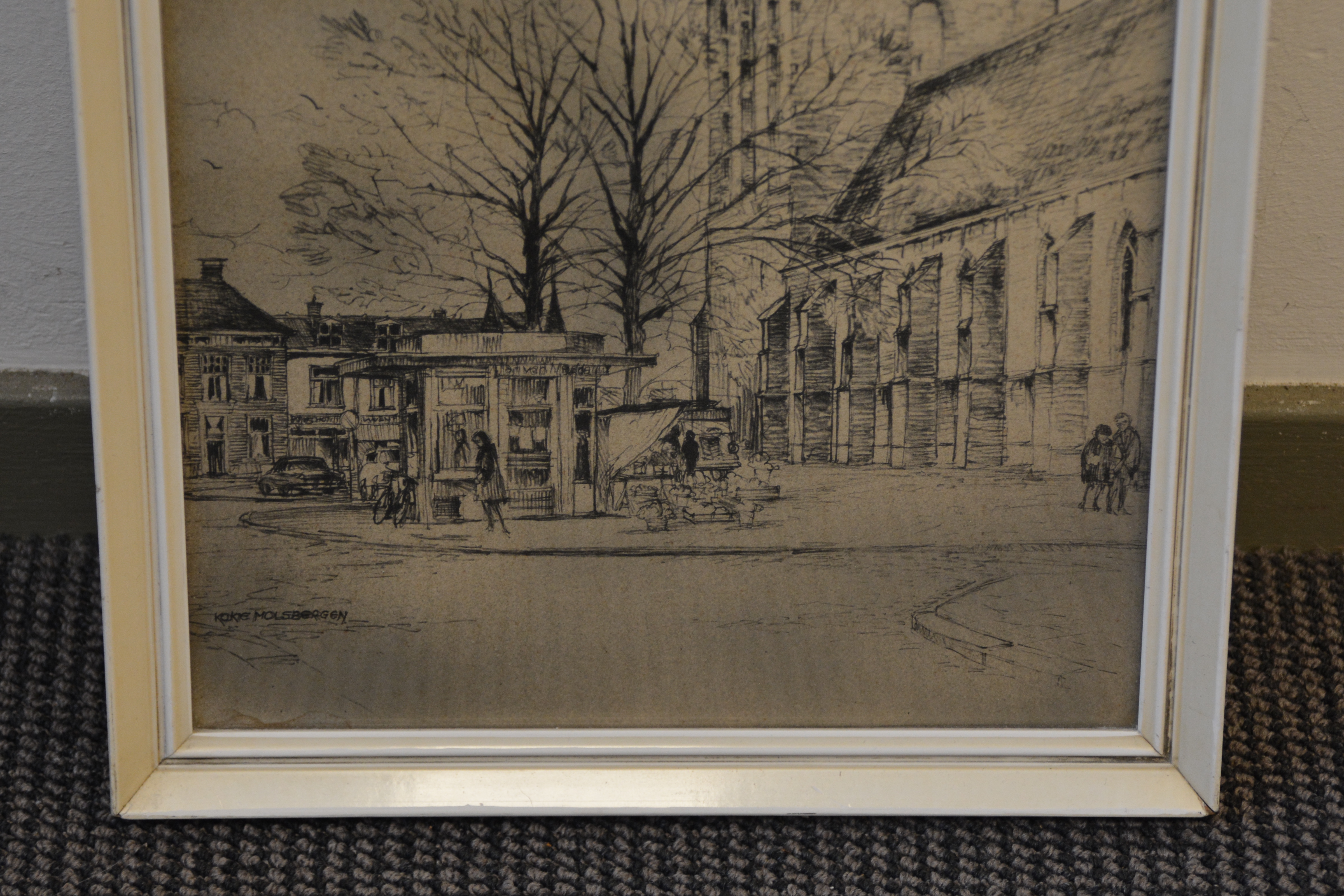 Tekening van de Meppeler Toren, ook bekend als de toren van de Grote of Mariakerk in Meppel. De Grote of Mariakerk is een belangrijk historisch beeld van de stad. Ingelijst en in goede staat. Kokie Molsbergen (geboren in Renkum op 21 januari 1915) was een Nederlandse kunstenares die bekend staat om haar gedetailleerde pentekeningen, vaak van stadsgezichten zoals Amsterdam. Ze volgde haar opleiding aan de kunstnijverheidsschool in Arnhem. Ingelijst en in goede staat.